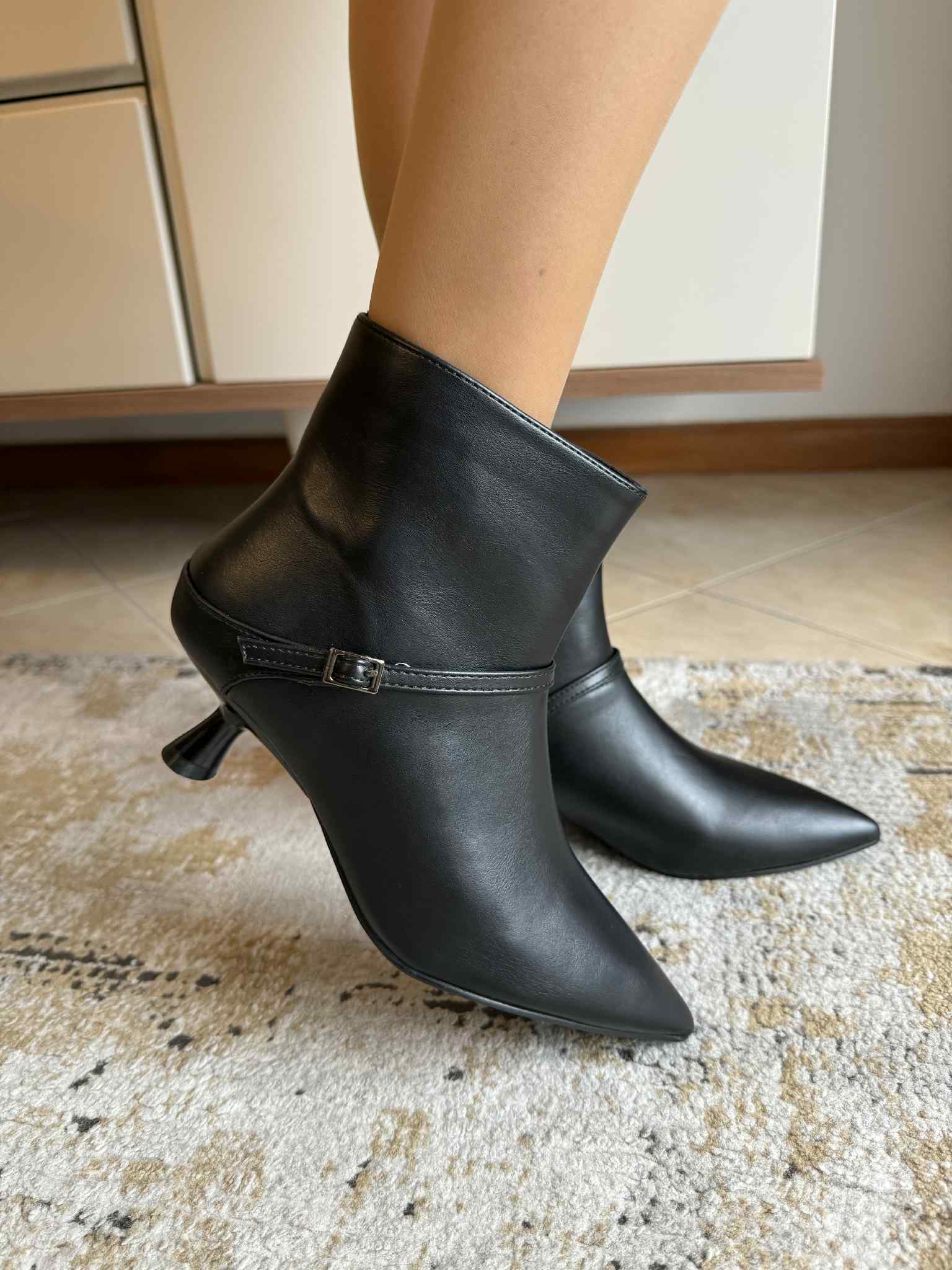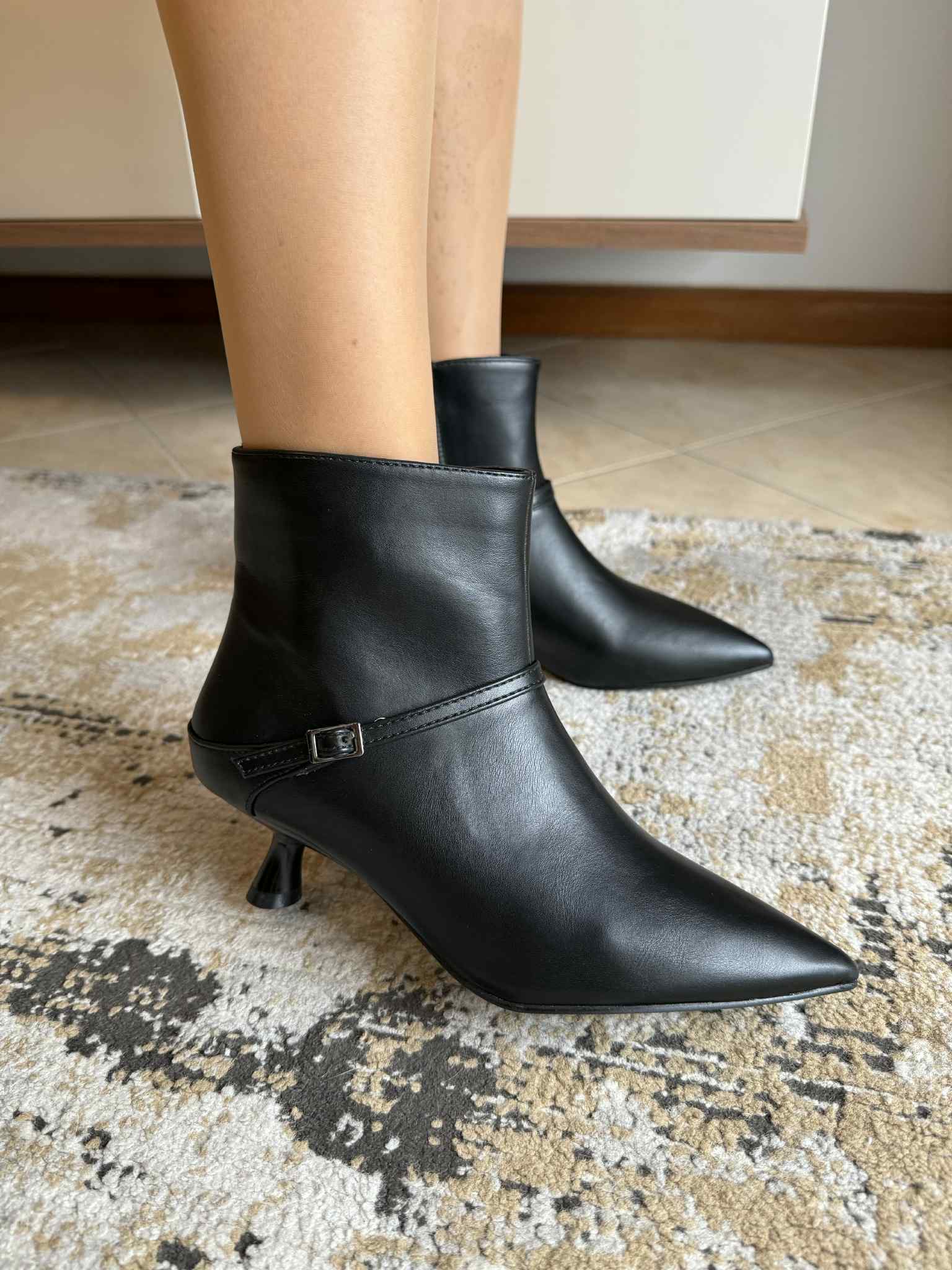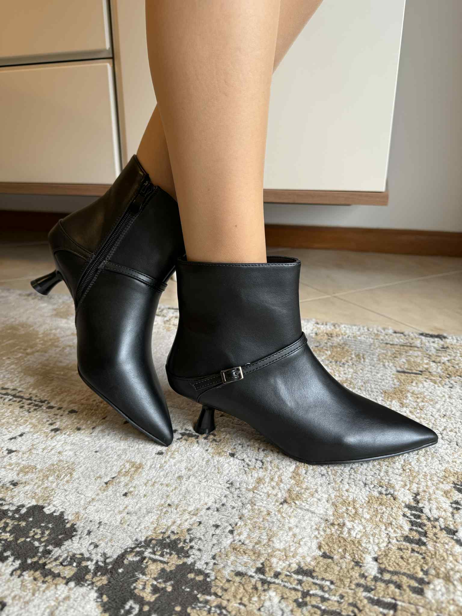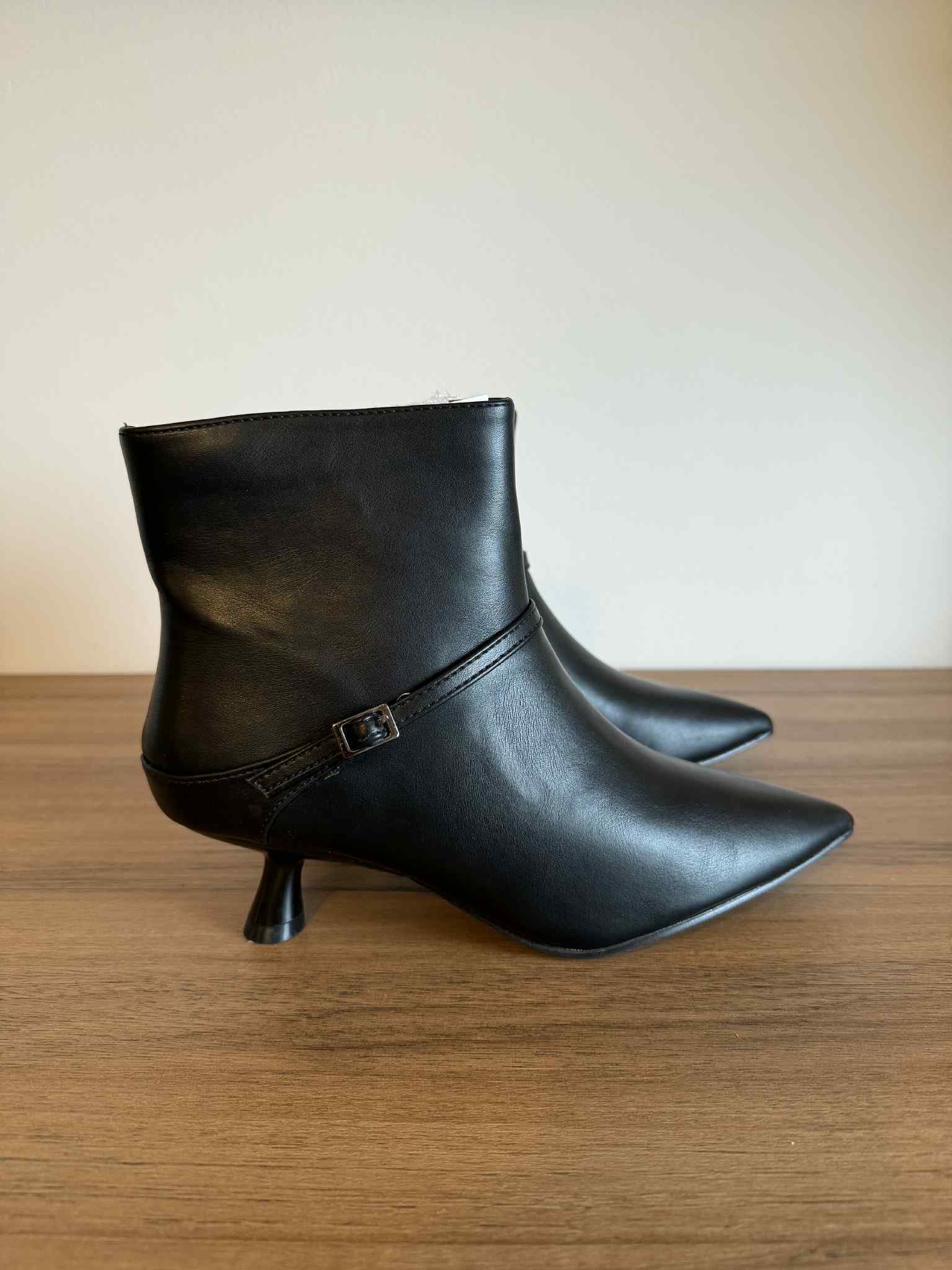 Botim feminino bicudo, em pele sintética. Com fecho. Tacão kitten, com cerca de 5cm de altura.