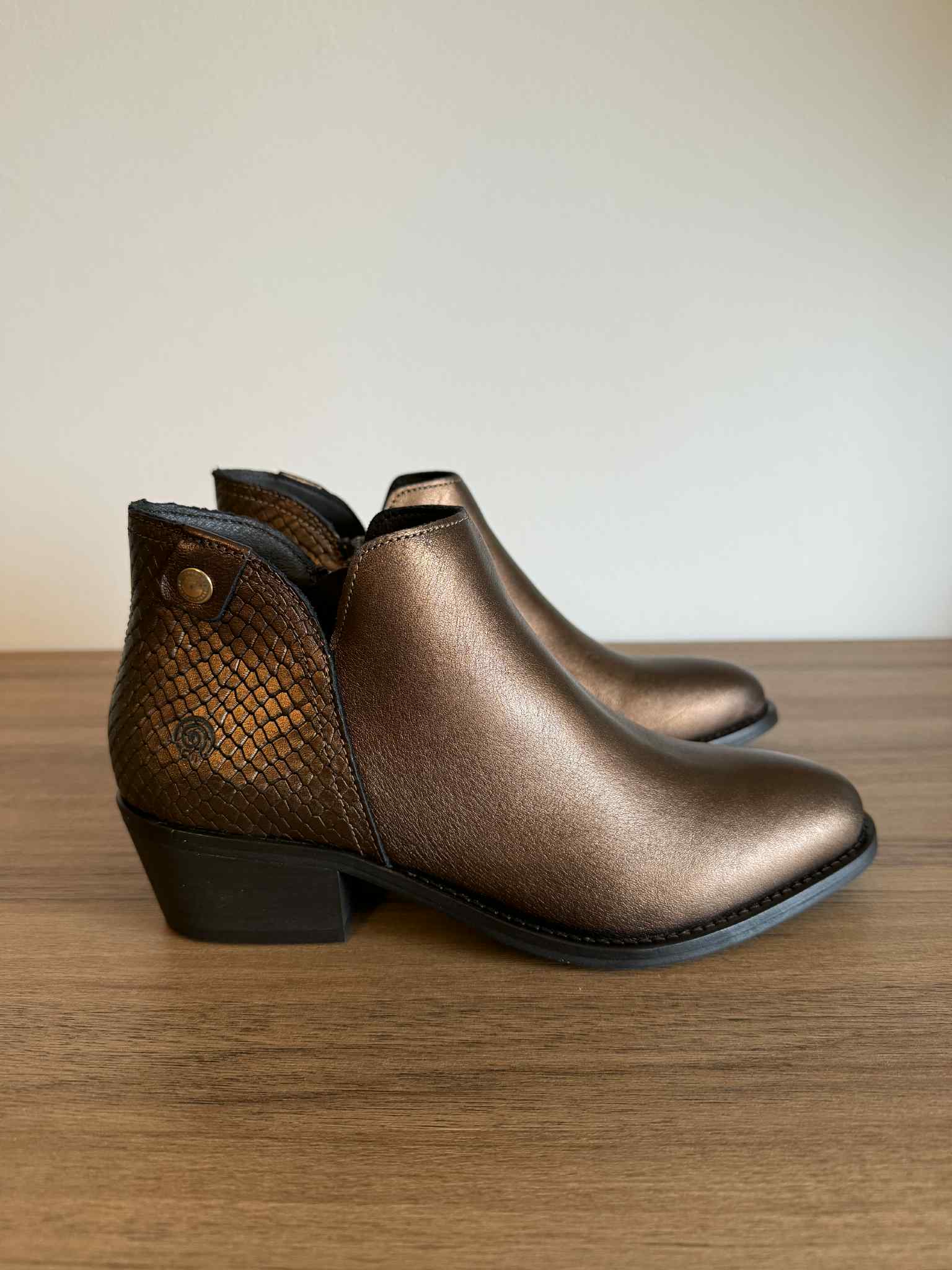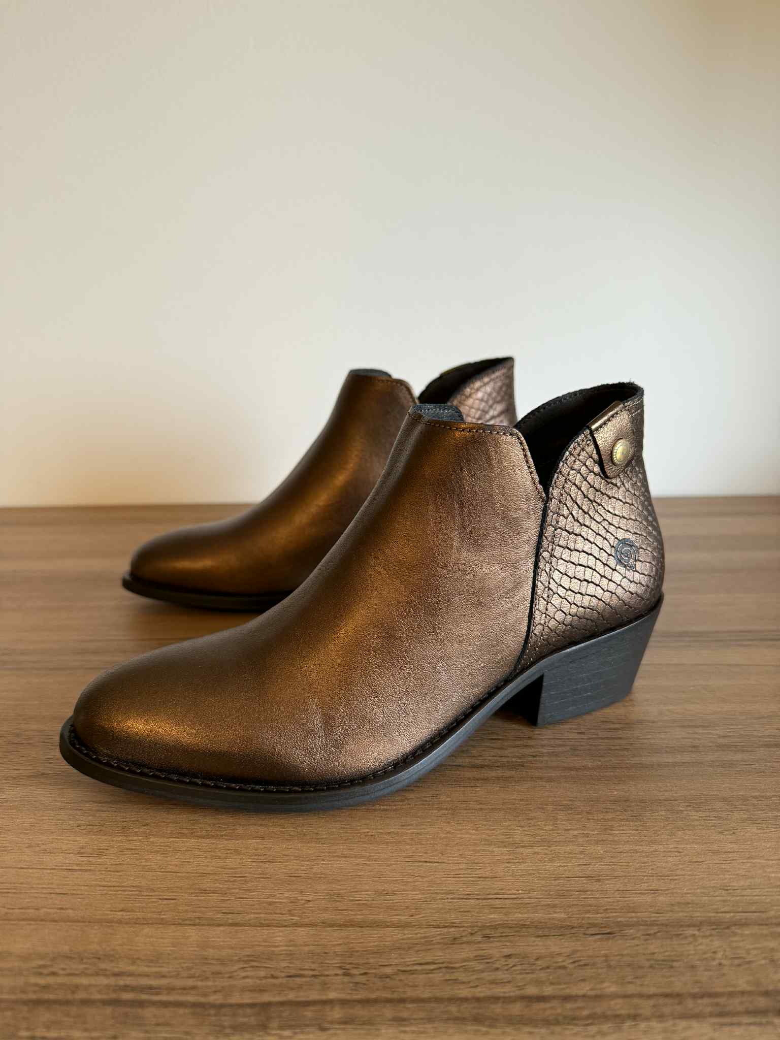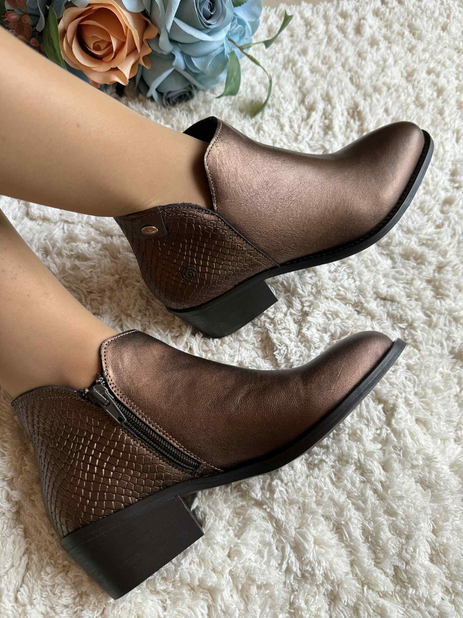 Botim da marca Oii, em pele e fabricado em Portugal. Na cor bronze. Com fecho. Tacão alto com 5cm de altura.