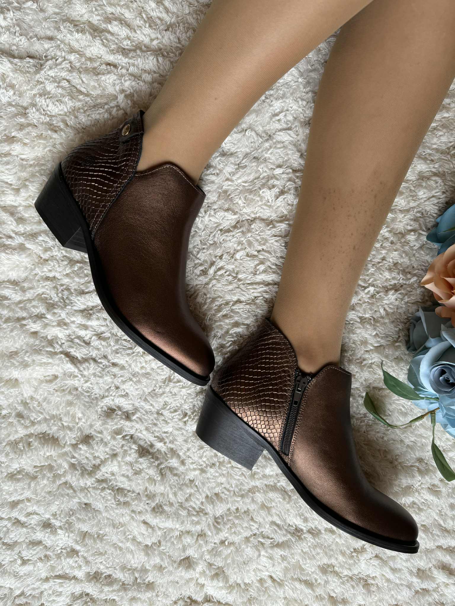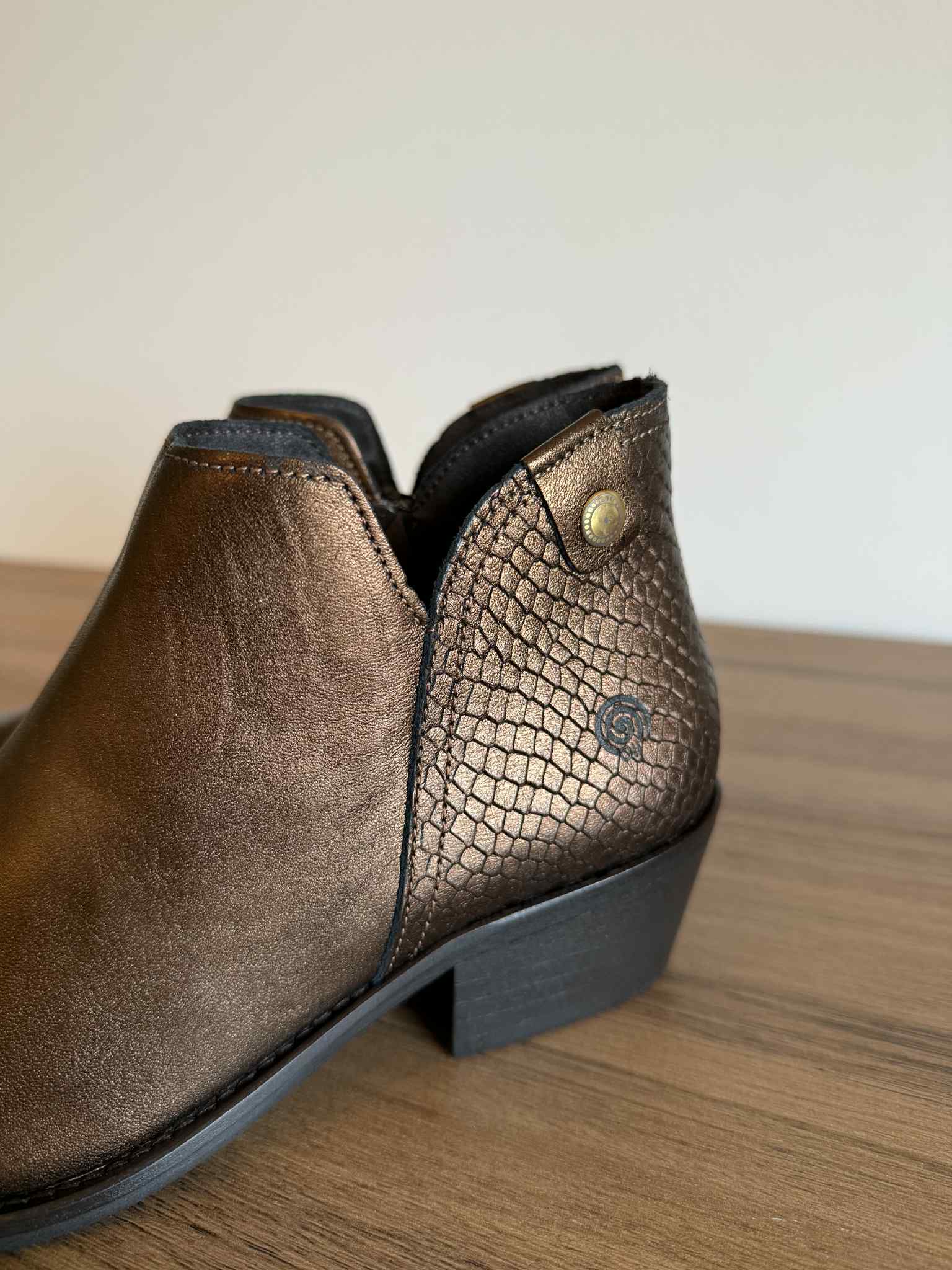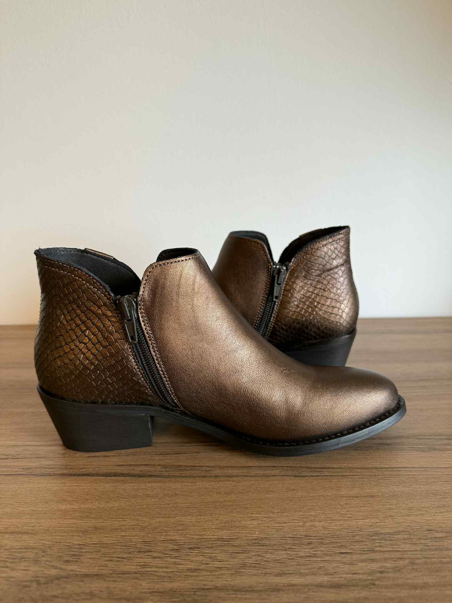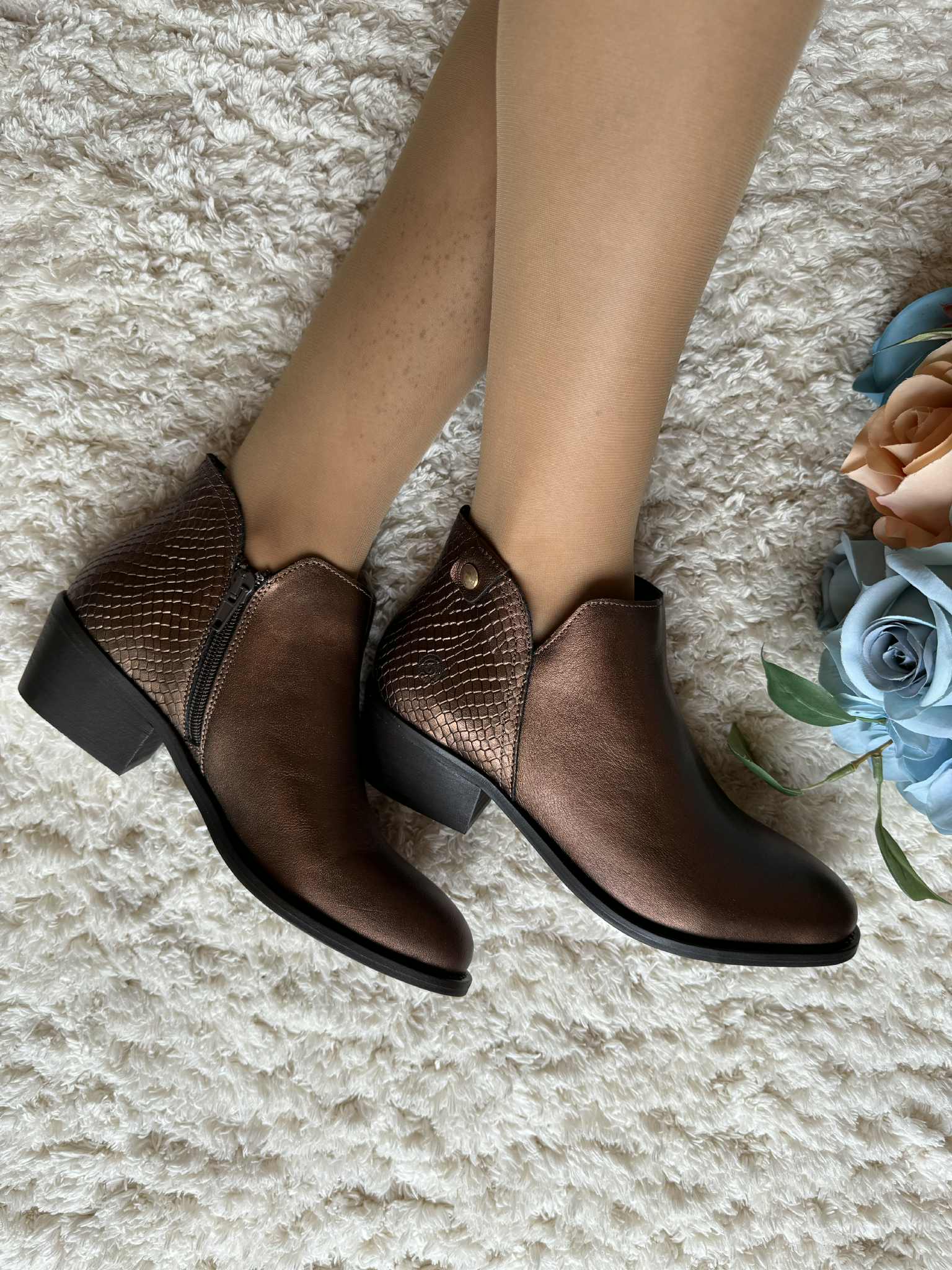 Botim da marca Oii, em pele e fabricado em Portugal. Na cor bronze. Com fecho. Tacão alto com 5cm de altura.