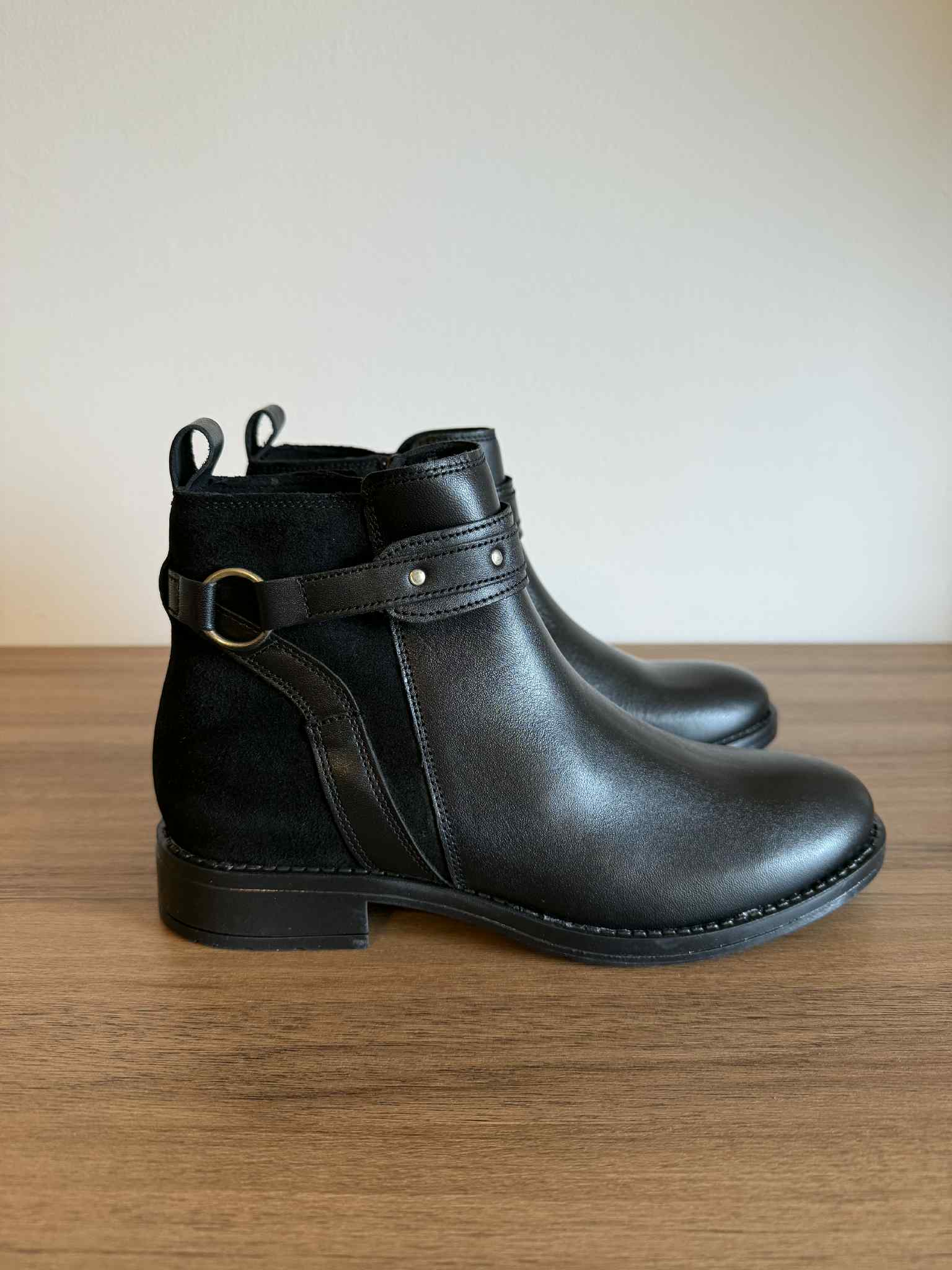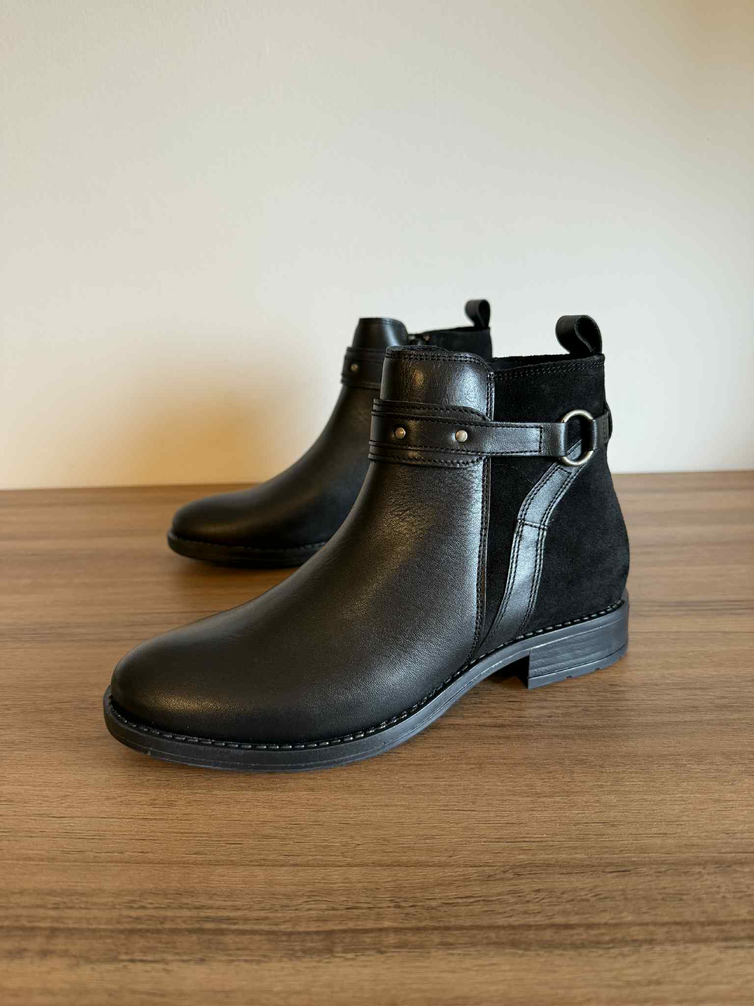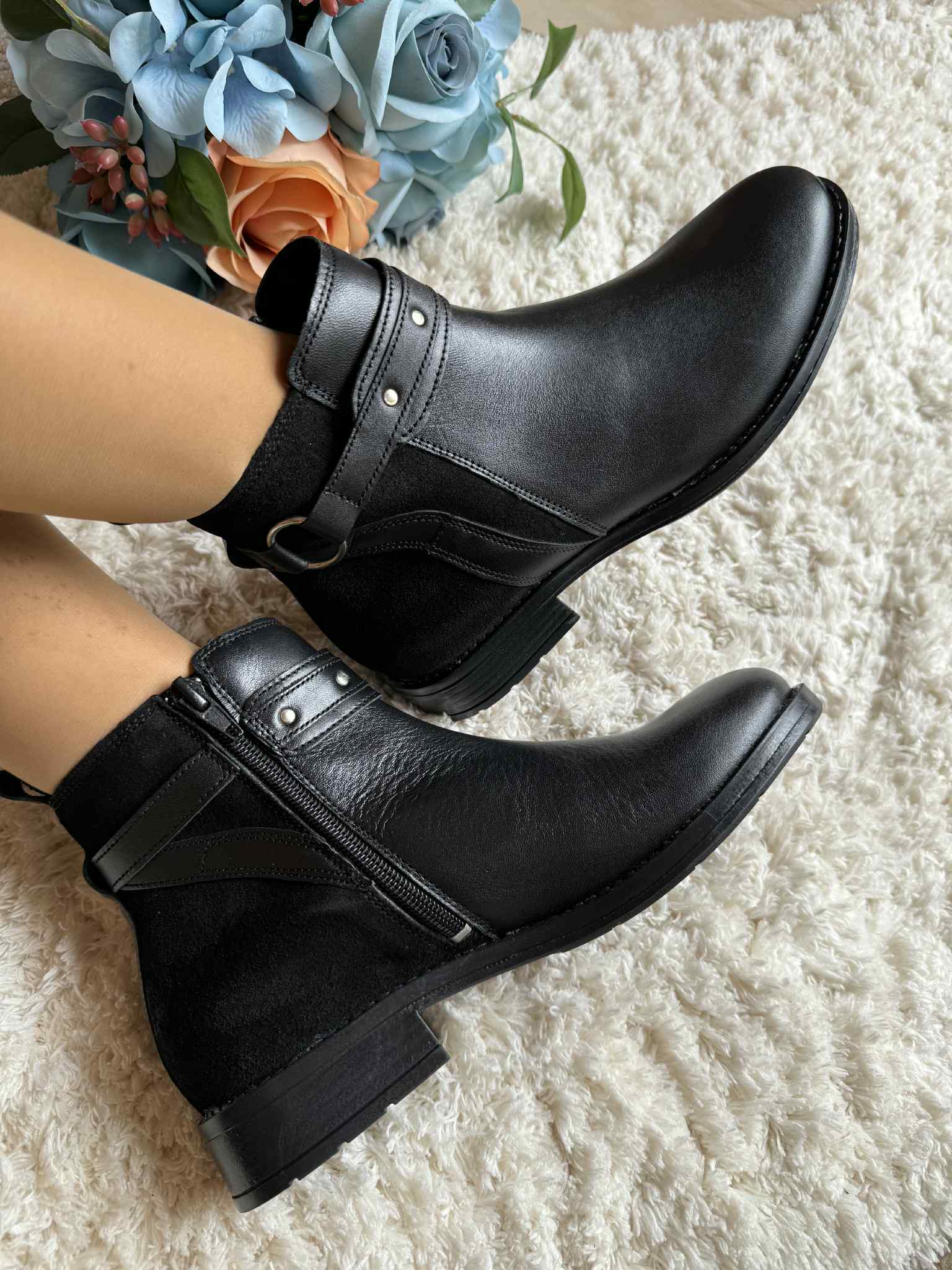 Botim da marca Innovation, em pele e fabricado em Portugal. Com fecho. Com salto raso.