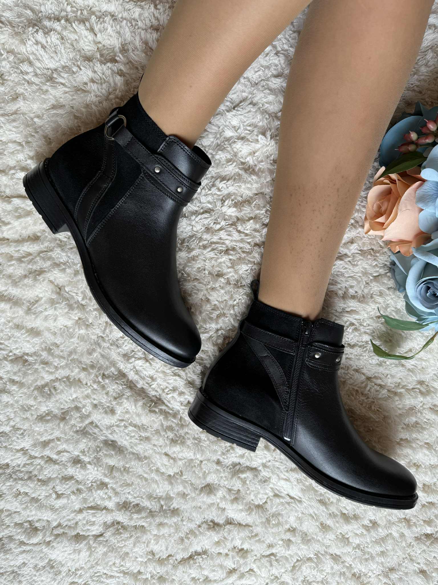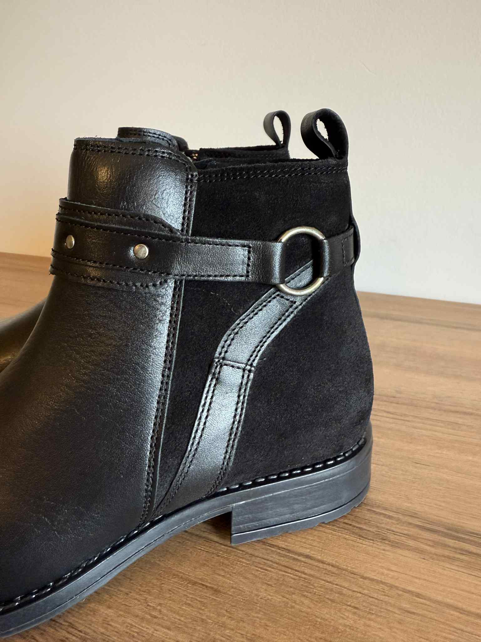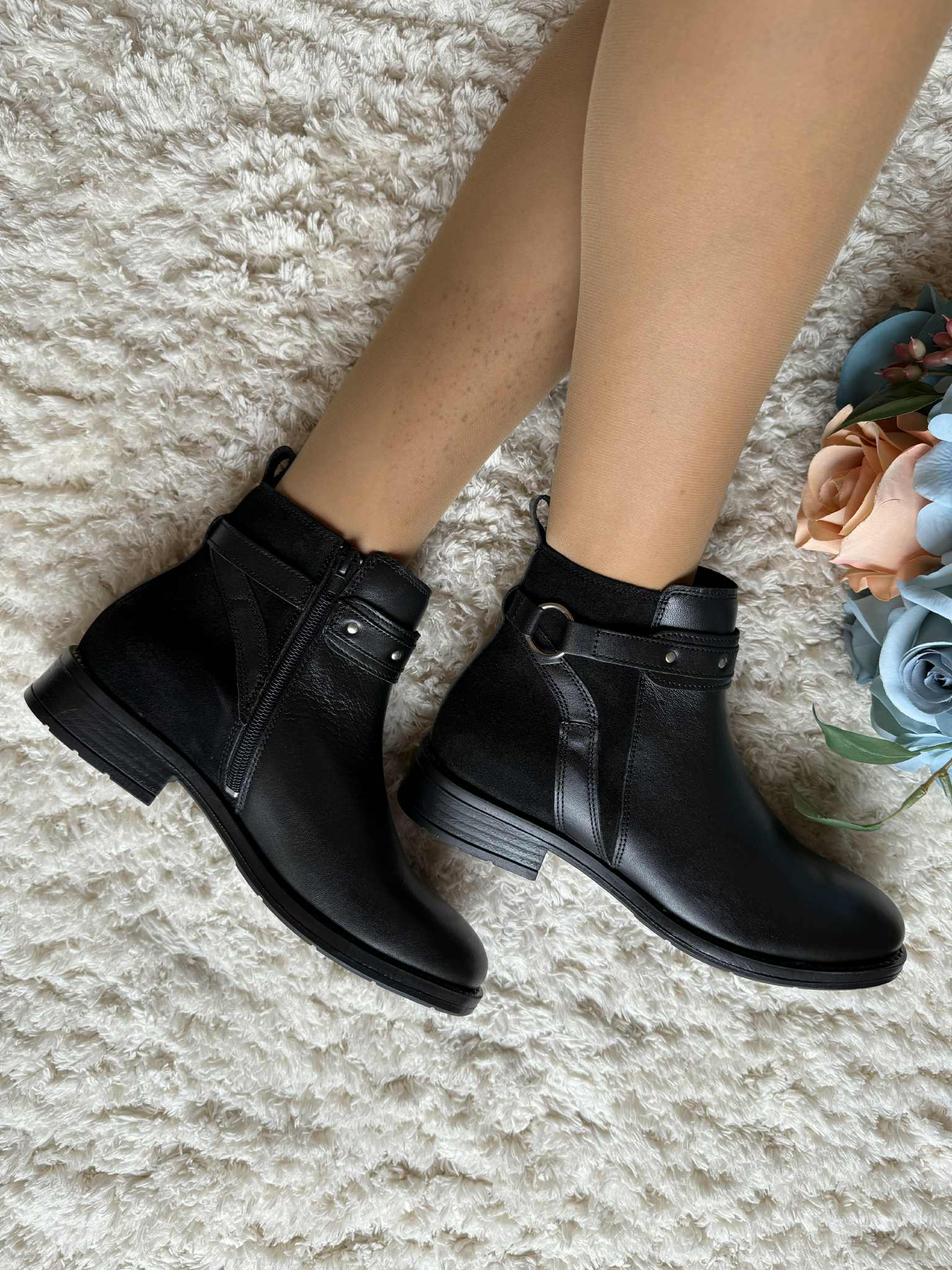 Botim da marca Innovation, em pele e fabricado em Portugal. Com fecho. Com salto raso.