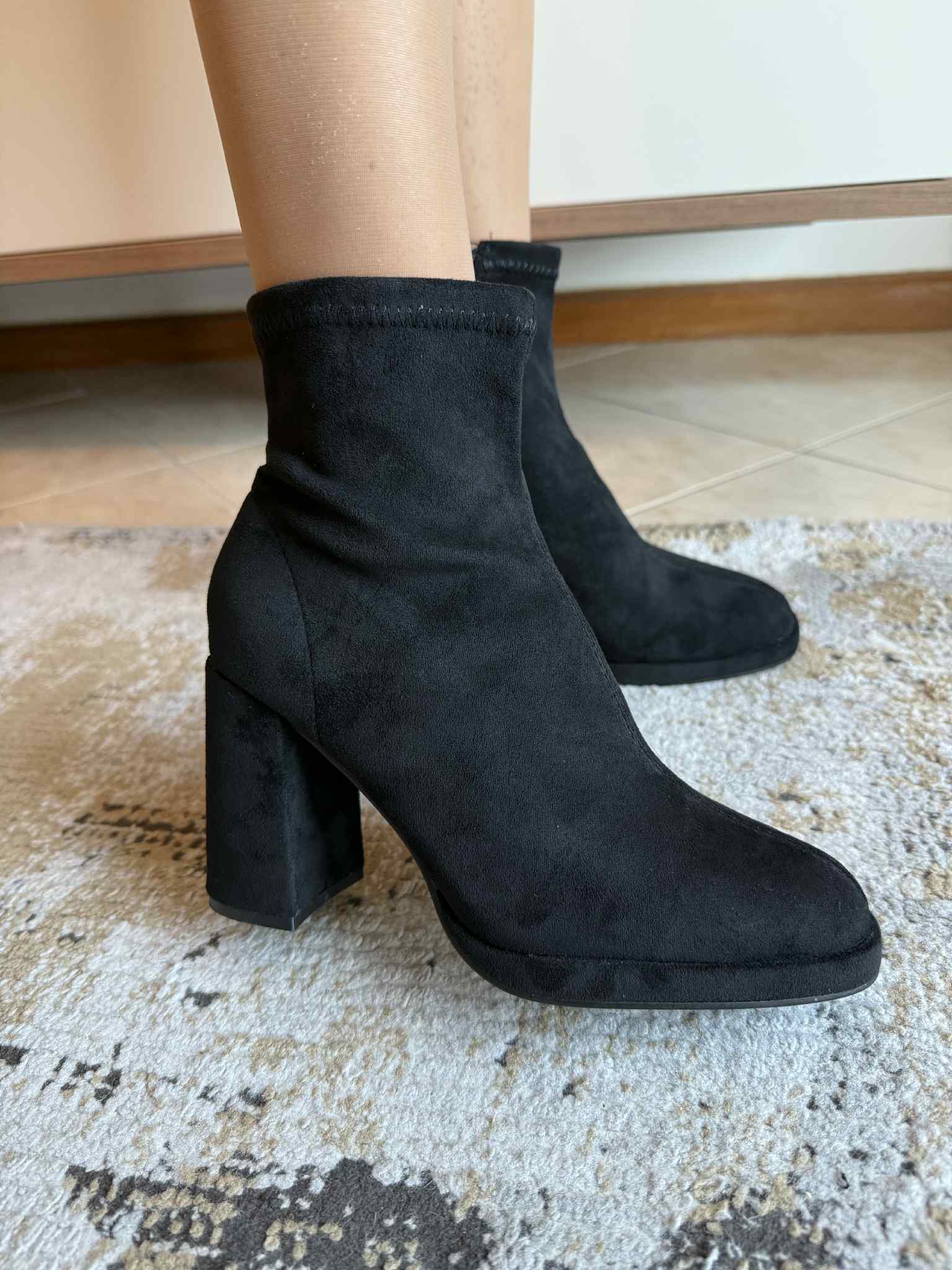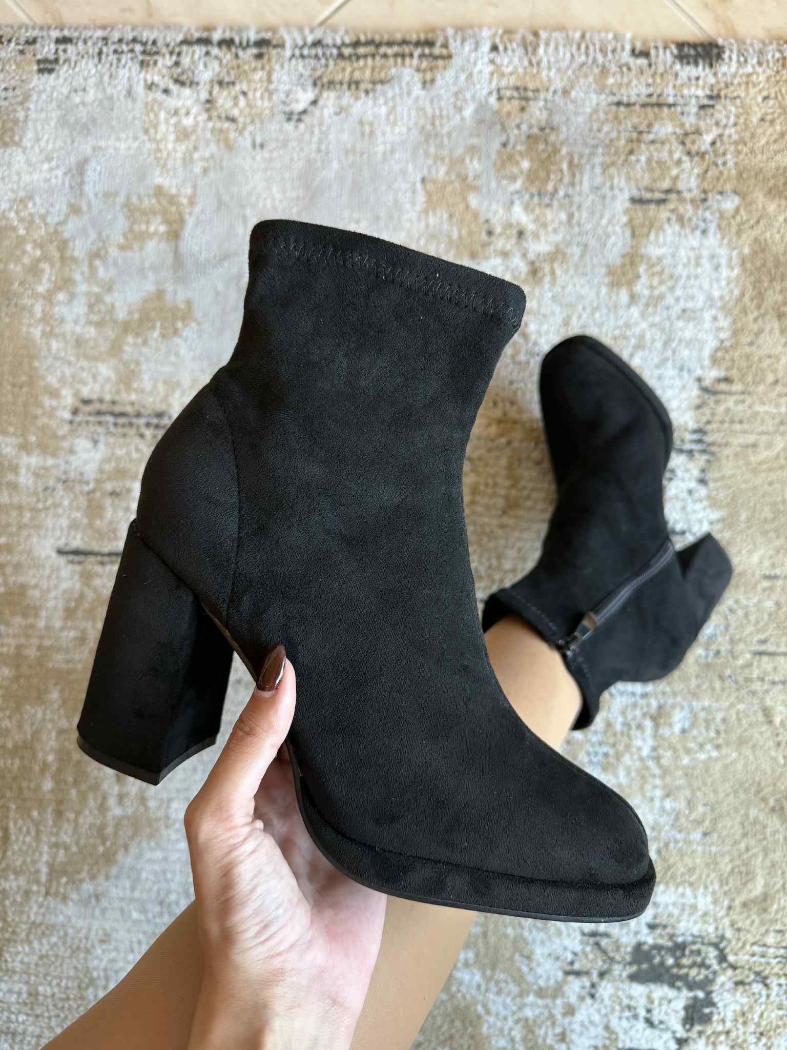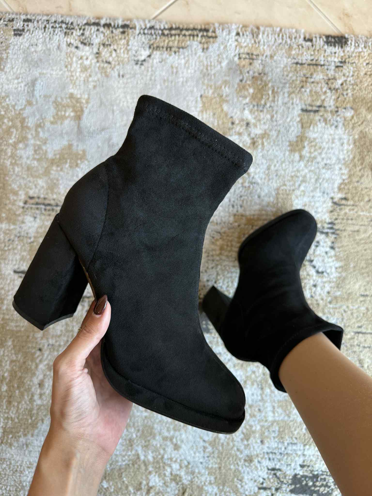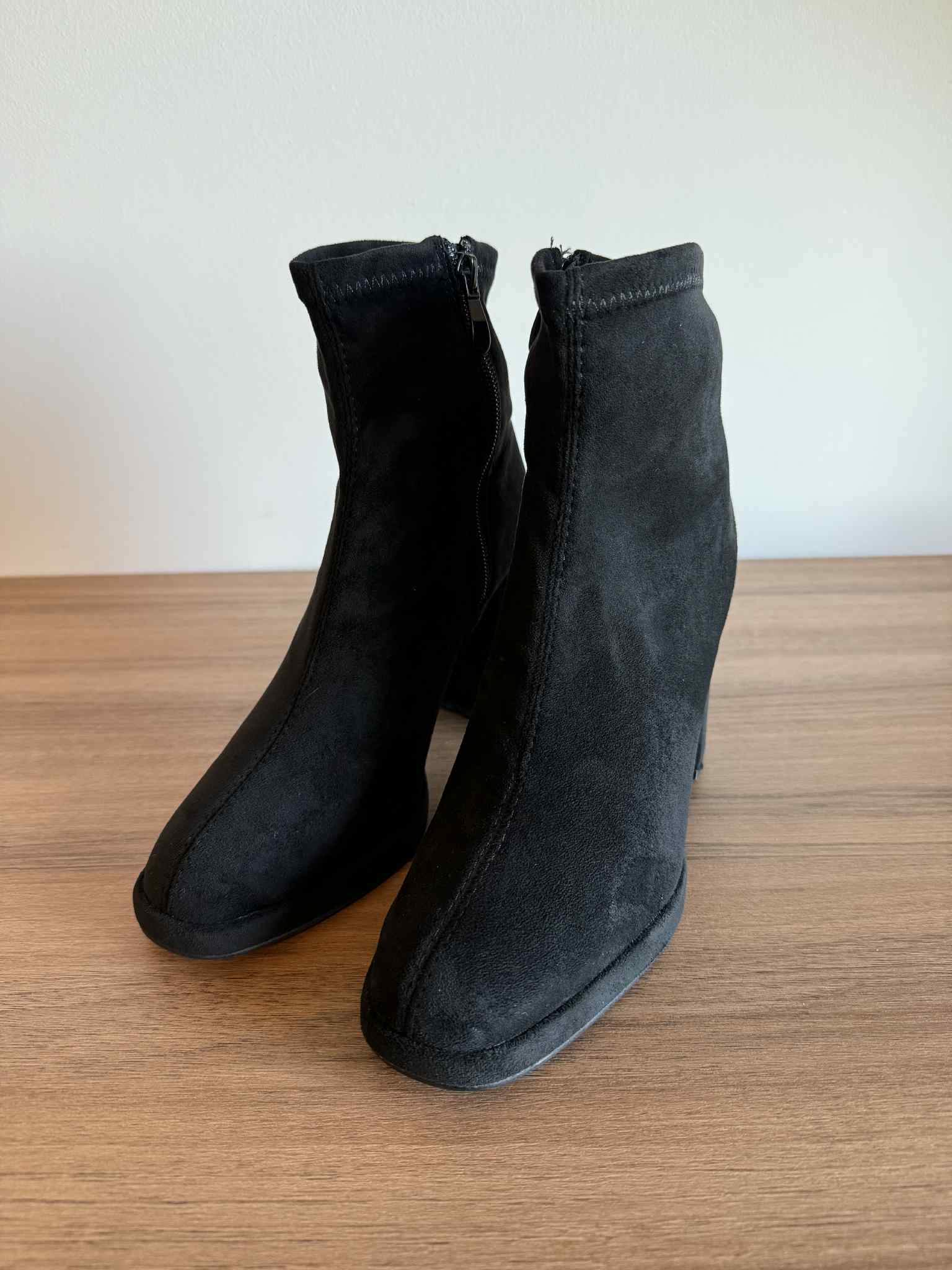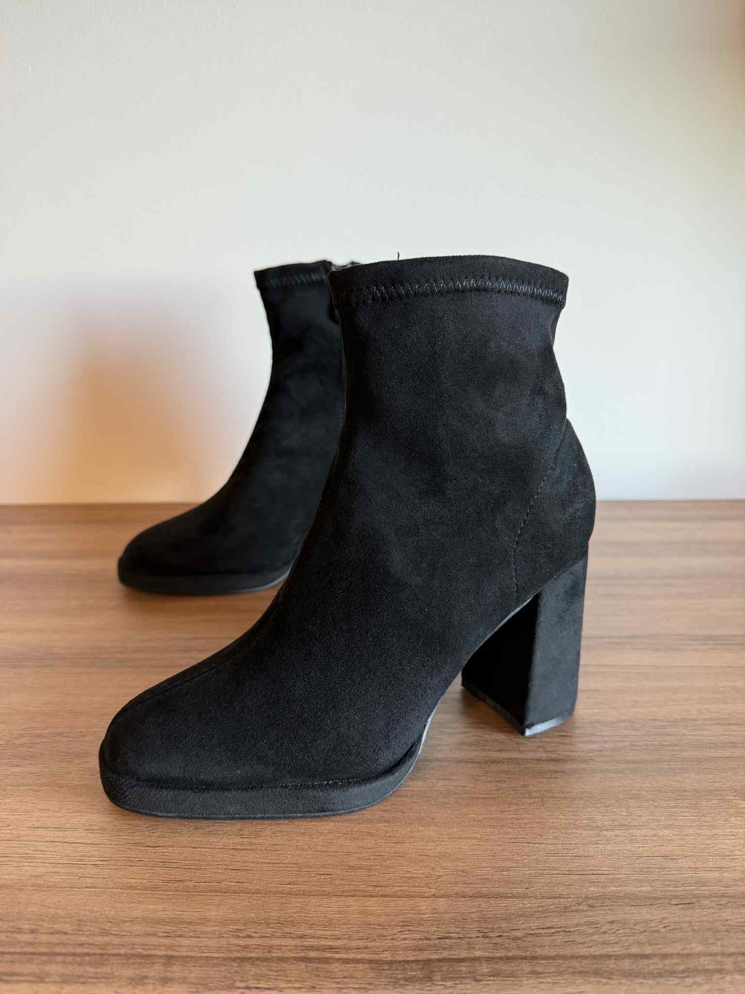 Botim feminino, em camurça sintética. Tem fecho. Tacão largo com 9cm de altura e ligeira compensação.