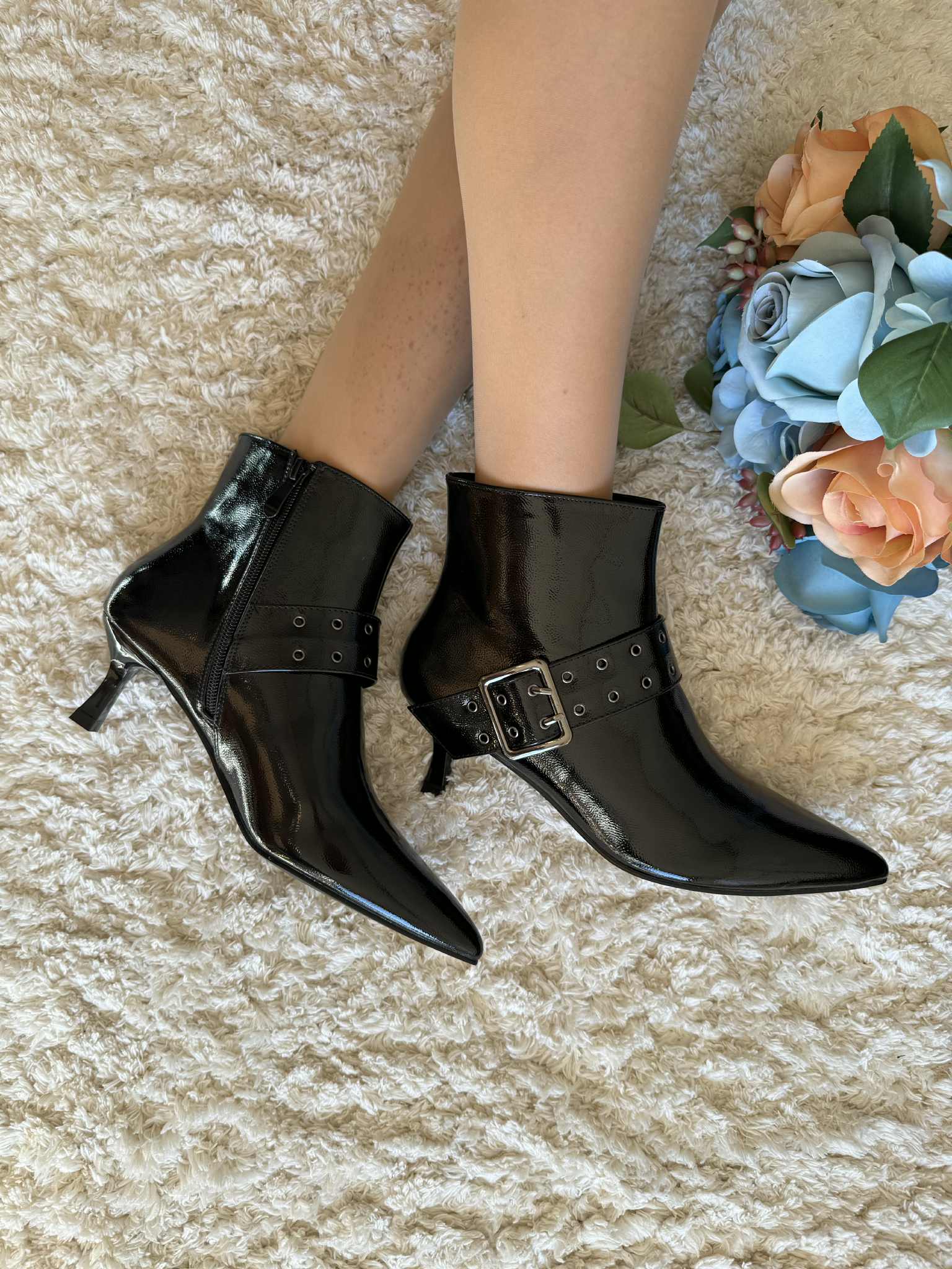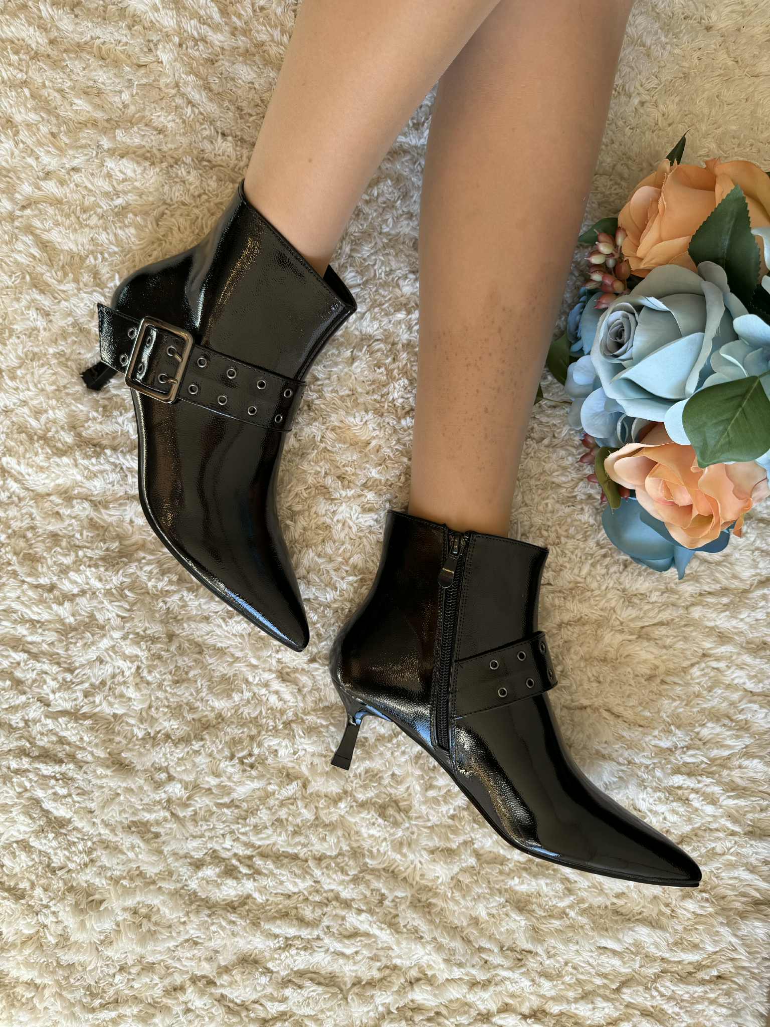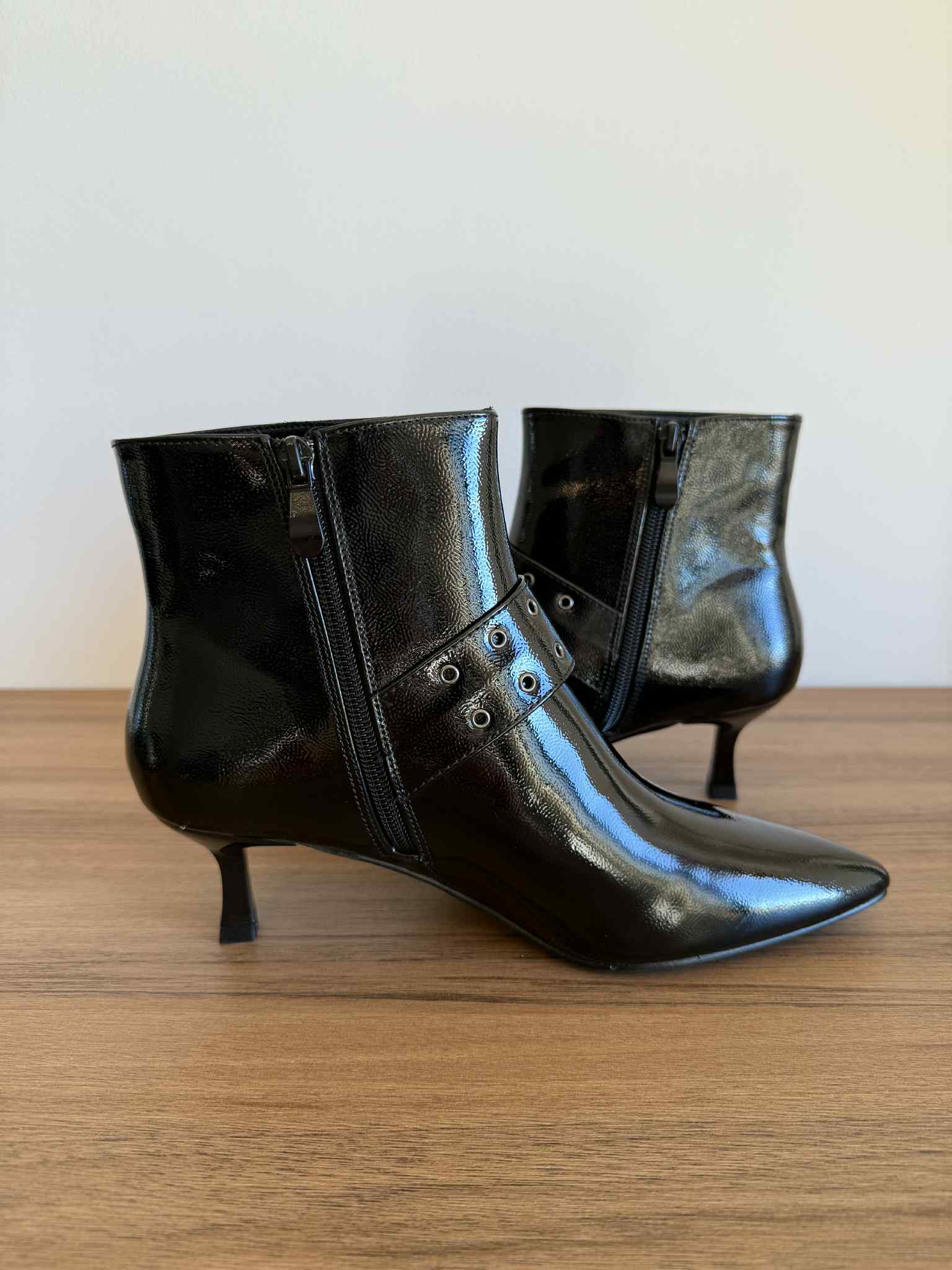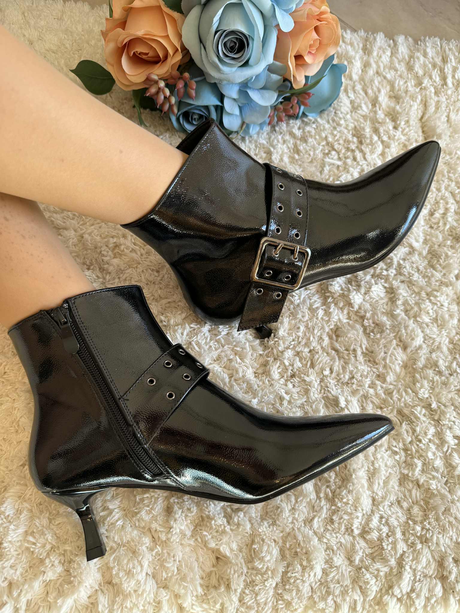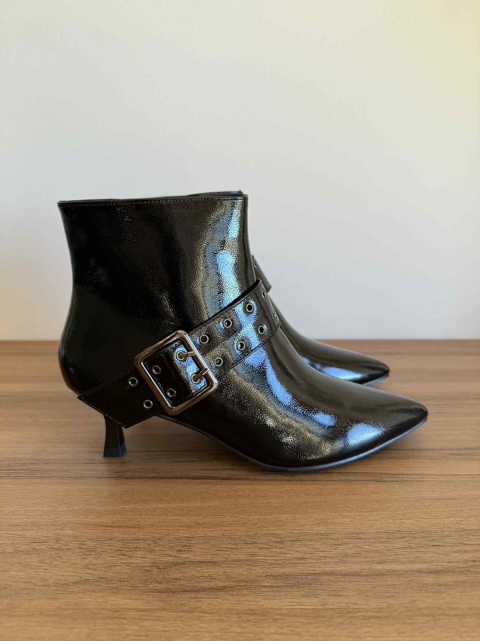 Botim em pele sintética envernizada, com fecho. Tacão kitten, fino e com apenas 5 cm de altura.