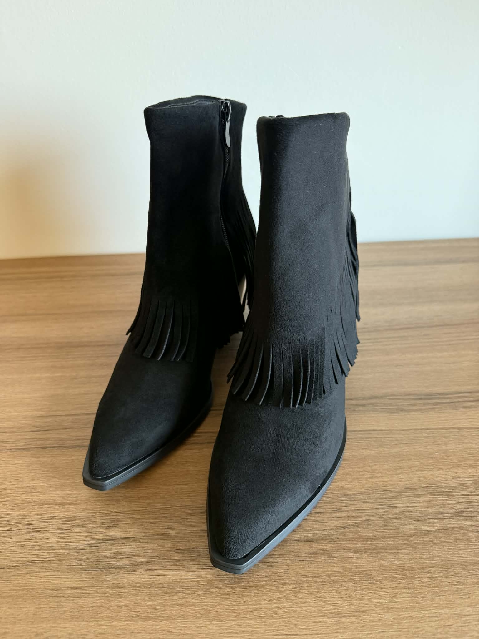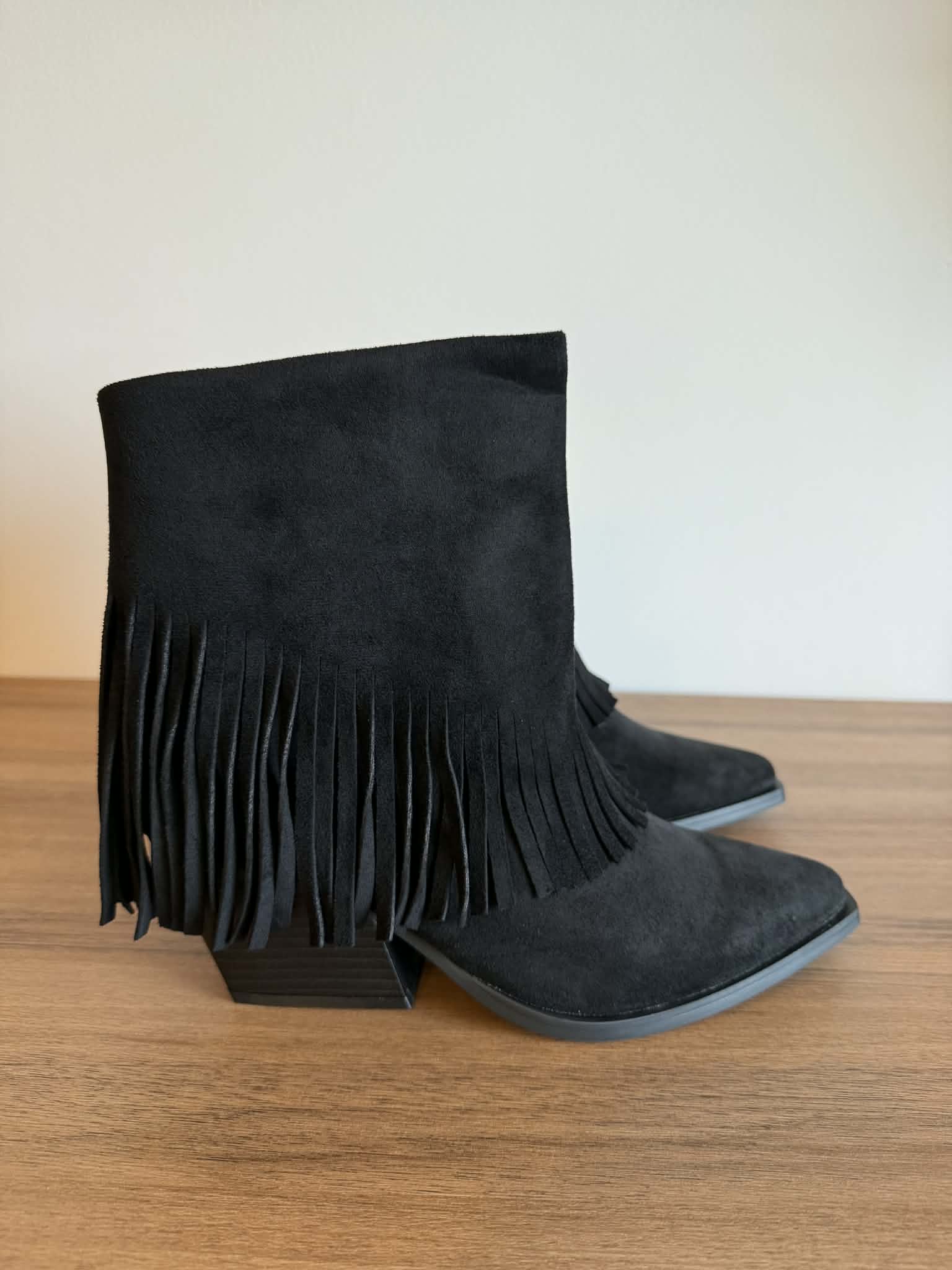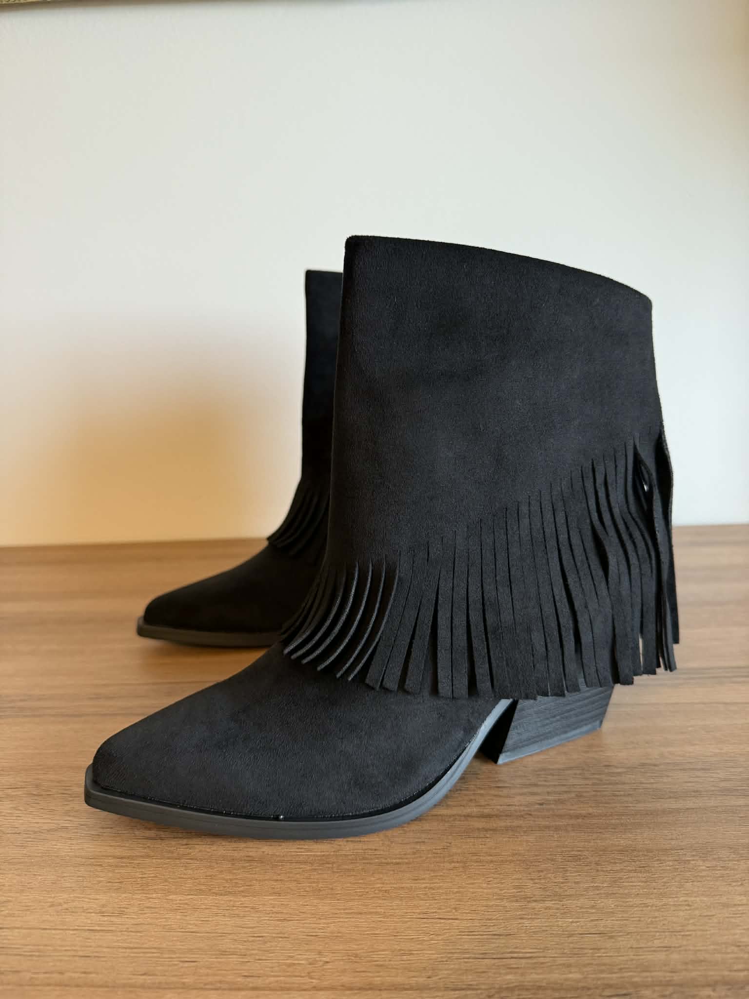 Botim estilo texana. Com frente bicuda. Em camurça sintética. Detalhe ‘fold’ com franjinhas. Tacão largo com 6cm de altura. Tem fecho.