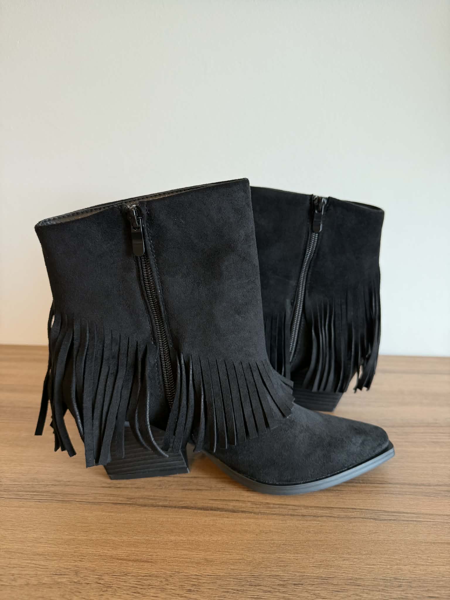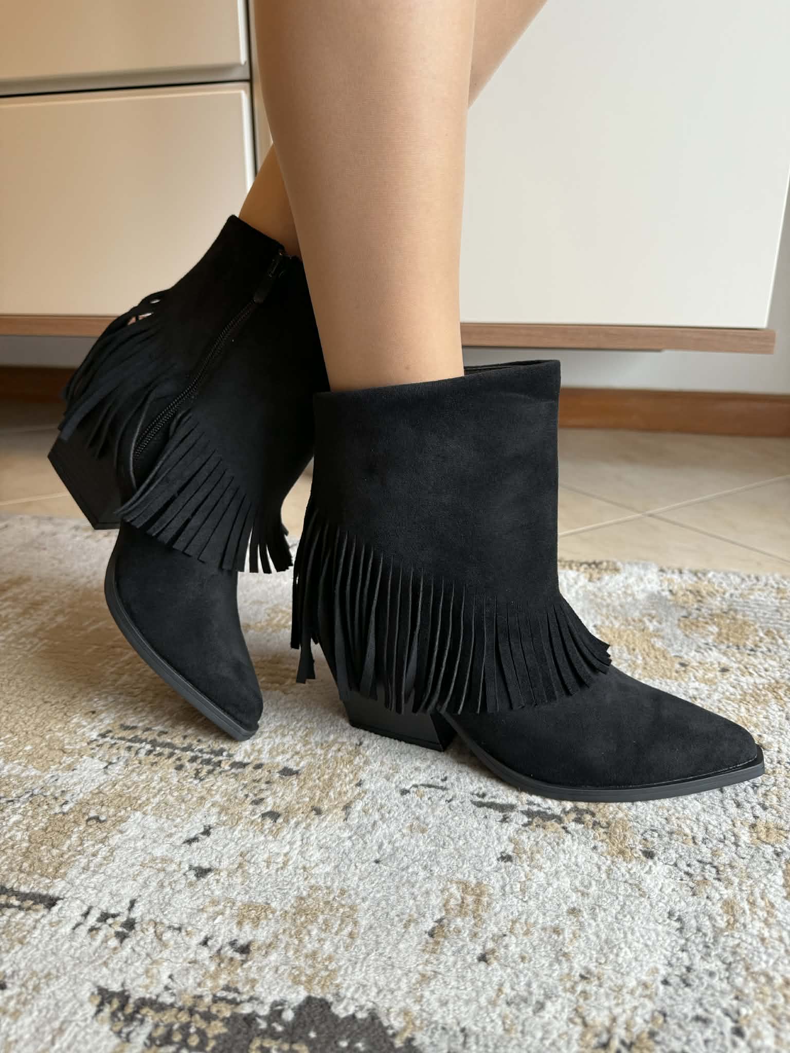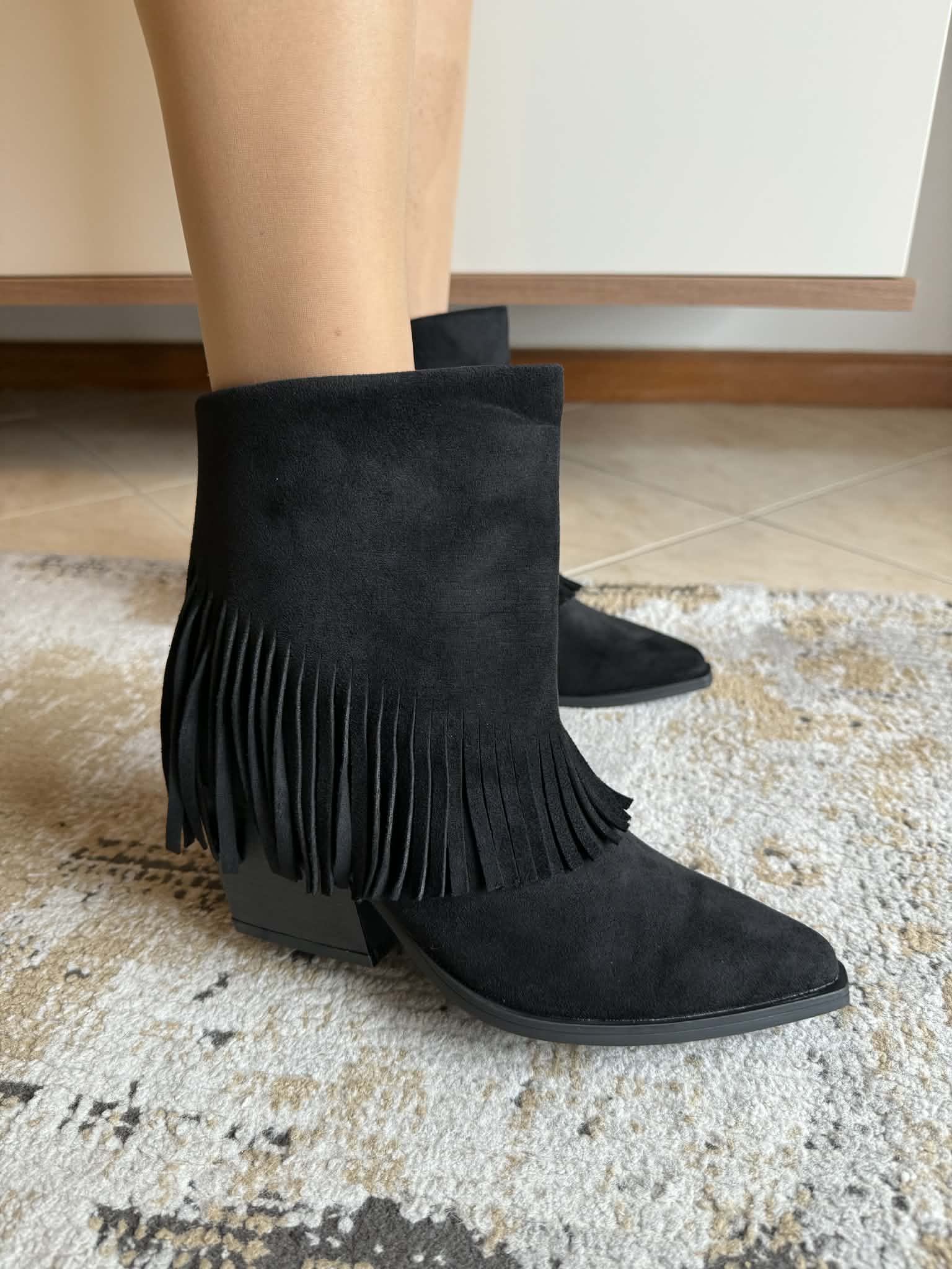 Botim estilo texana. Com frente bicuda. Em camurça sintética. Detalhe ‘fold’ com franjinhas. Tacão largo com 6cm de altura. Tem fecho.