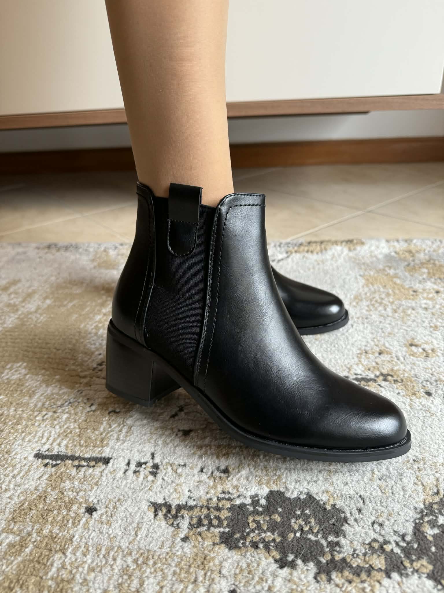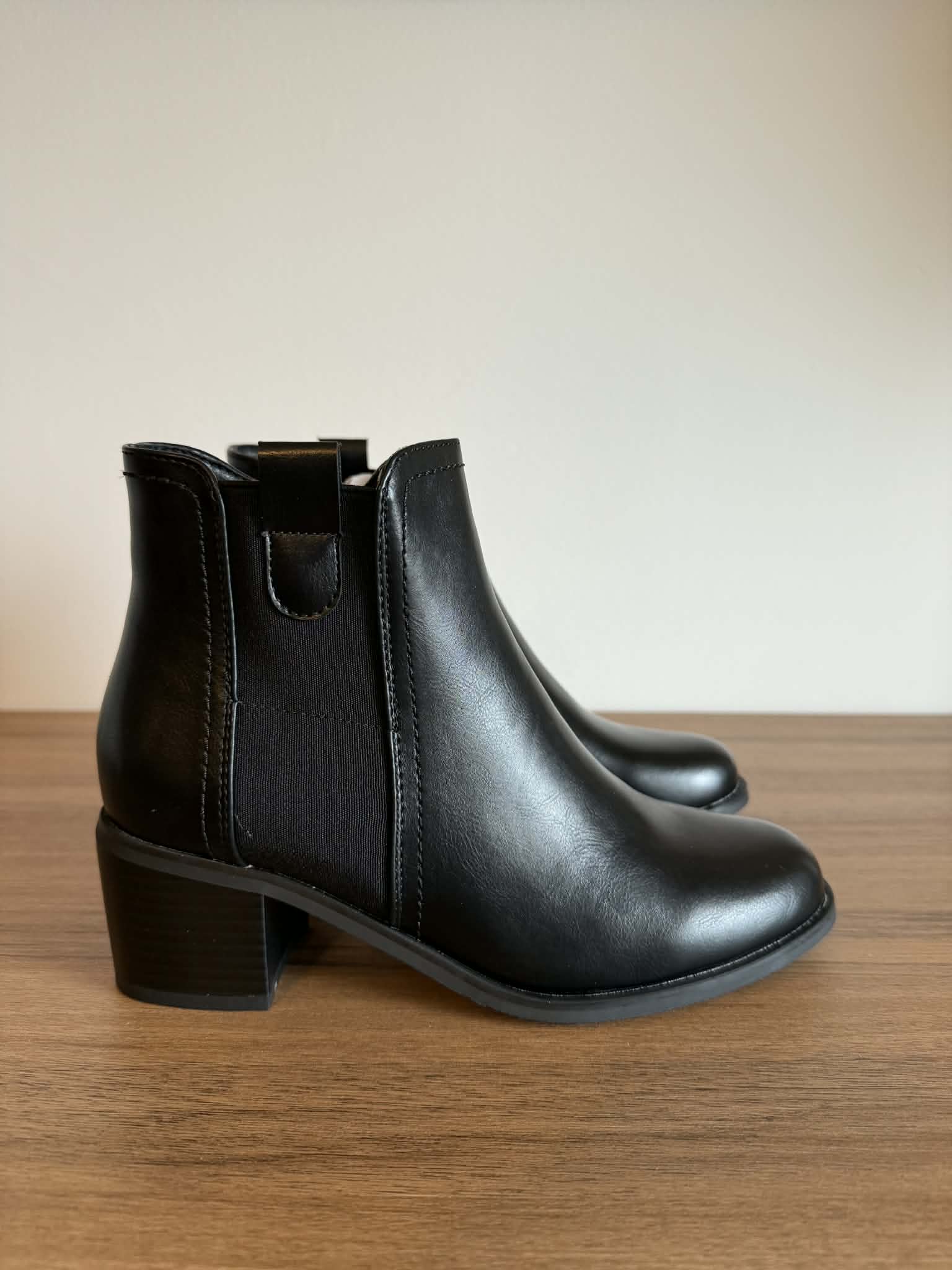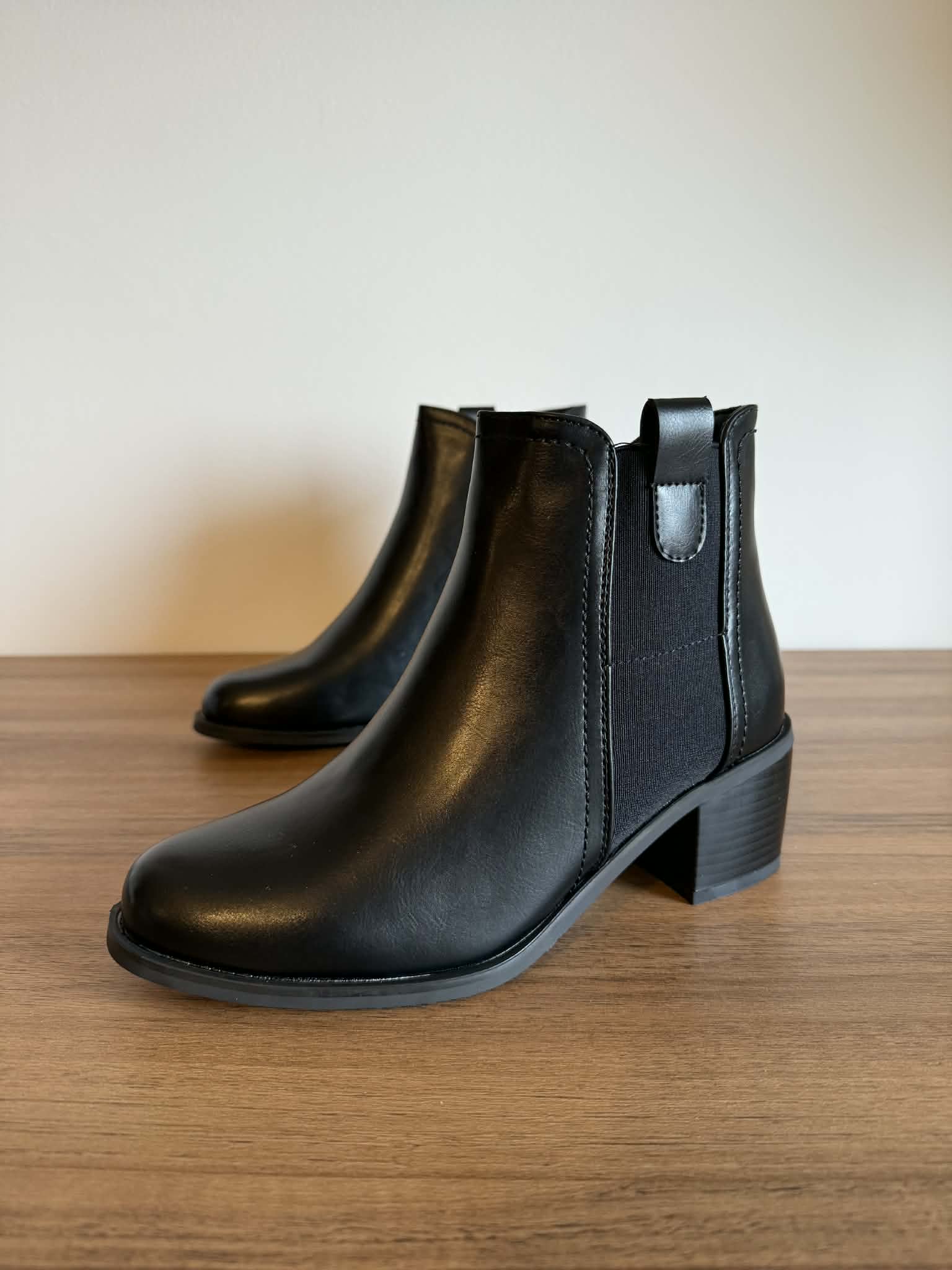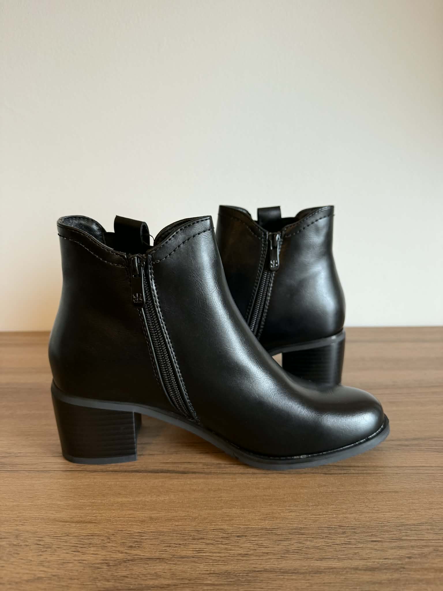 Botim feminino, em pele sintética. Com fecho e elástico. Tacão largo com cerca de 5cm de altura.