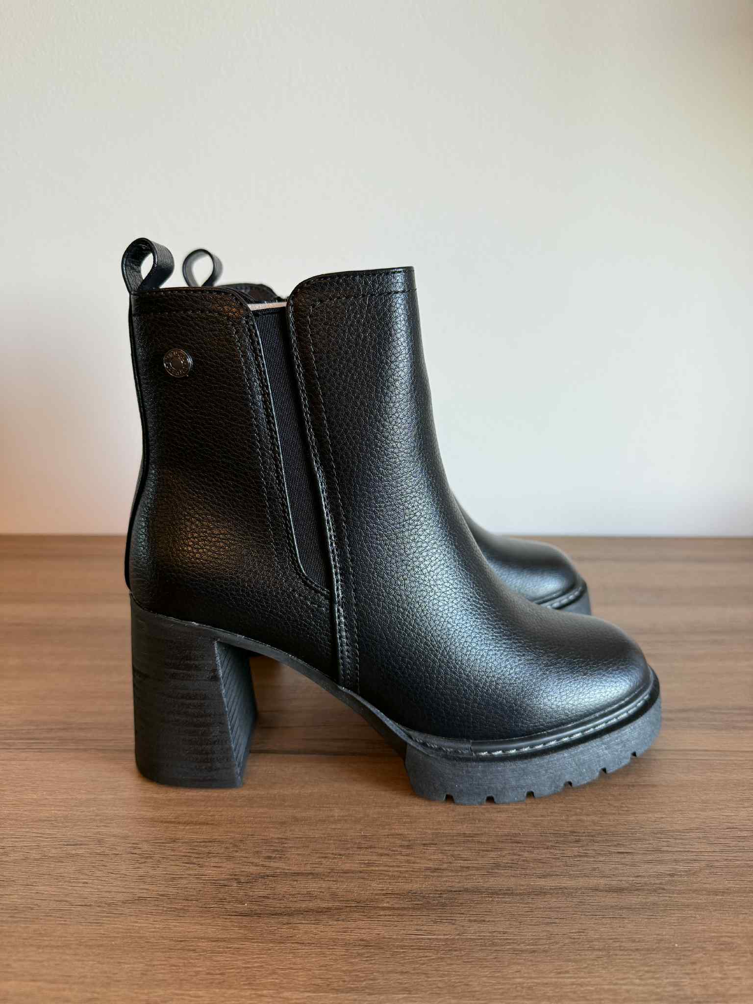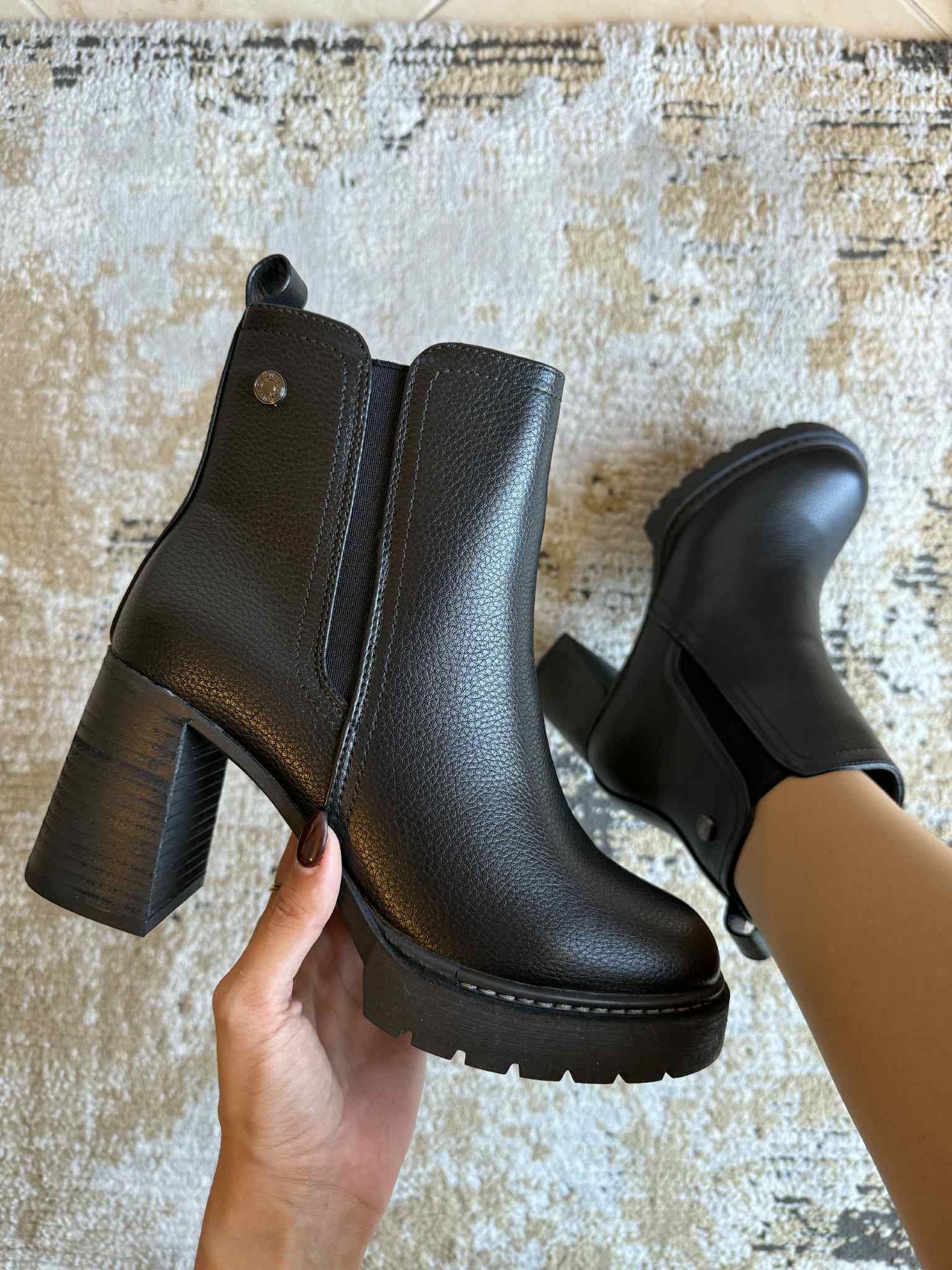 Botim da marca Virucci, com salto alto, largo, de 8cm de altura. Com compensação. Tem fecho.