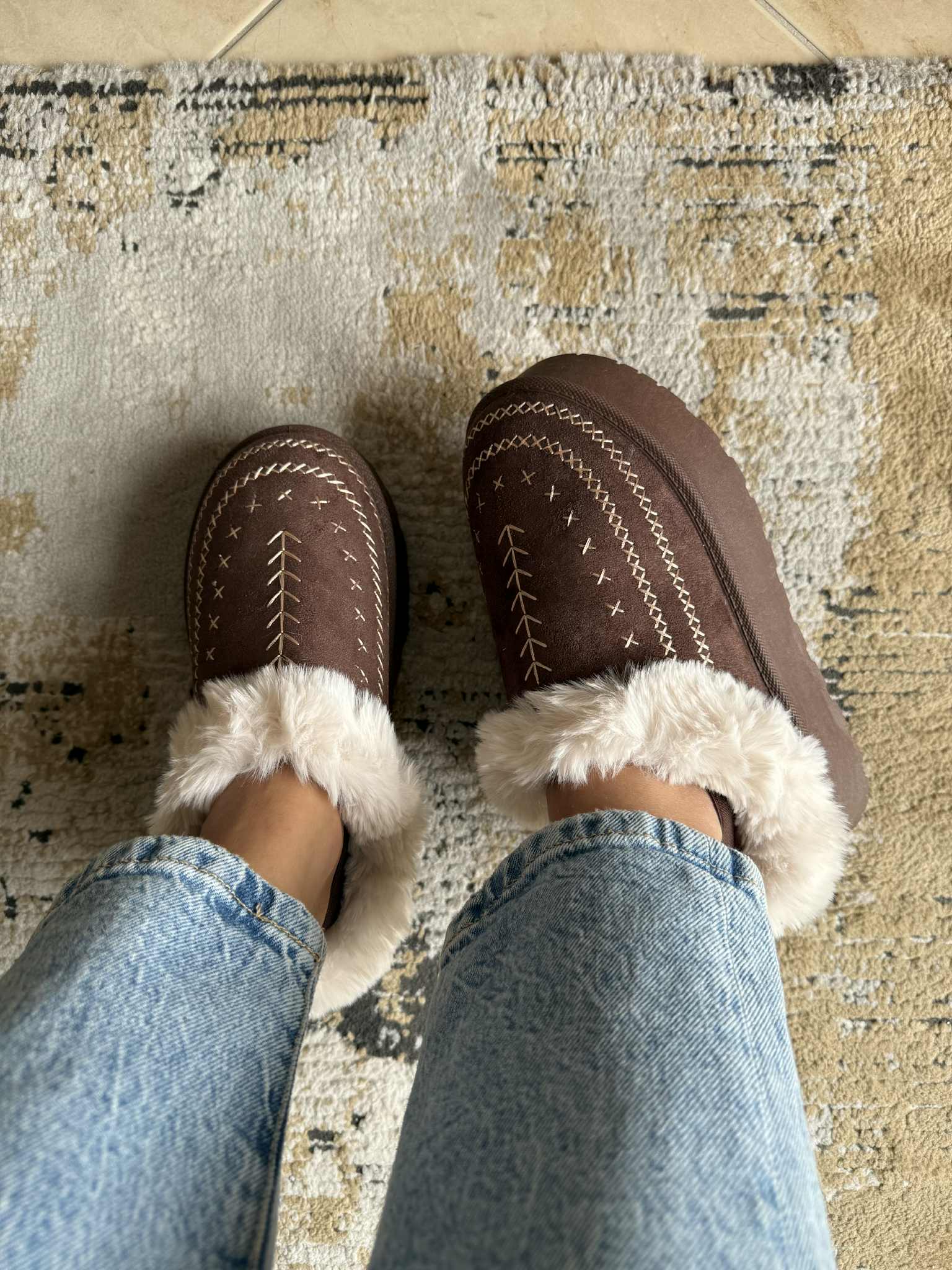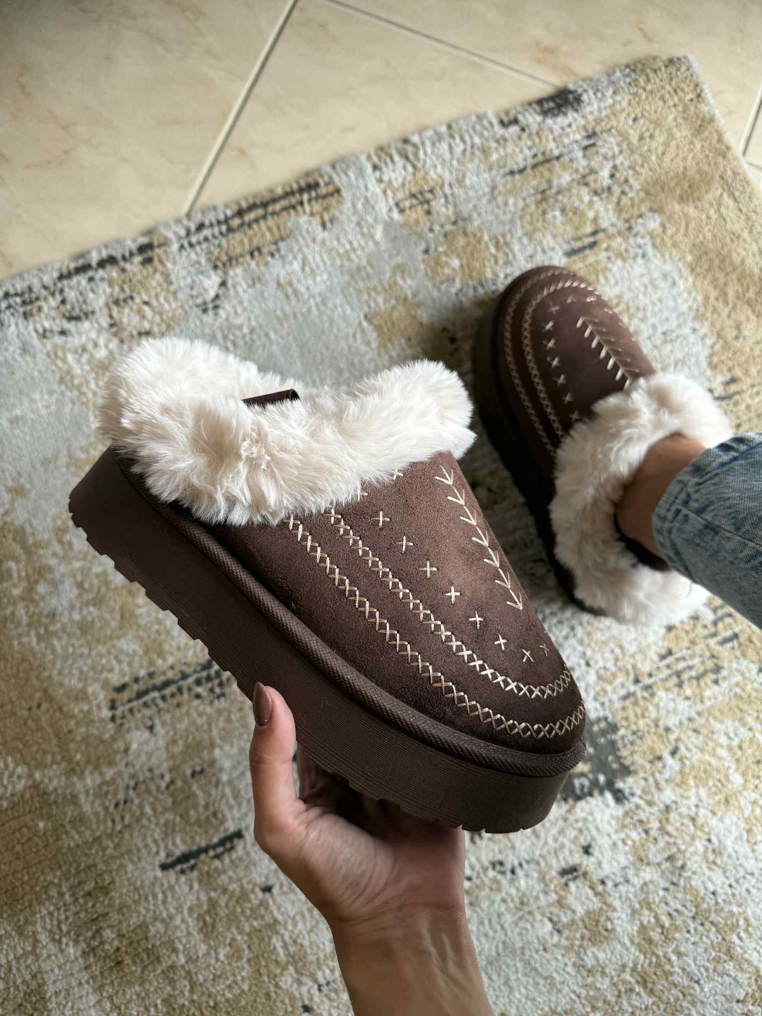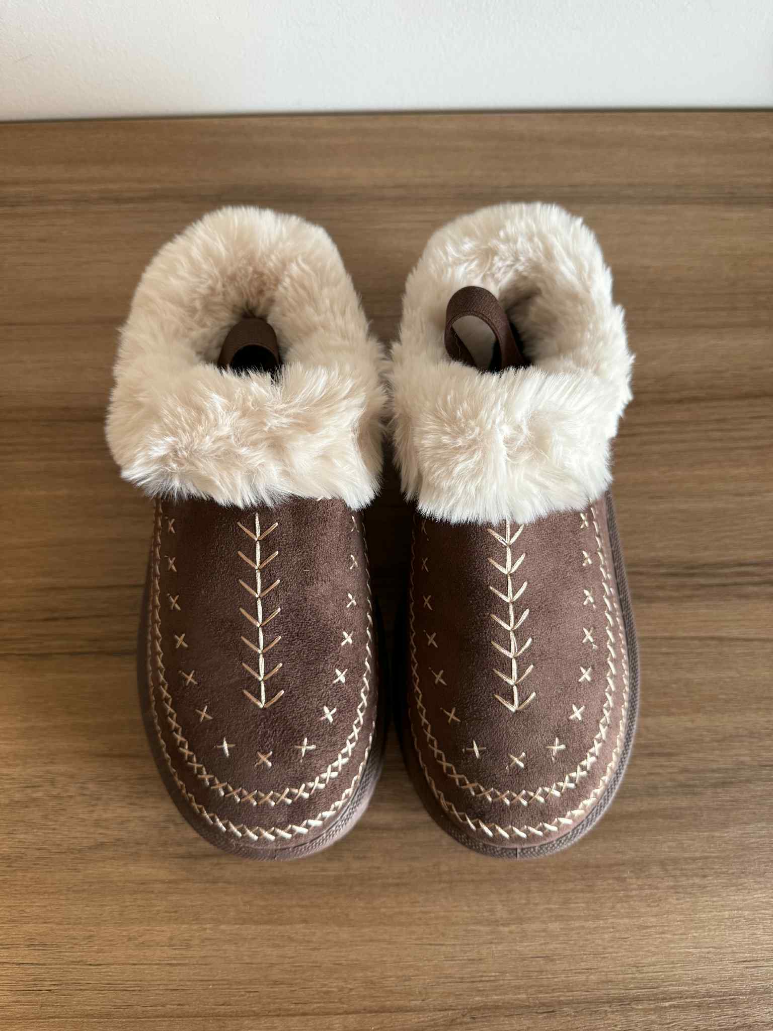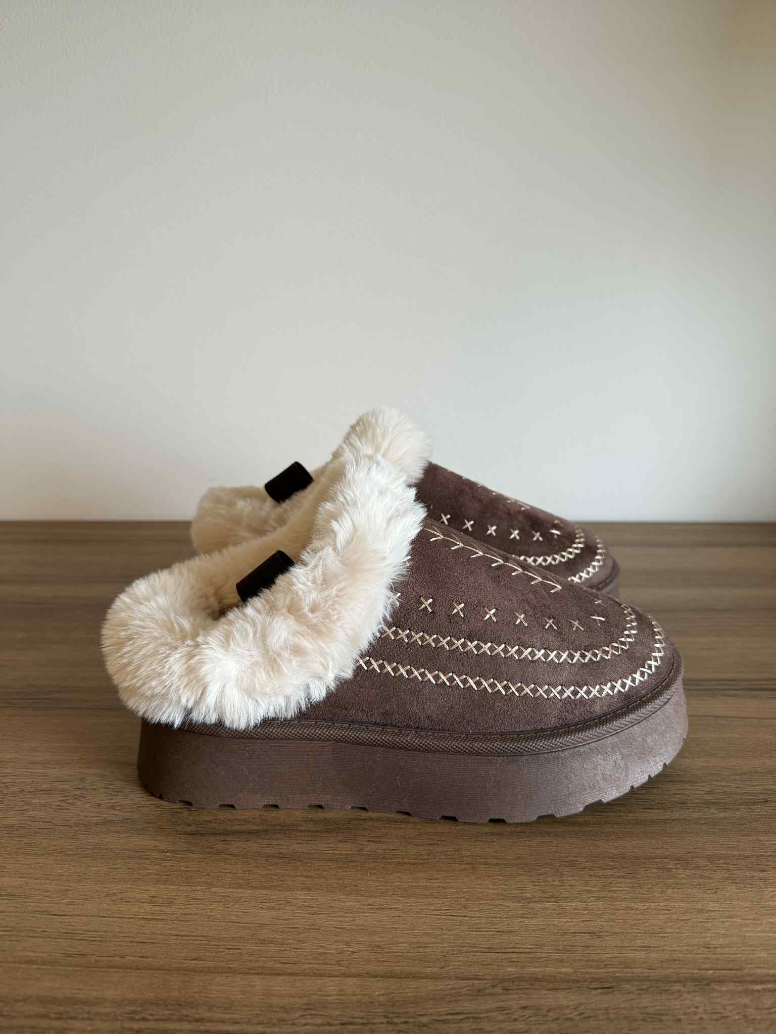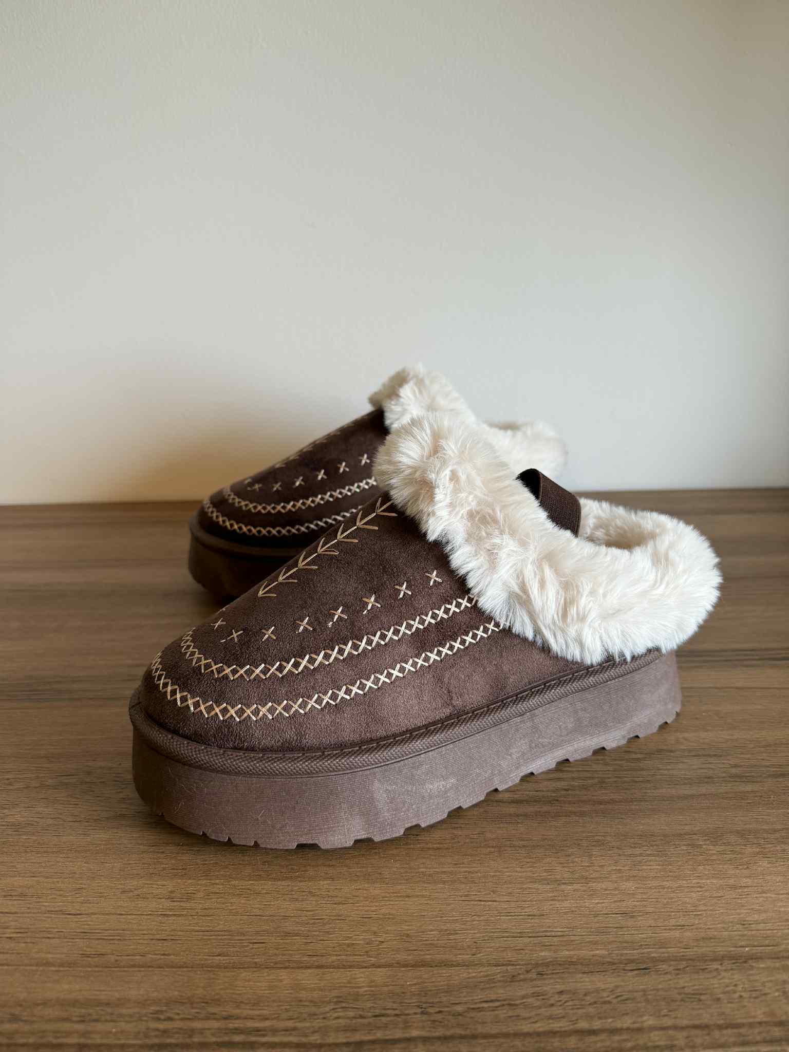 Chinelo com sola alta em plataforma, com 4cm de altura. Com gola de pelo e forrada a pelinho no interior. Exterior em camurça sintética.