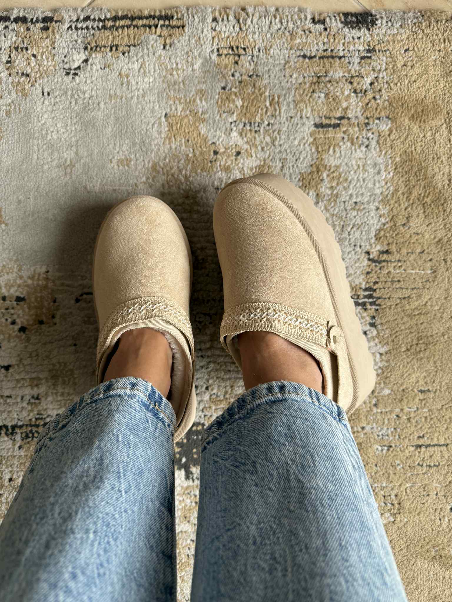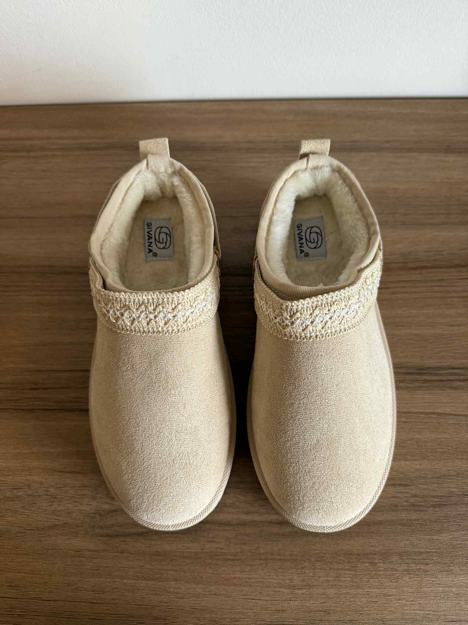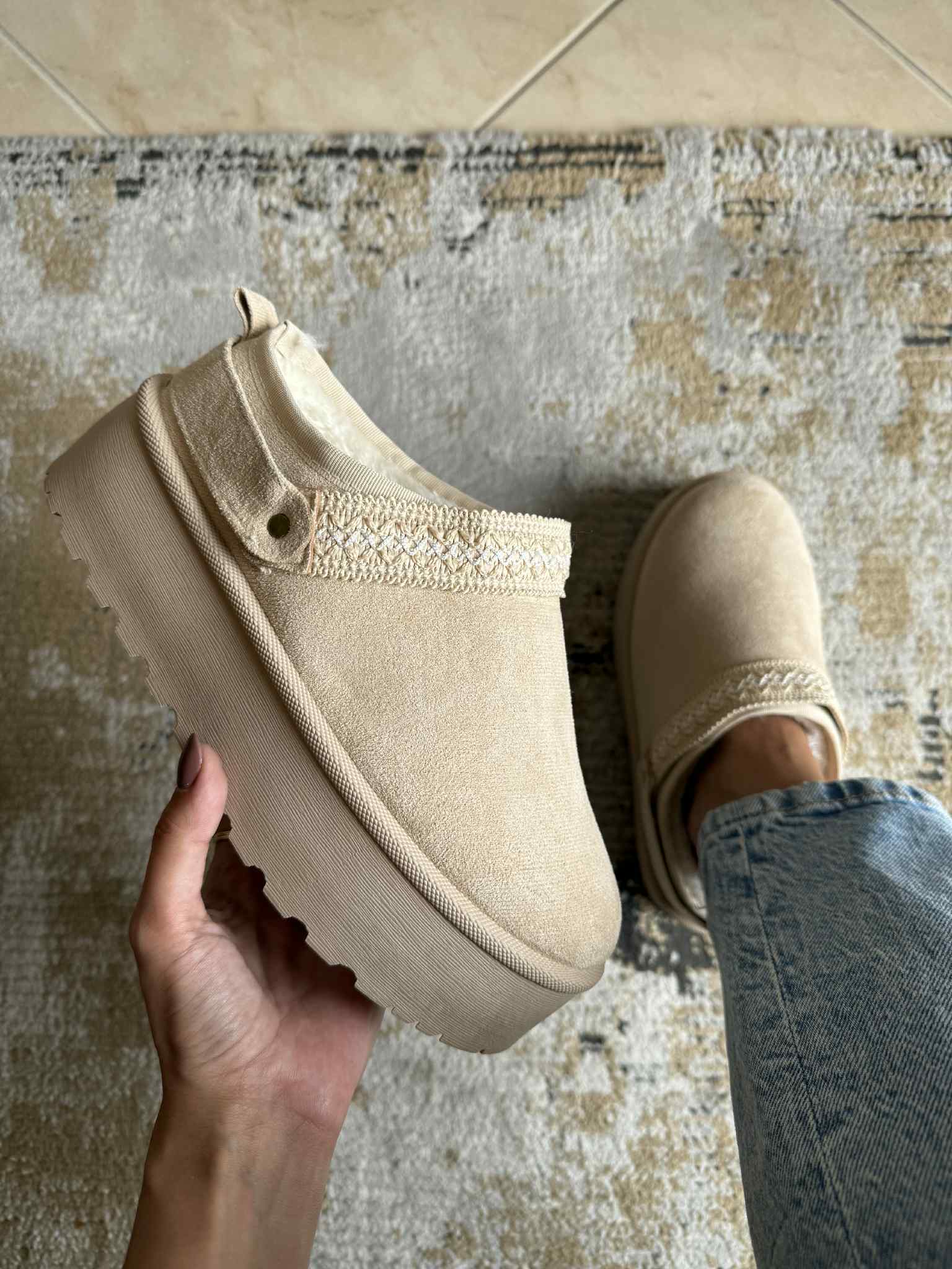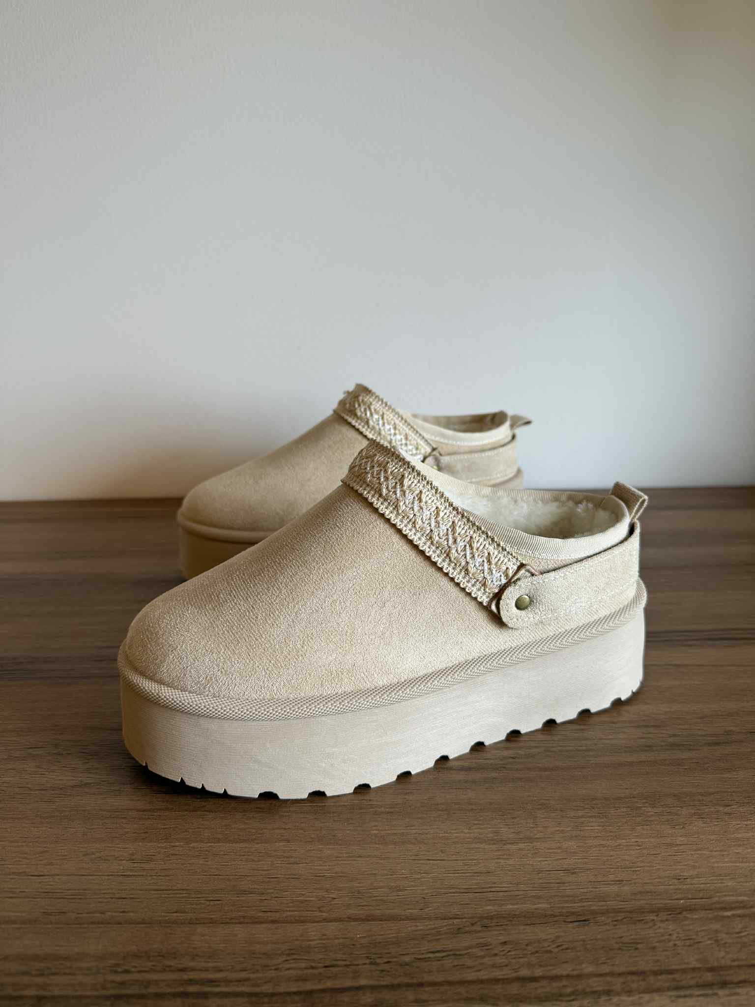 Chinelo com sola alta em plataforma, com 5cm de altura. Forrada a pelinho no interior. Exterior em camurça sintética.