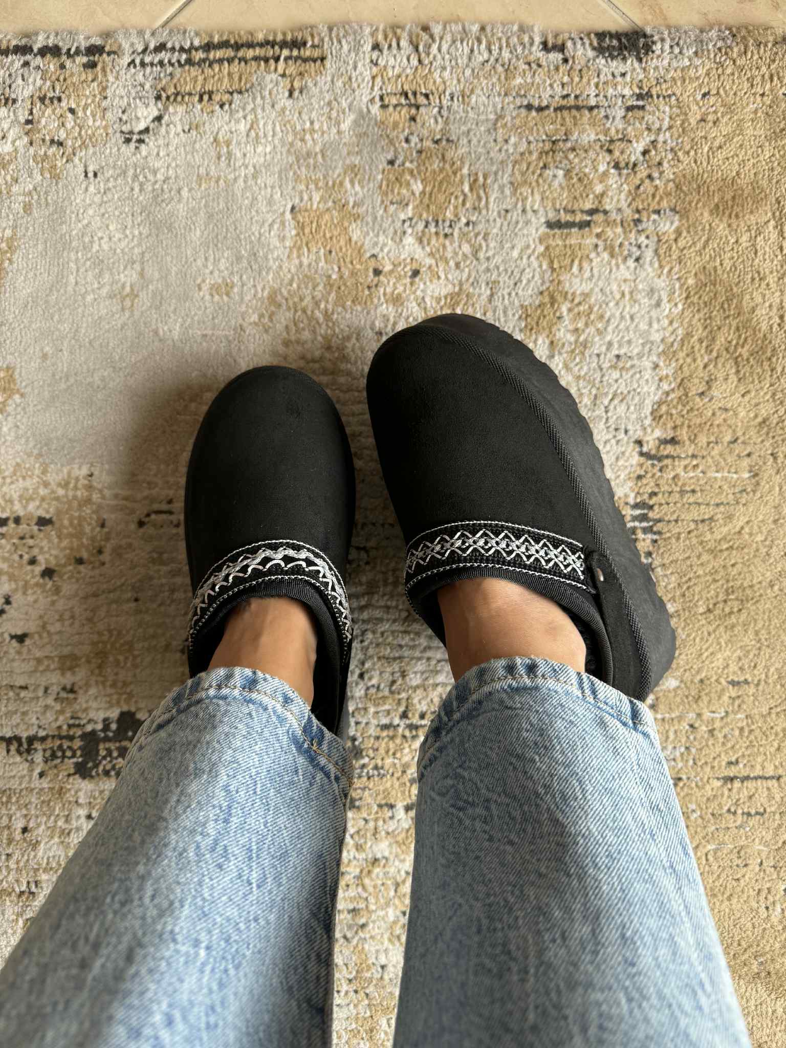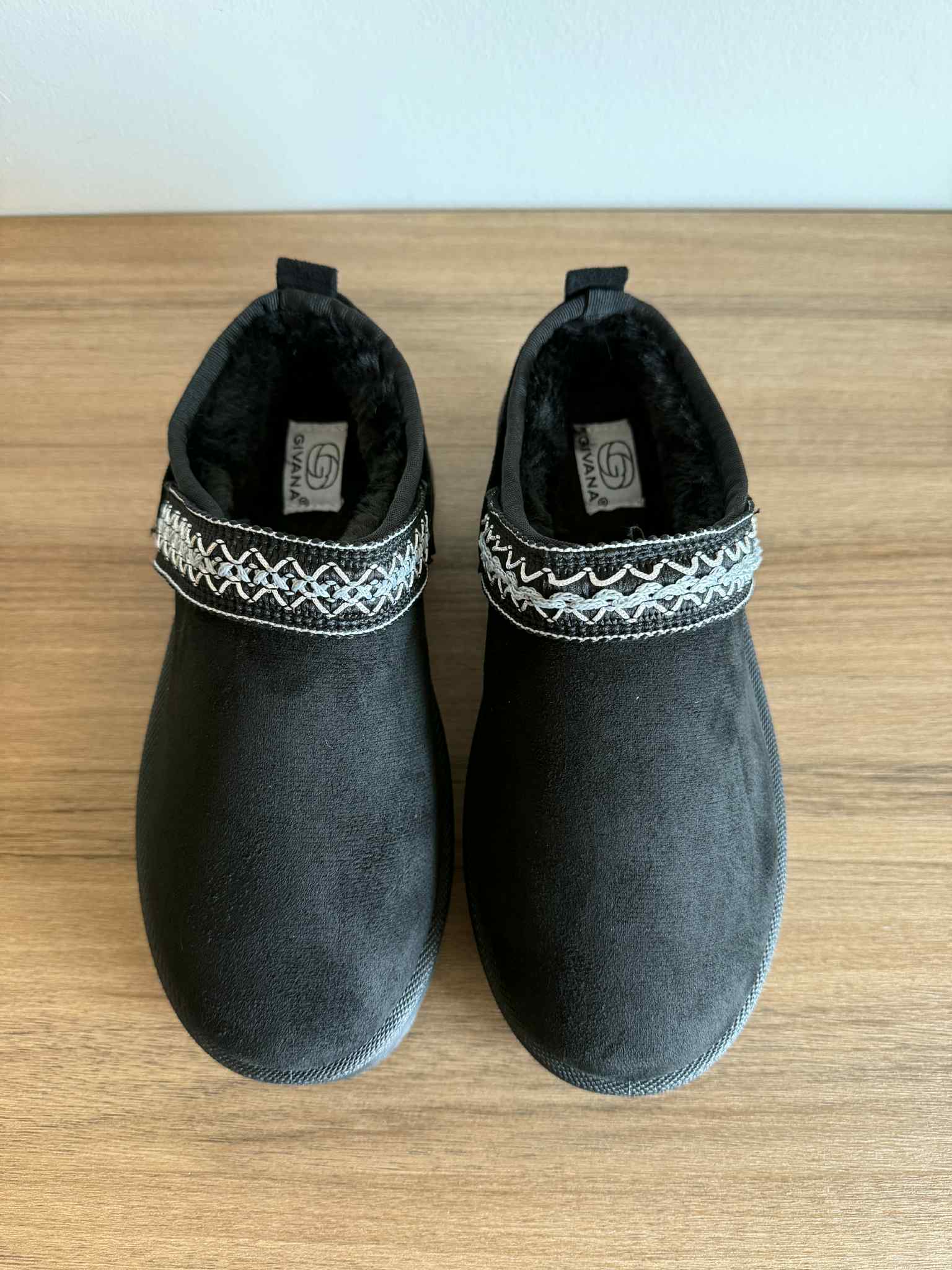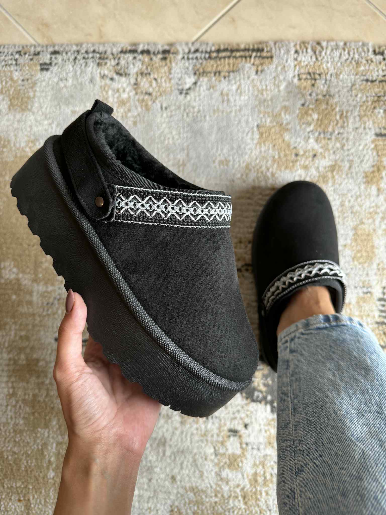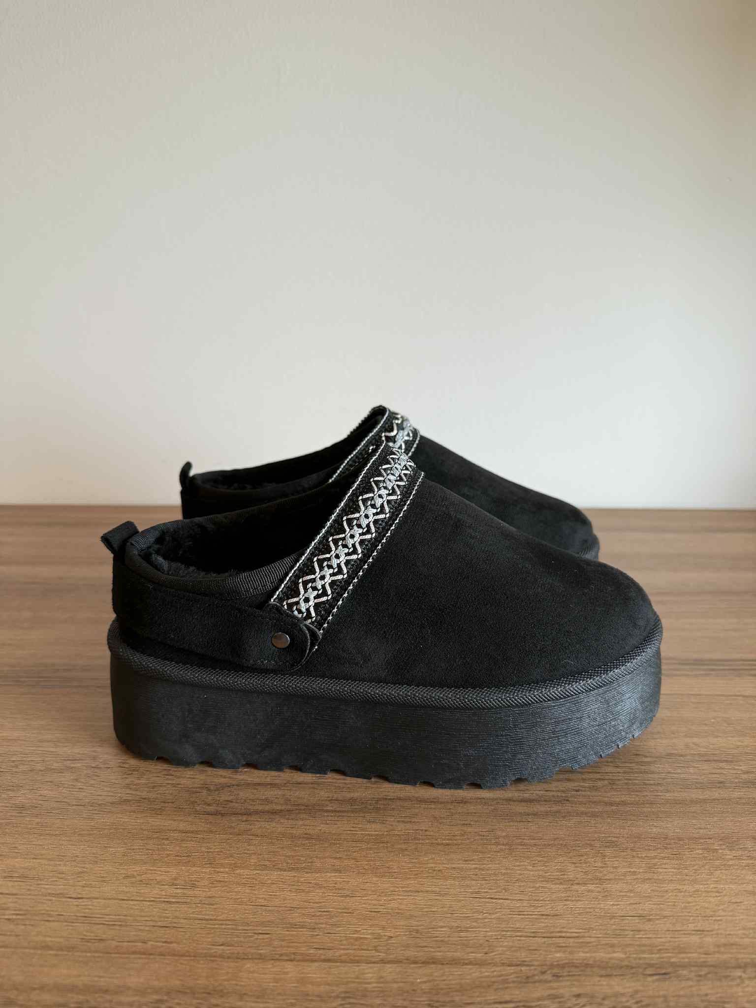 Chinelo com sola alta em plataforma, com 5cm de altura. Forrada a pelinho no interior. Exterior em camurça sintética.