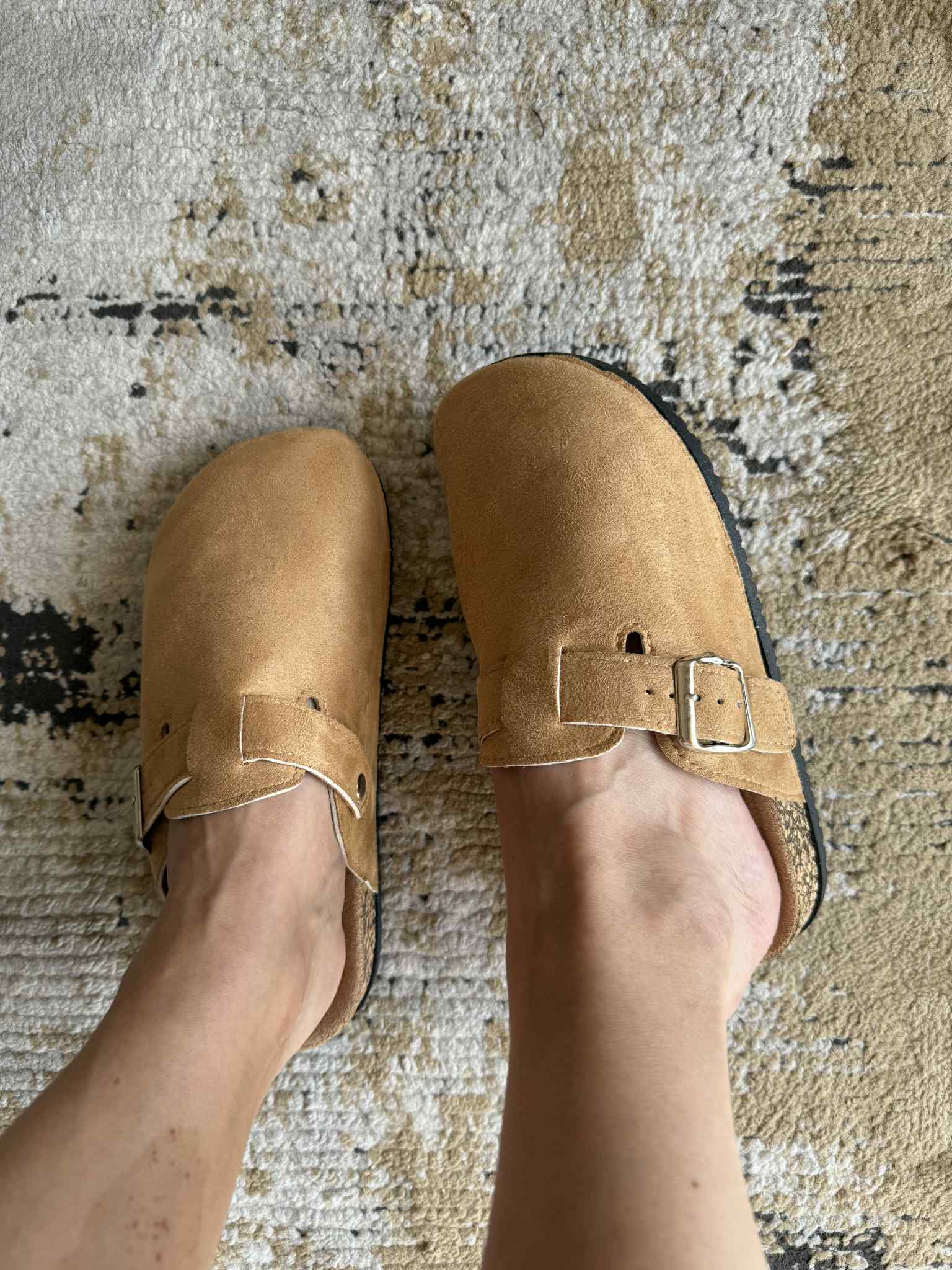 Chinelo com a frente fechada. Em camurça sintética. Com fivela.