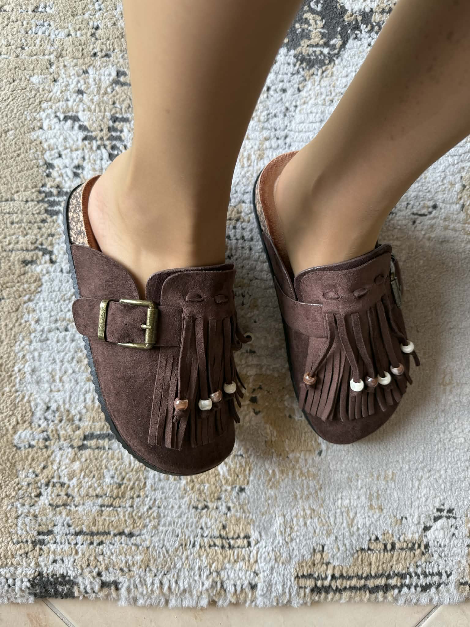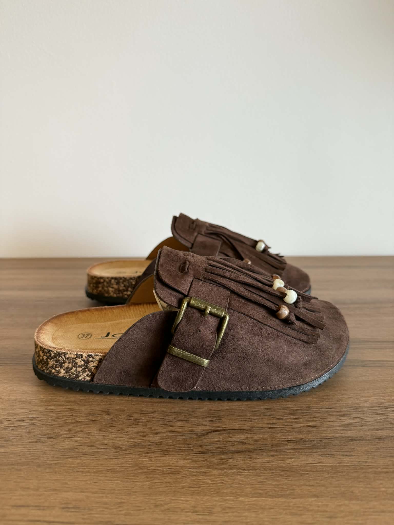 Chinelo com a frente fechada. Em camurça sintética. Com fivela.