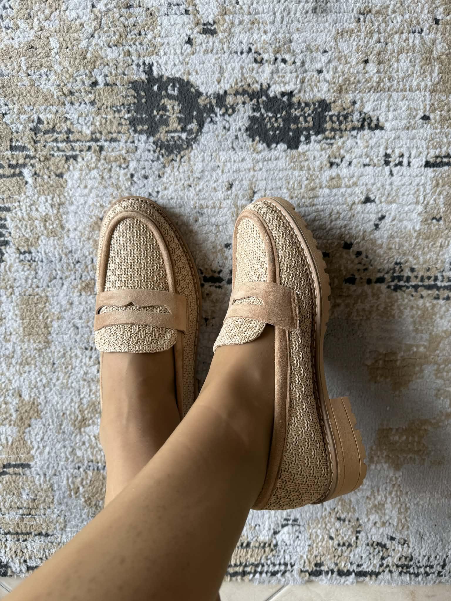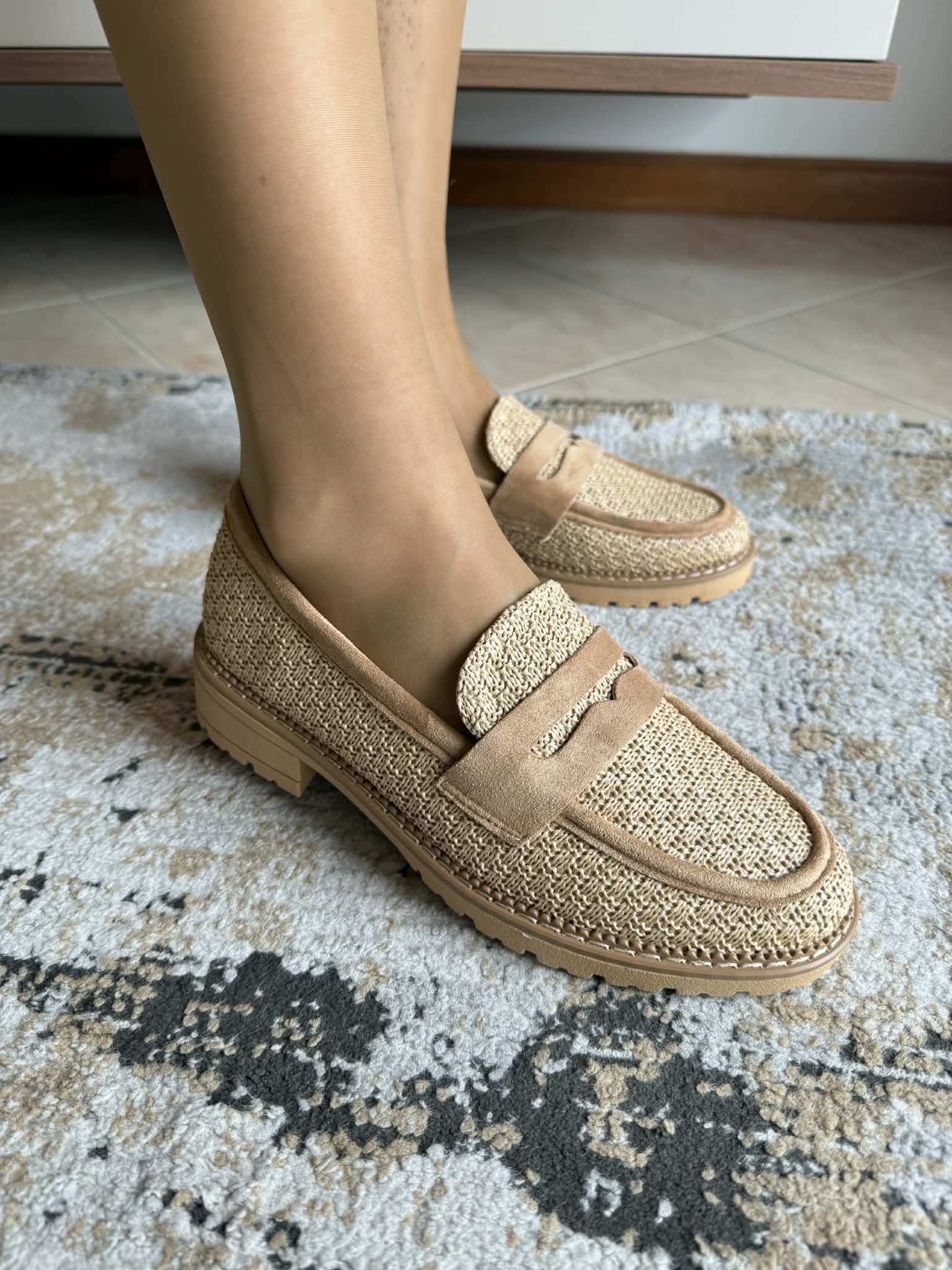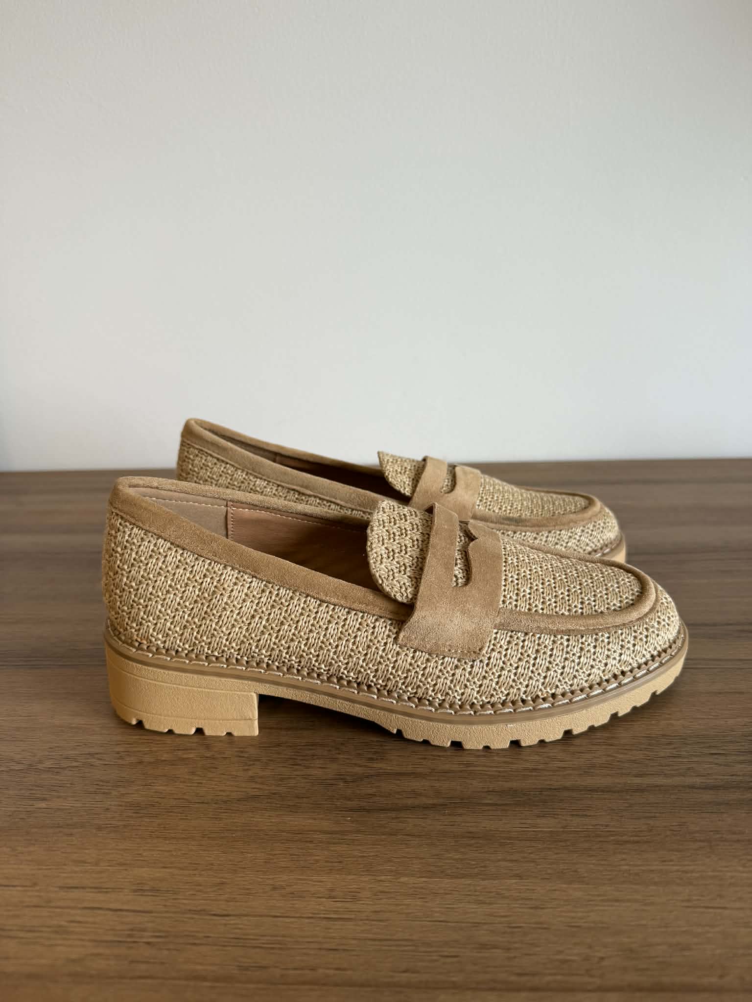 Sapato feminino, estilo loafer. Em bege. Em material sintético efeito palhinha. Palmilha almofadada.
