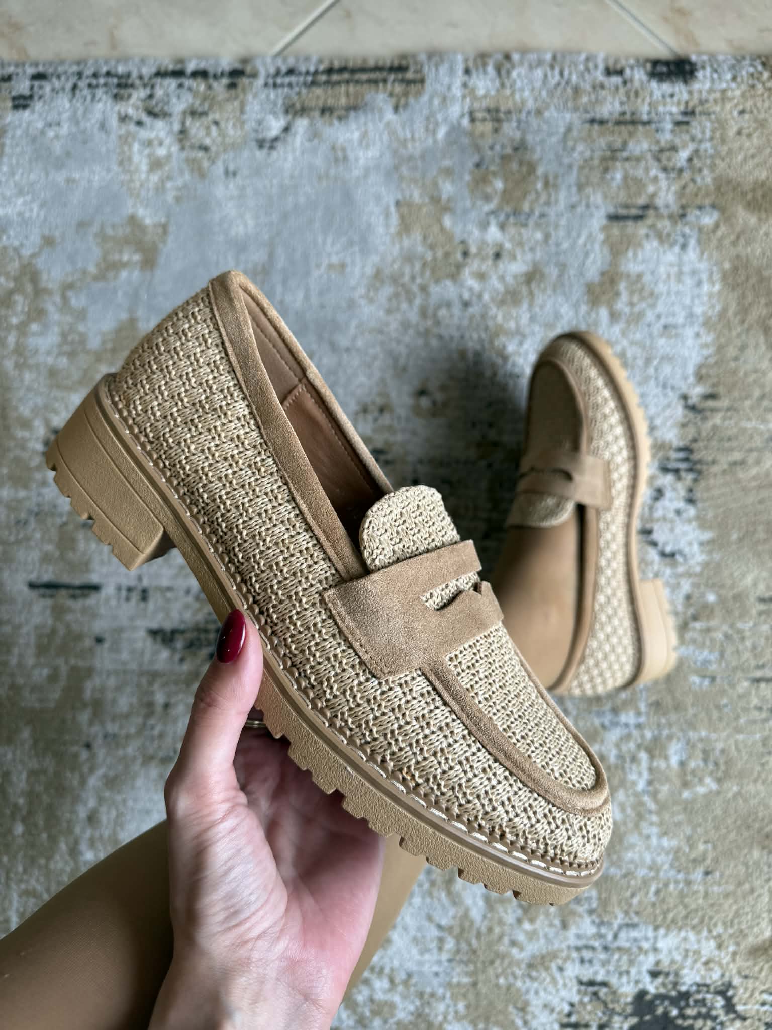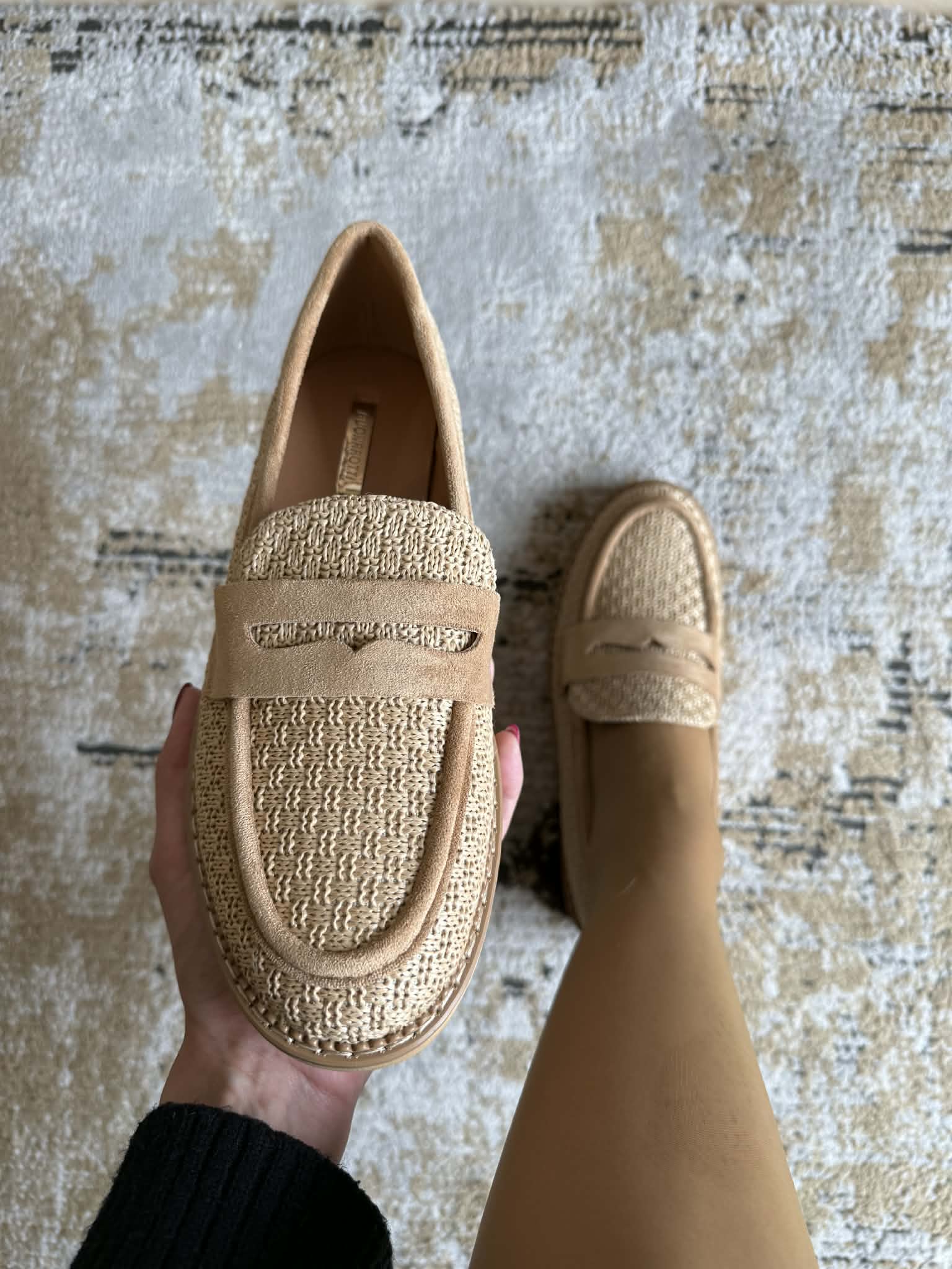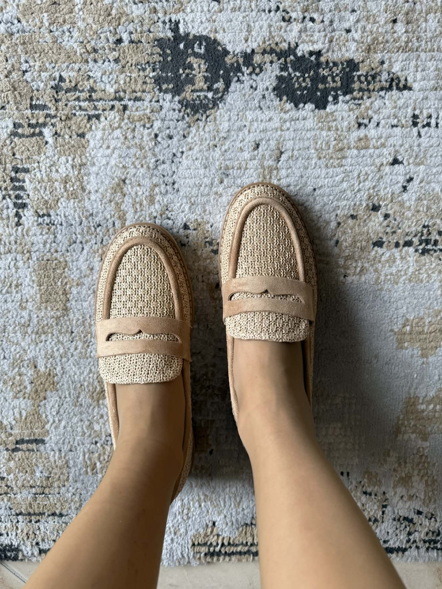 Sapato feminino, estilo loafer. Em bege. Em material sintético efeito palhinha. Palmilha almofadada.