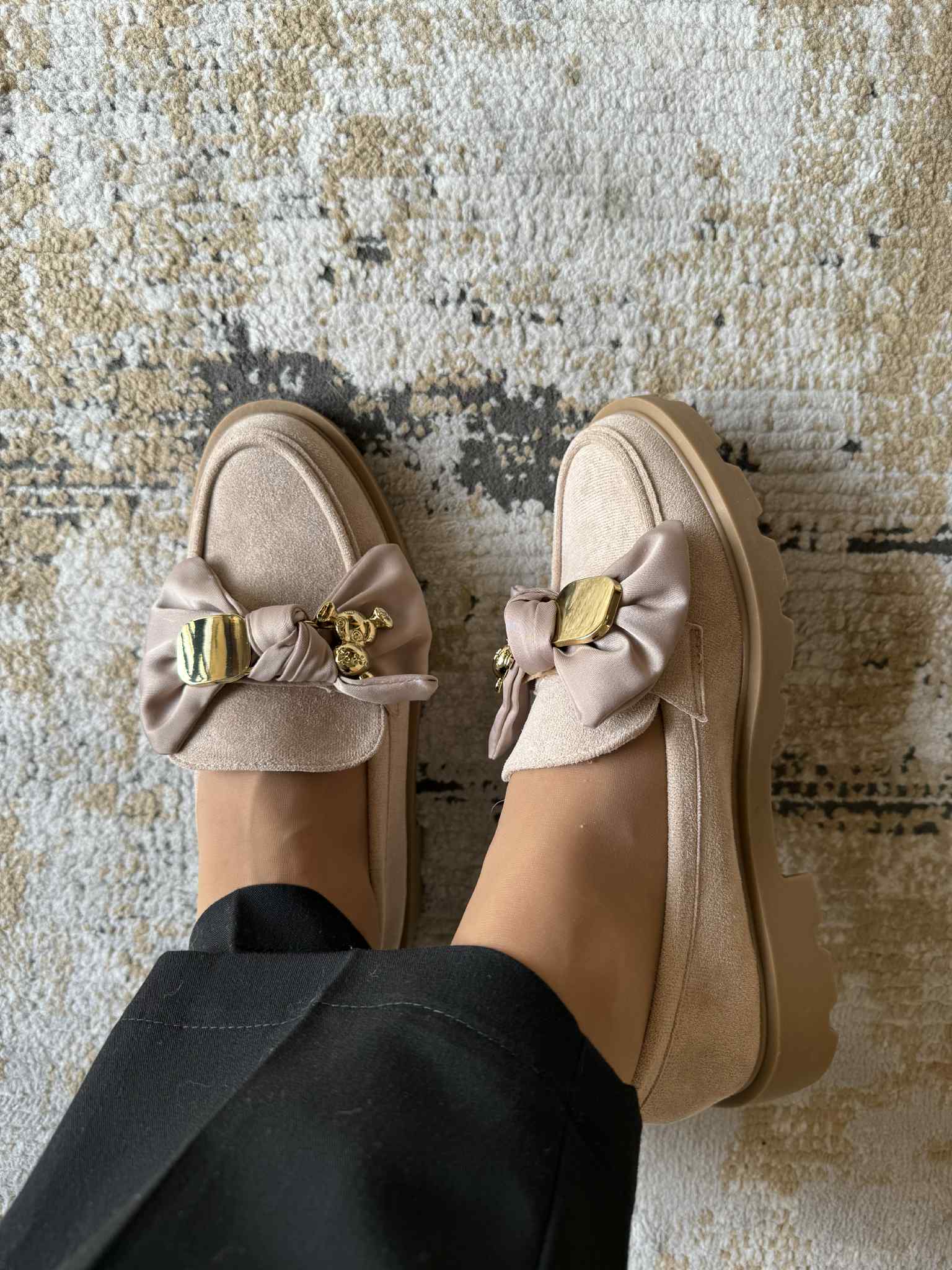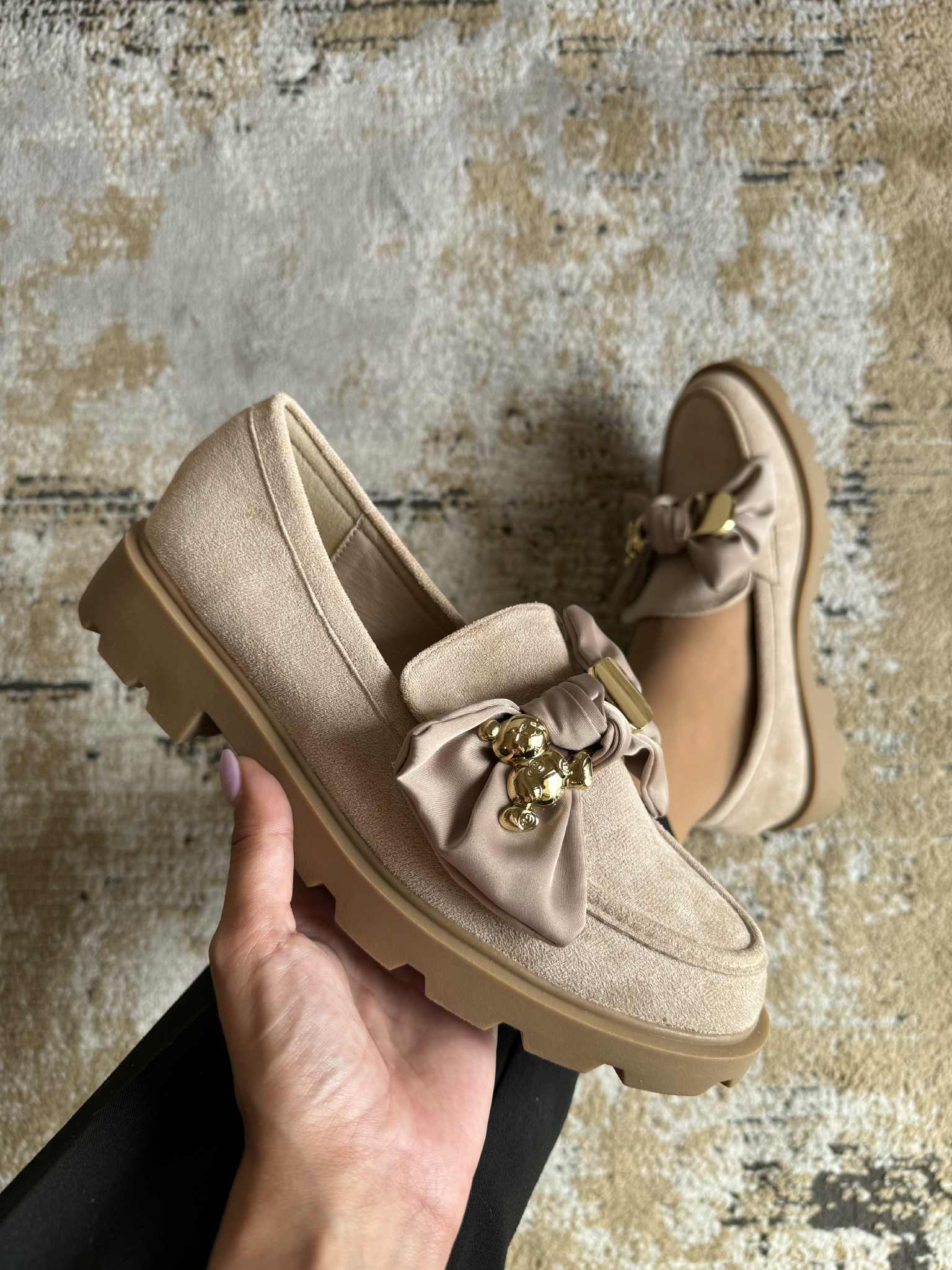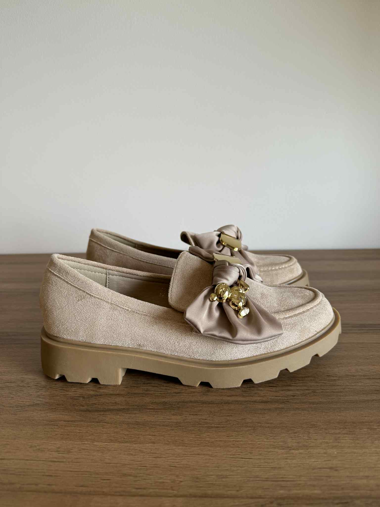 Sapato estilo loafer, em camurça sintética. Sola de borracha. Aplicação dourada com ursinho e laço. Palmilha almofadada.