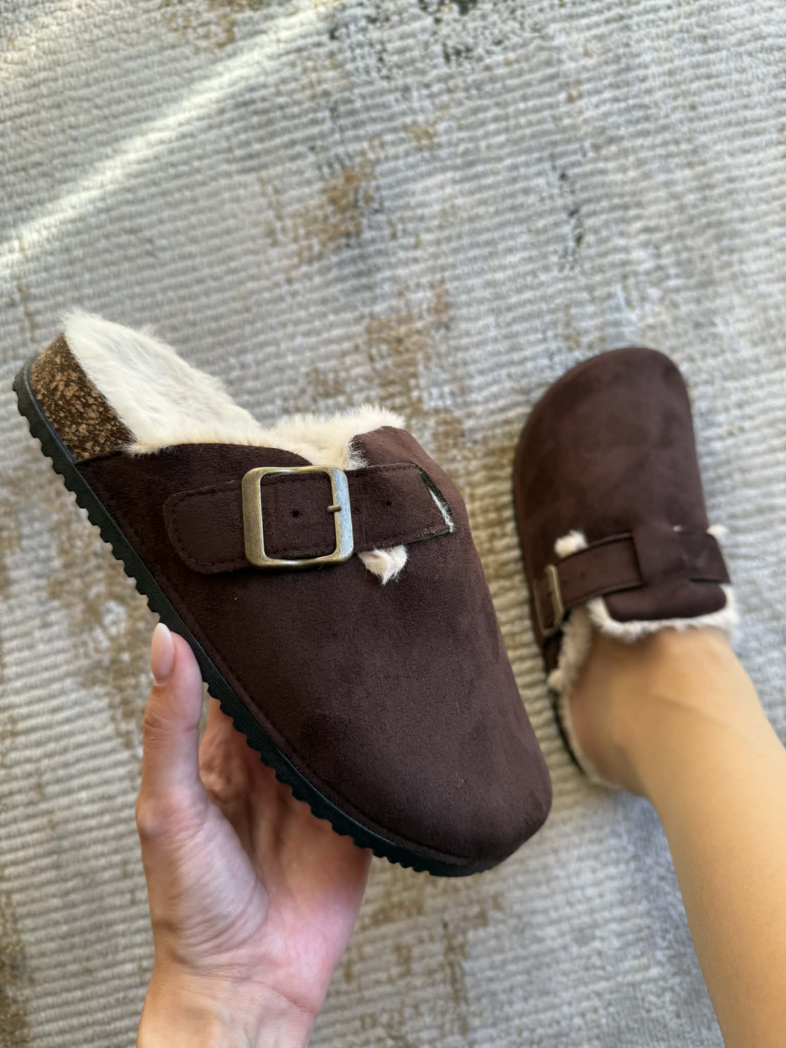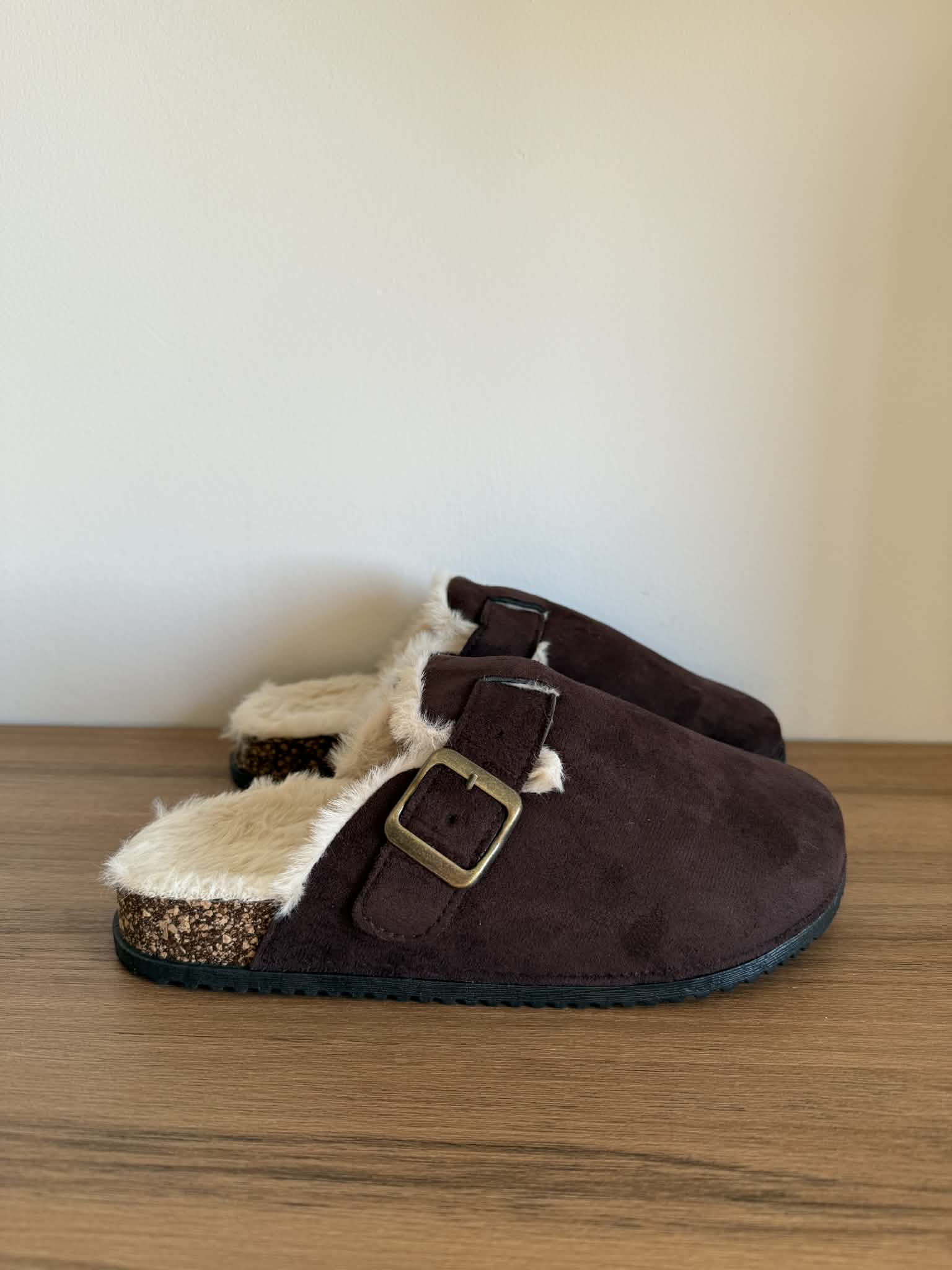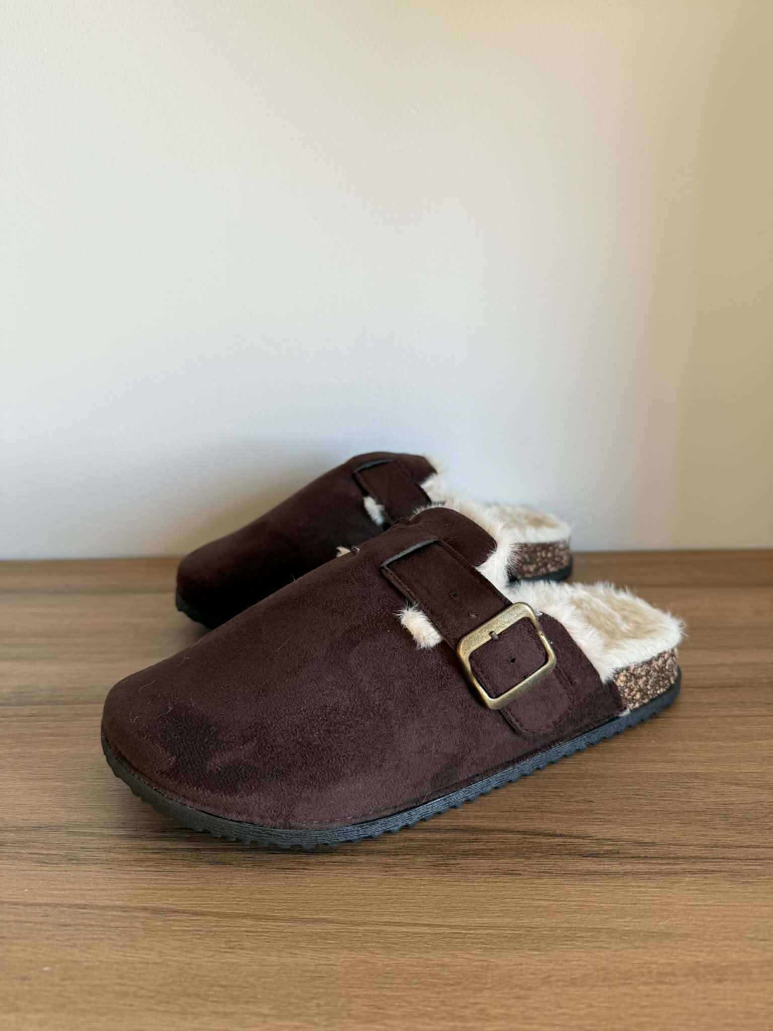 Chinelo com a frente fechada. Em camurça sintética. Com fivela. Pelinho branco no interior.