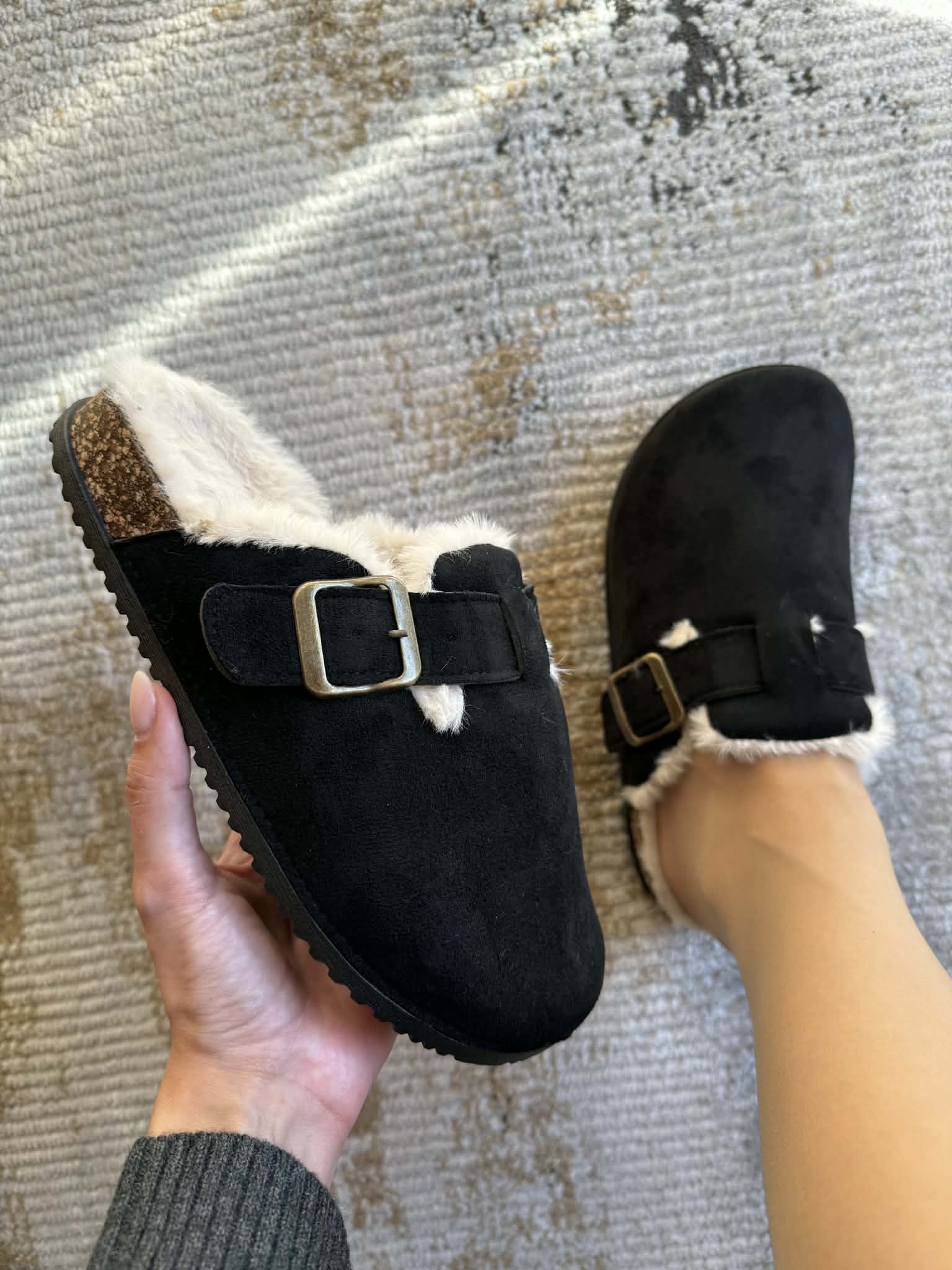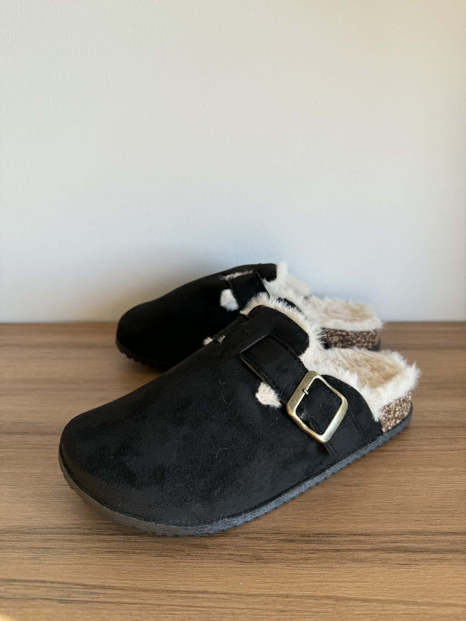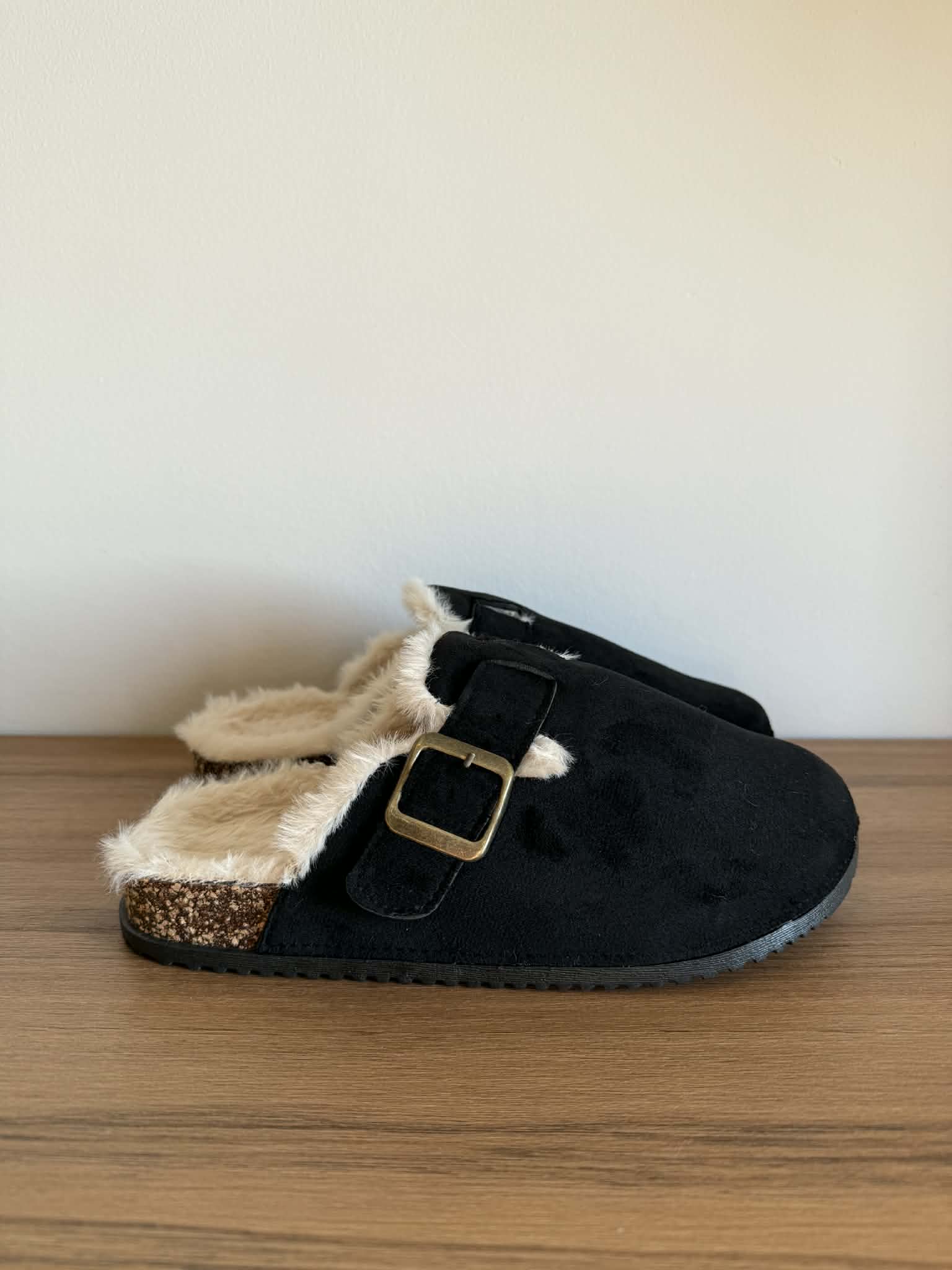 Chinelo com a frente fechada. Em camurça sintética. Com fivela. Pelinho branco no interior.