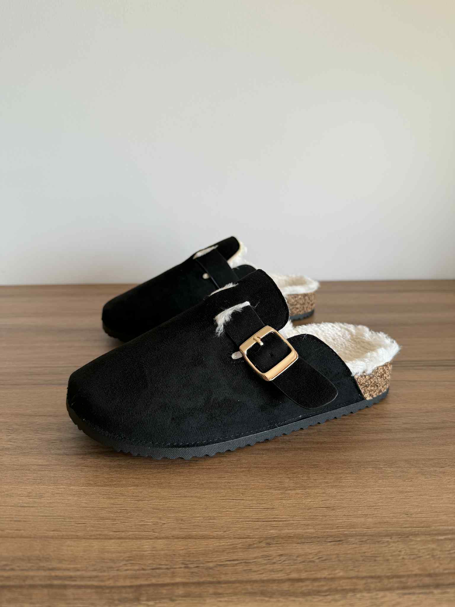Chinelo com a frente fechada. Em camurça sintética. Com fivela. Pelinho branco no interior.