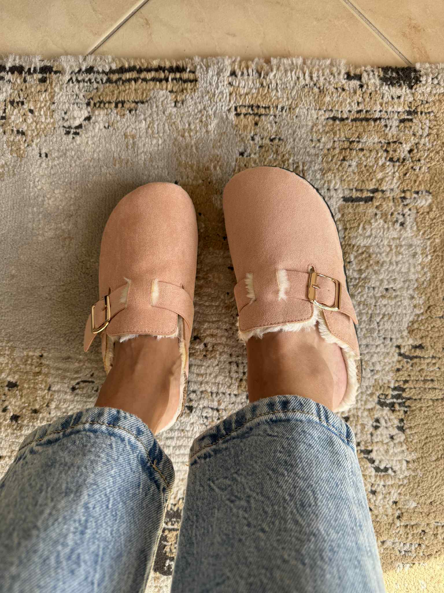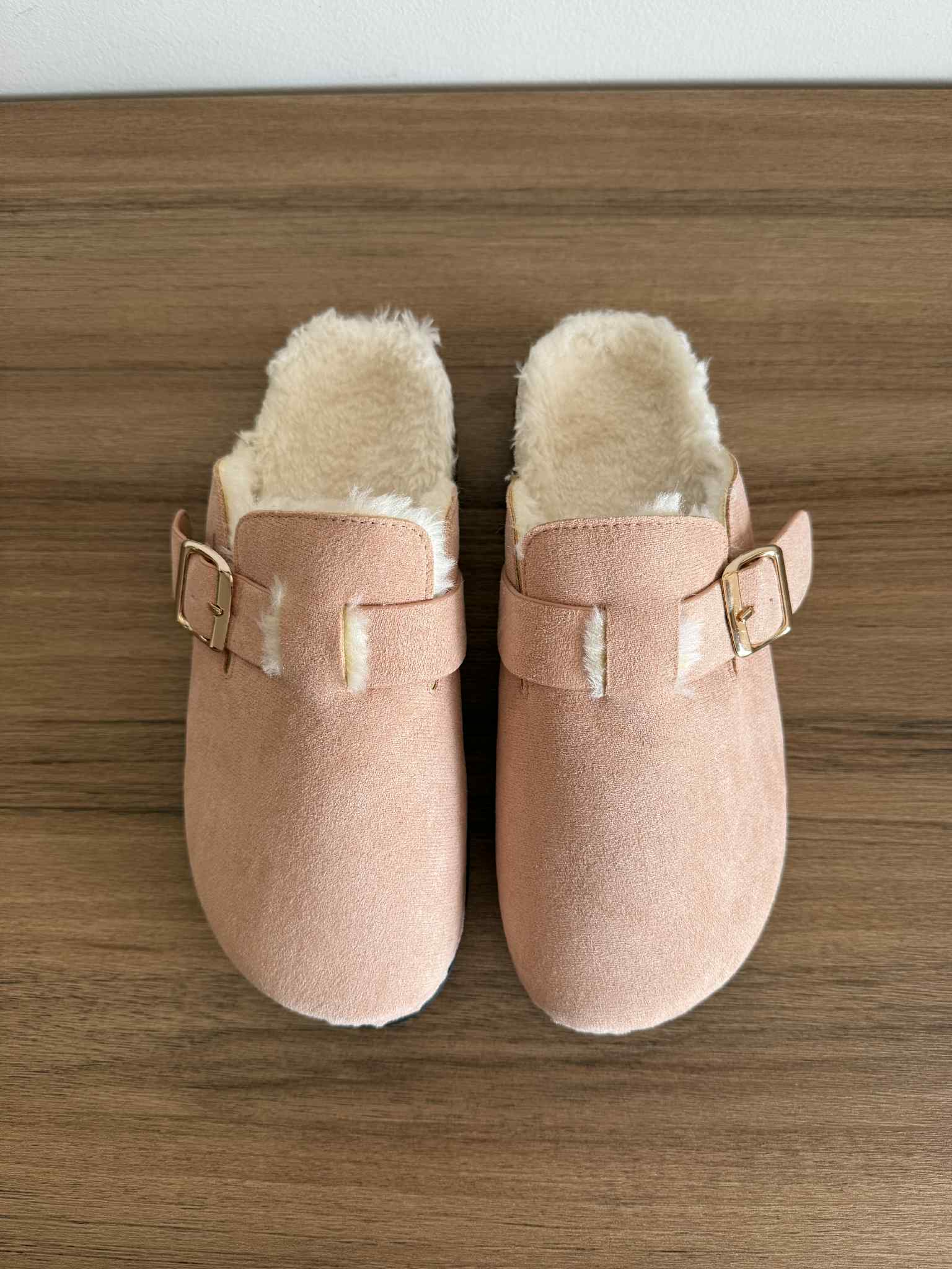 Chinelo com a frente fechada. Em camurça sintética. Com fivela. Pelinho branco no interior.