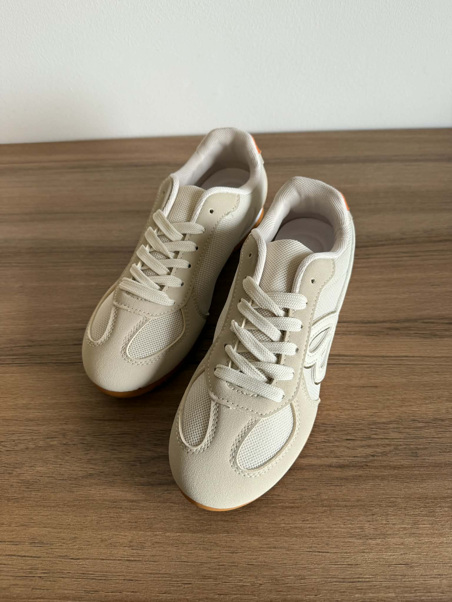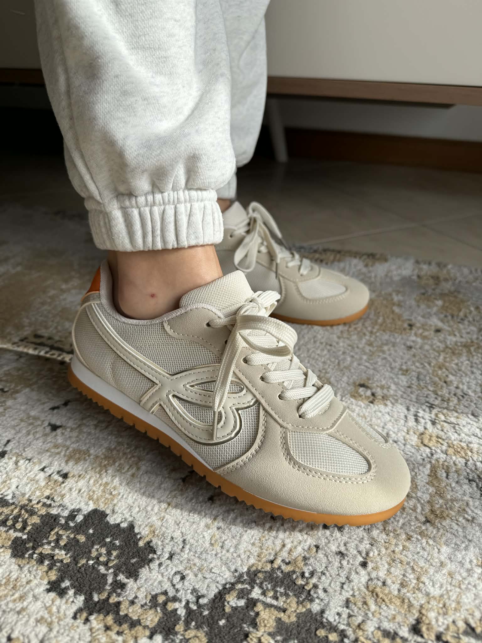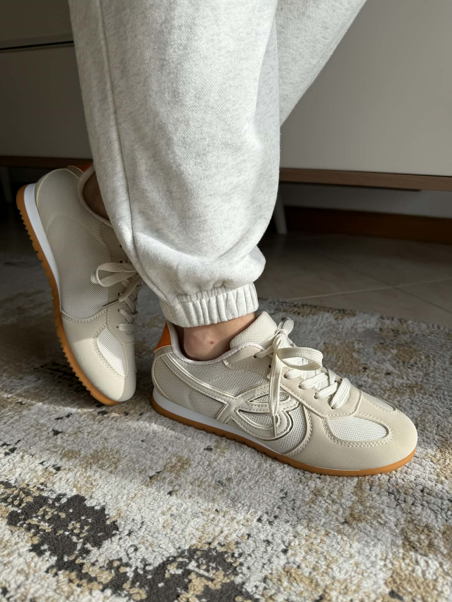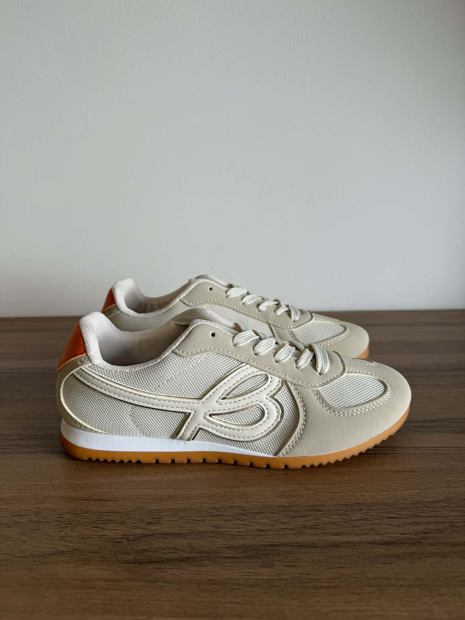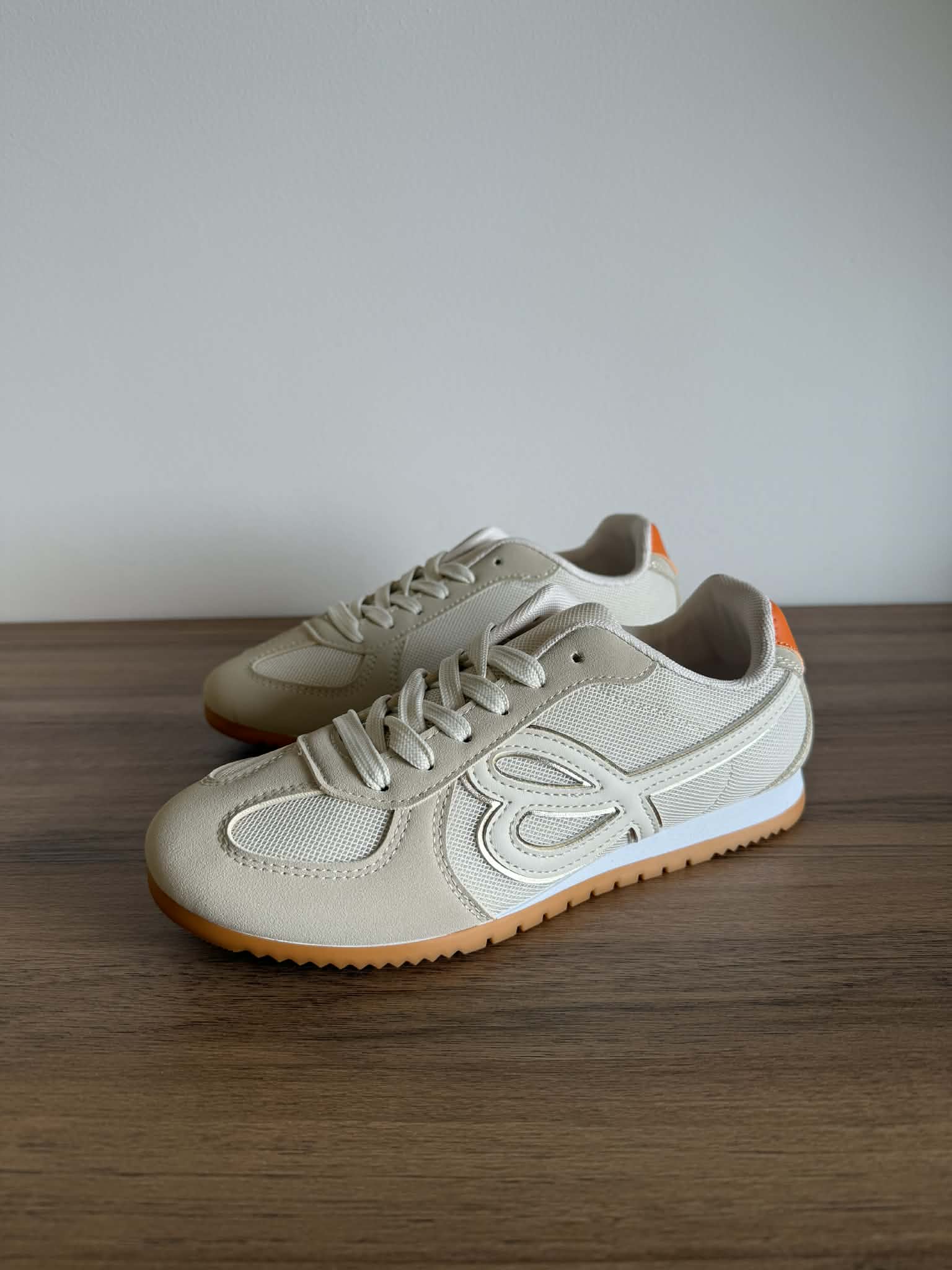 Sapatilha feminina, com sola rasa. Em bege, com detalhe dourado e laranja atrás. Com atacadores. Em rede e pele sintética.