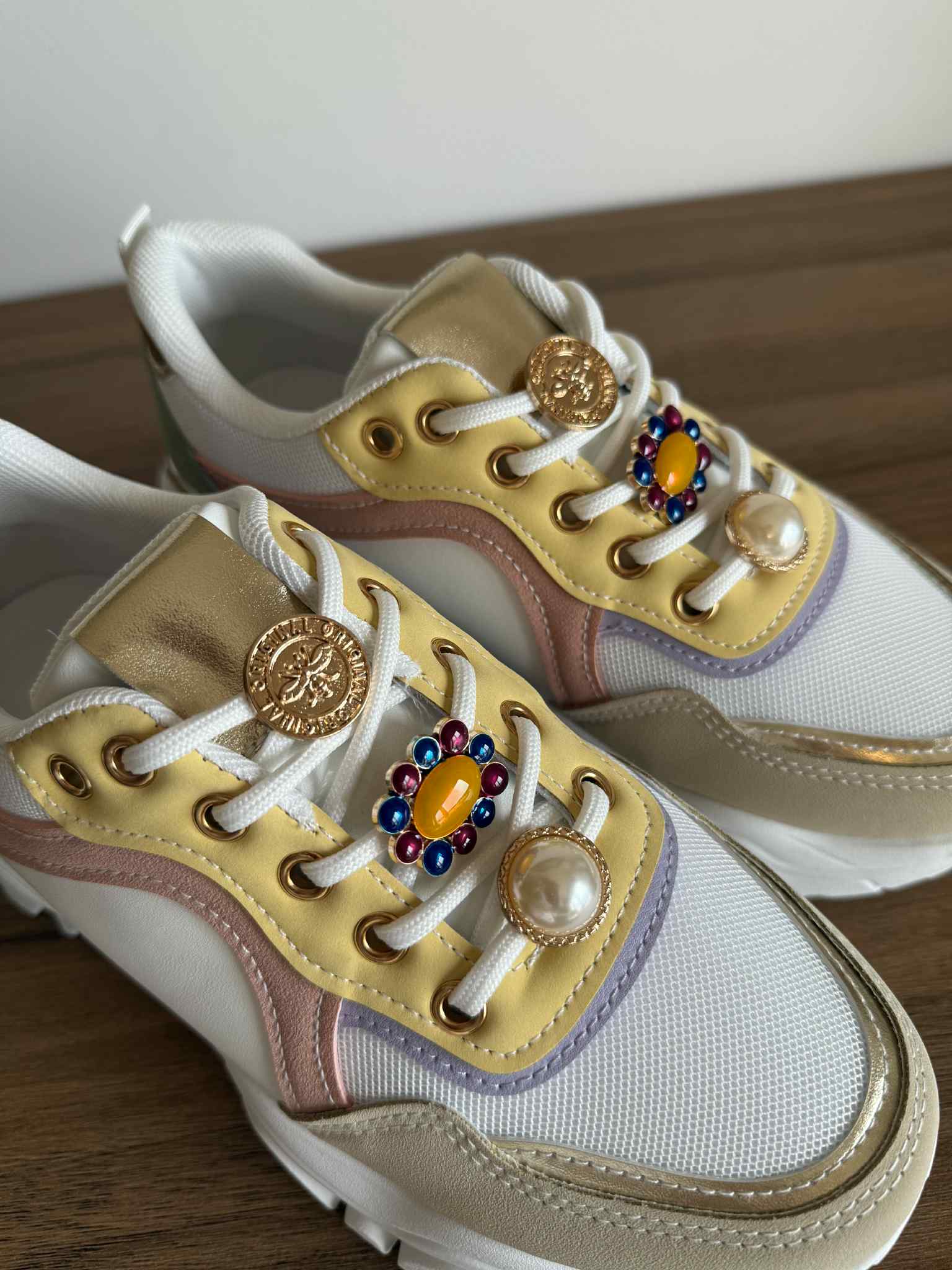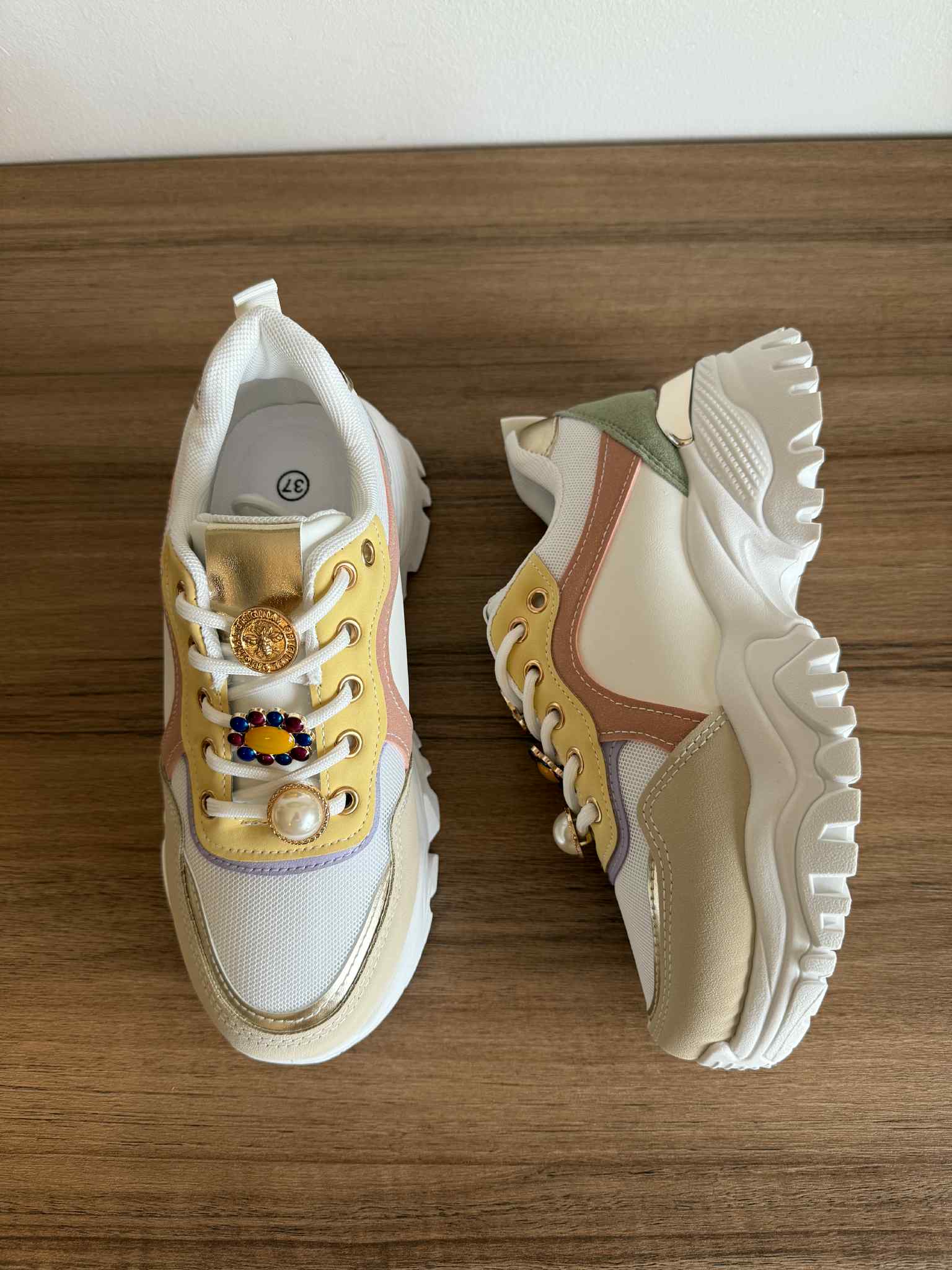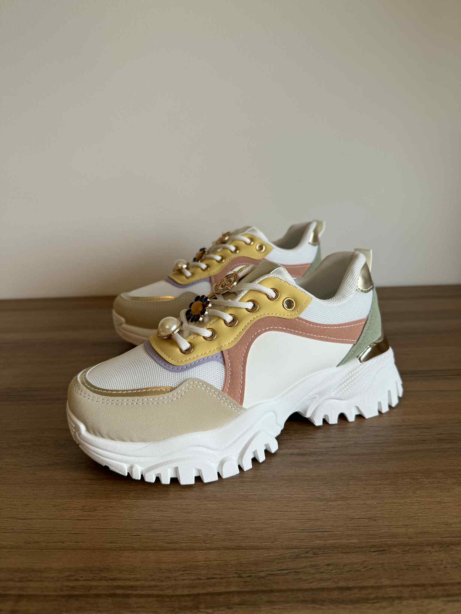 Sapatilha feminina com atacador. Design moderno, com sola chunky. Com parte superior em rede, restante em pele sintética. Aplicações removíveis nos atacadores.