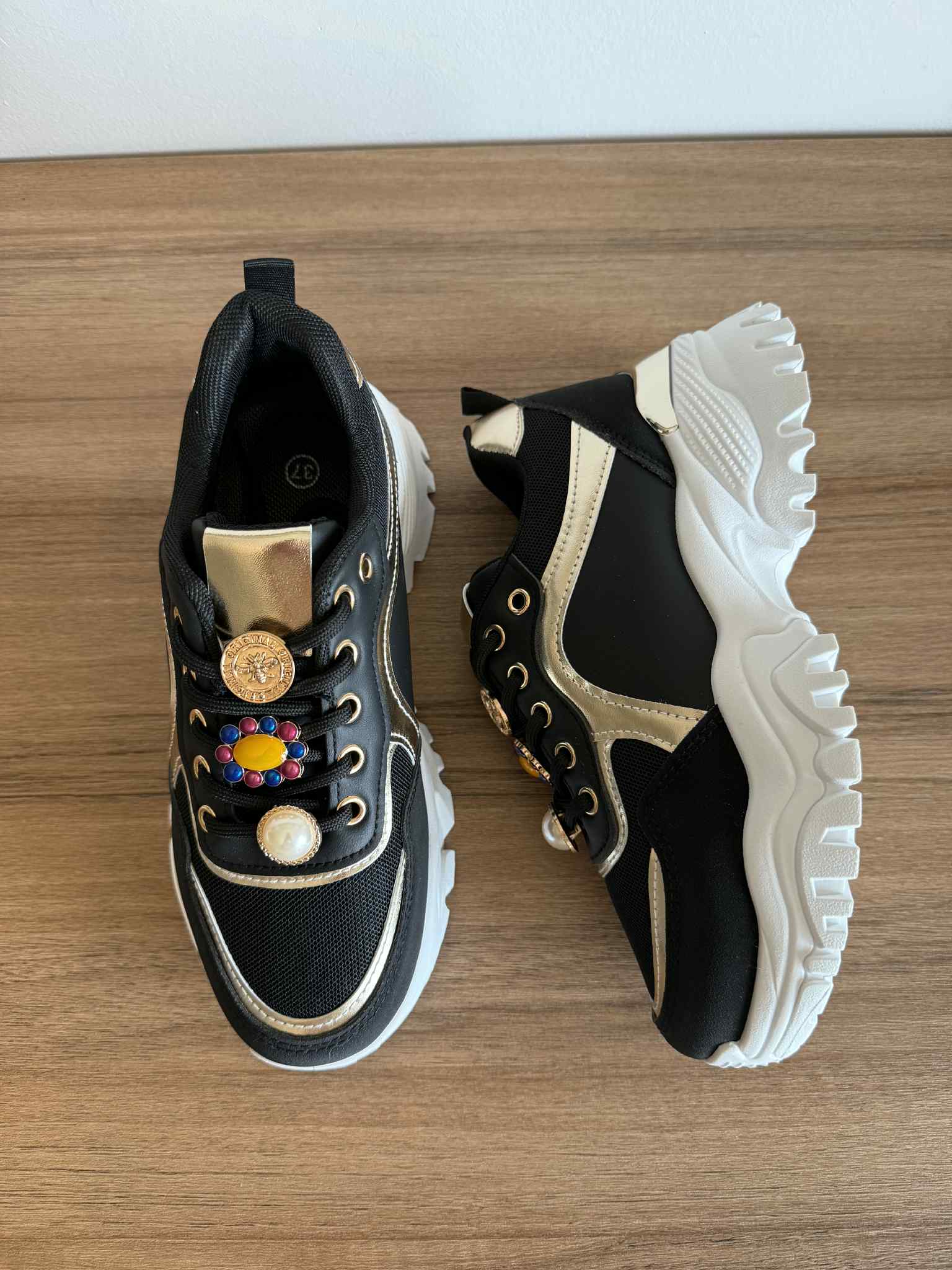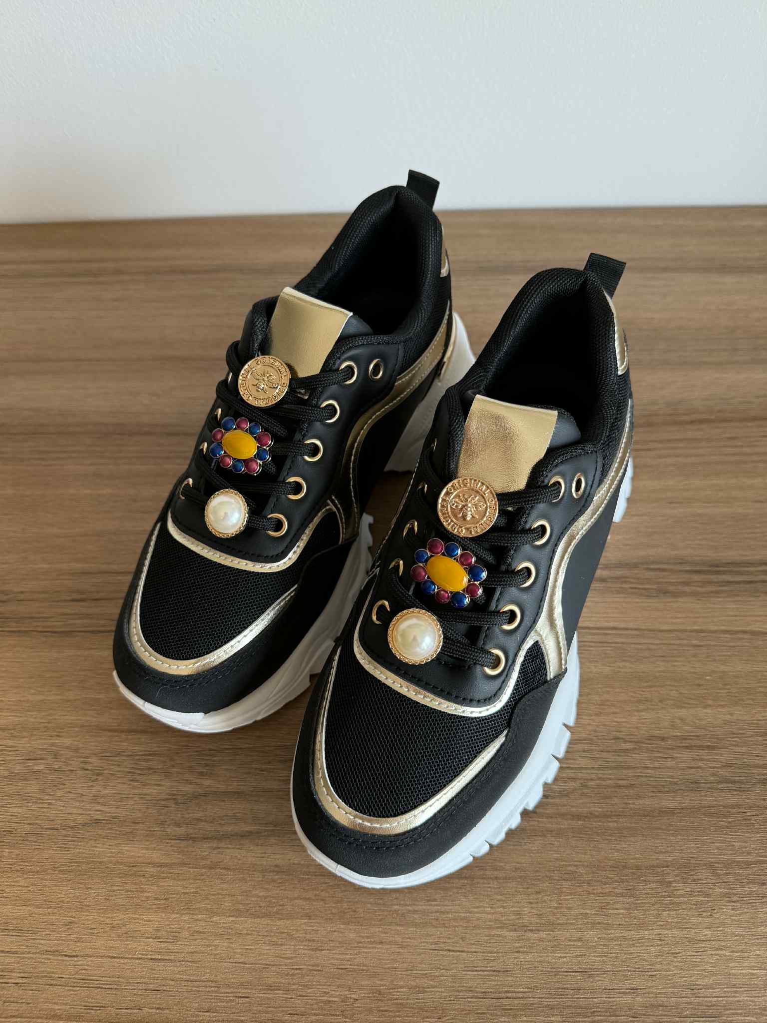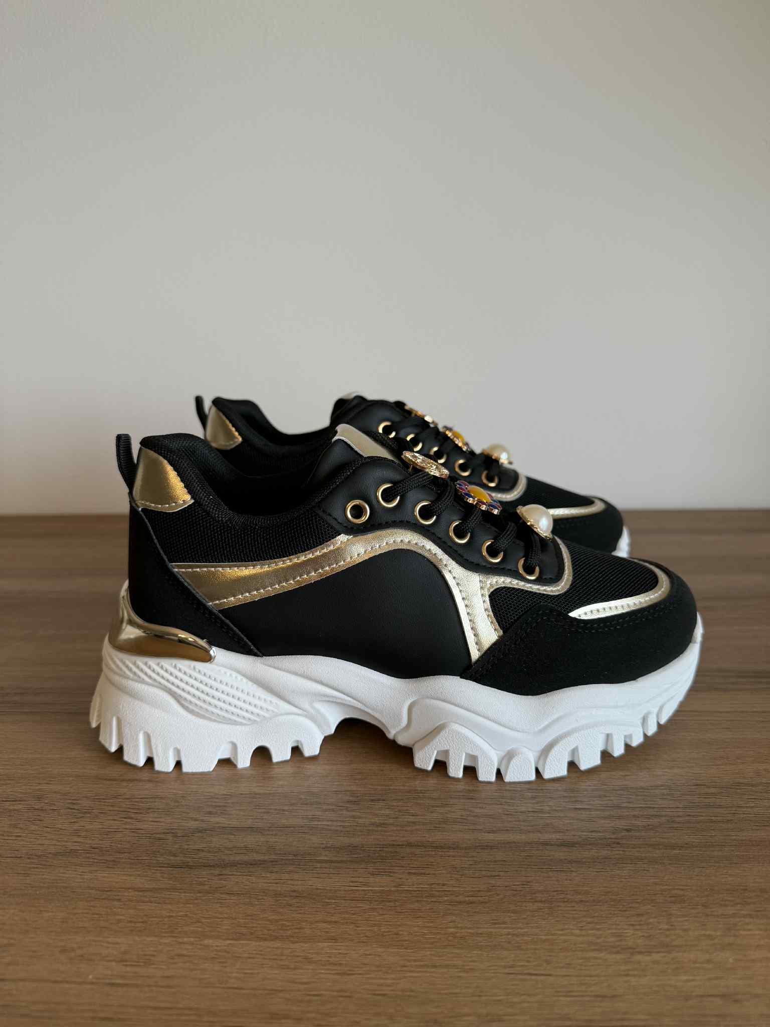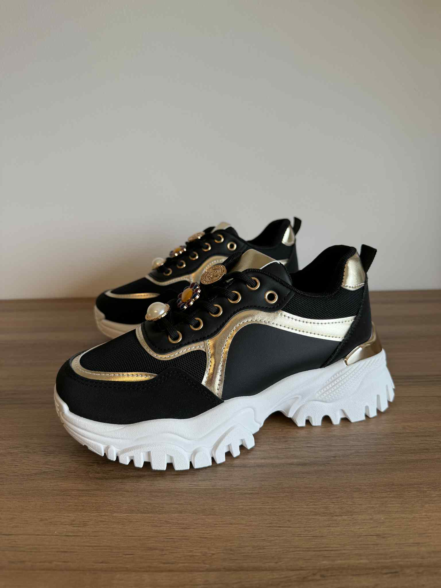 Sapatilha feminina com atacador. Design moderno, com sola chunky. Com parte superior em rede, restante em pele sintética. Aplicações removíveis nos atacadores.