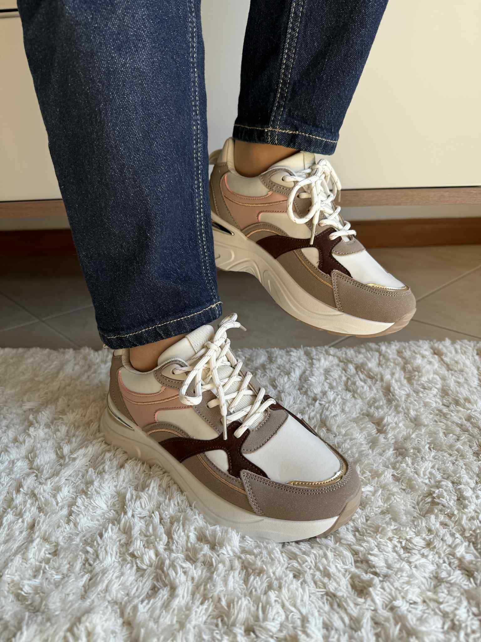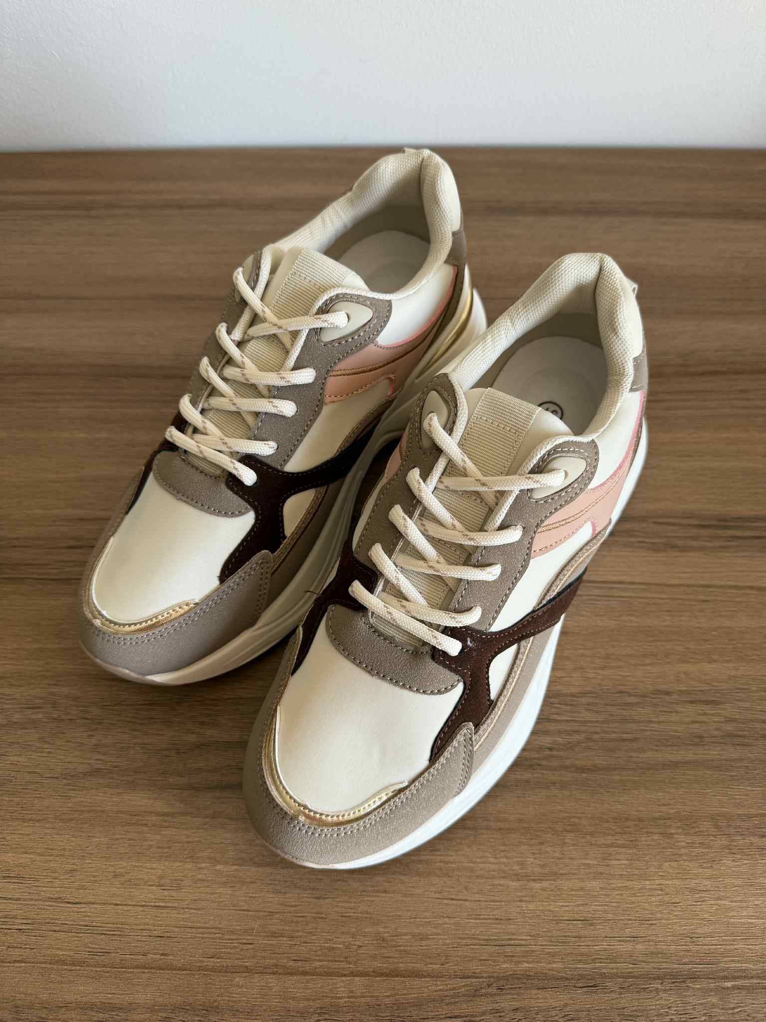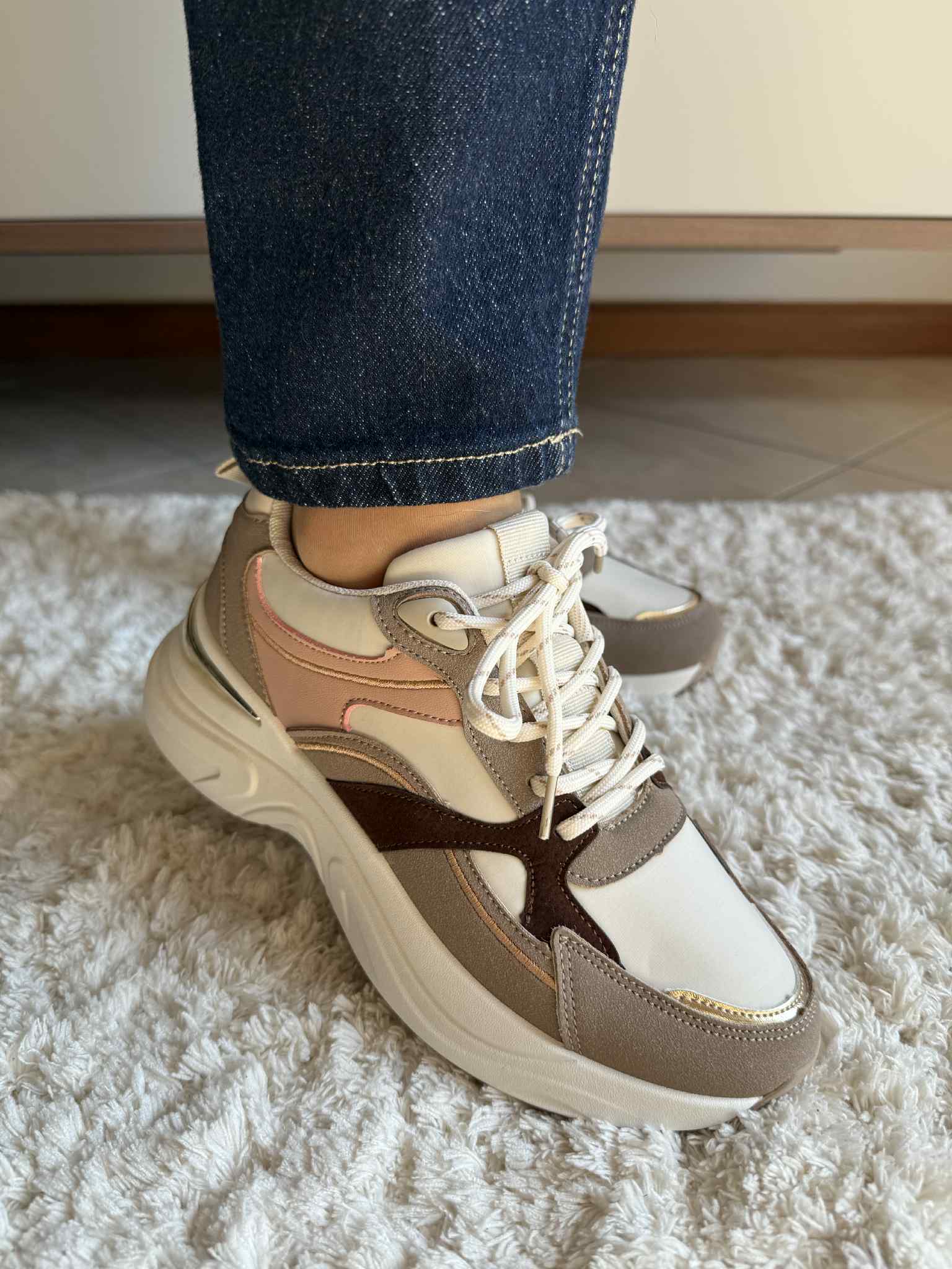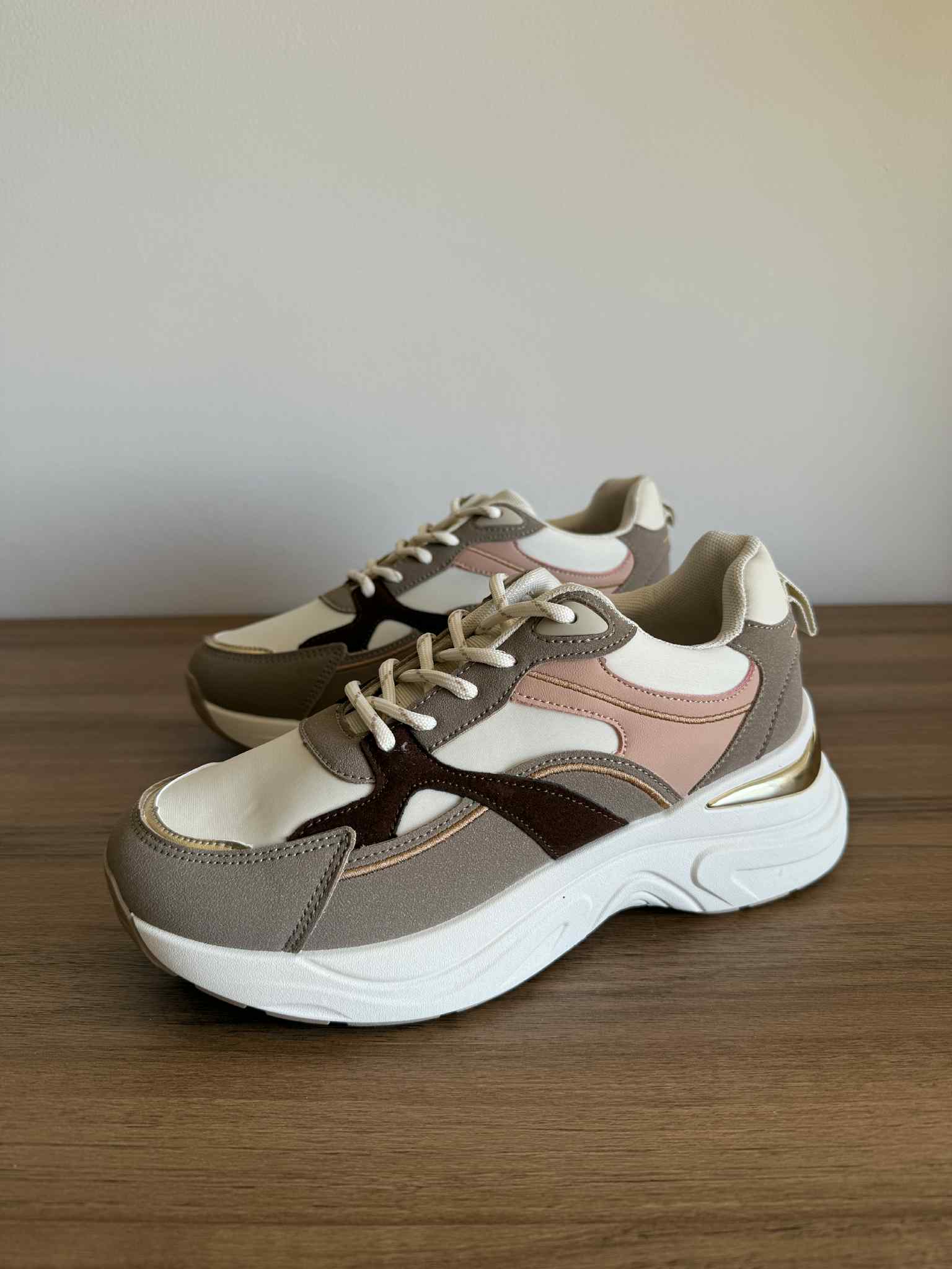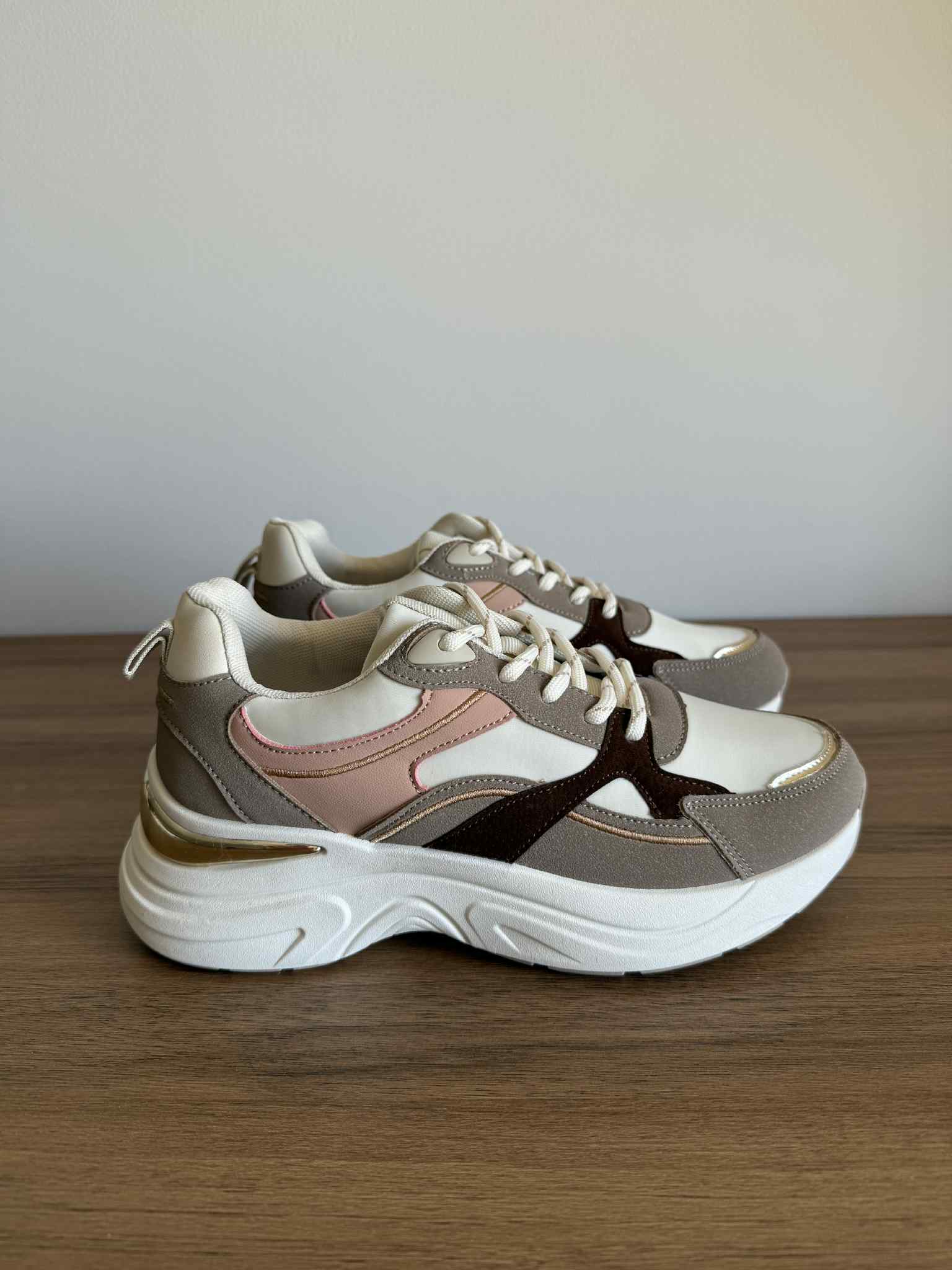 Sapatilha feminina com atacador. Design moderno, com sola chunky e aplicação dourada na sola.