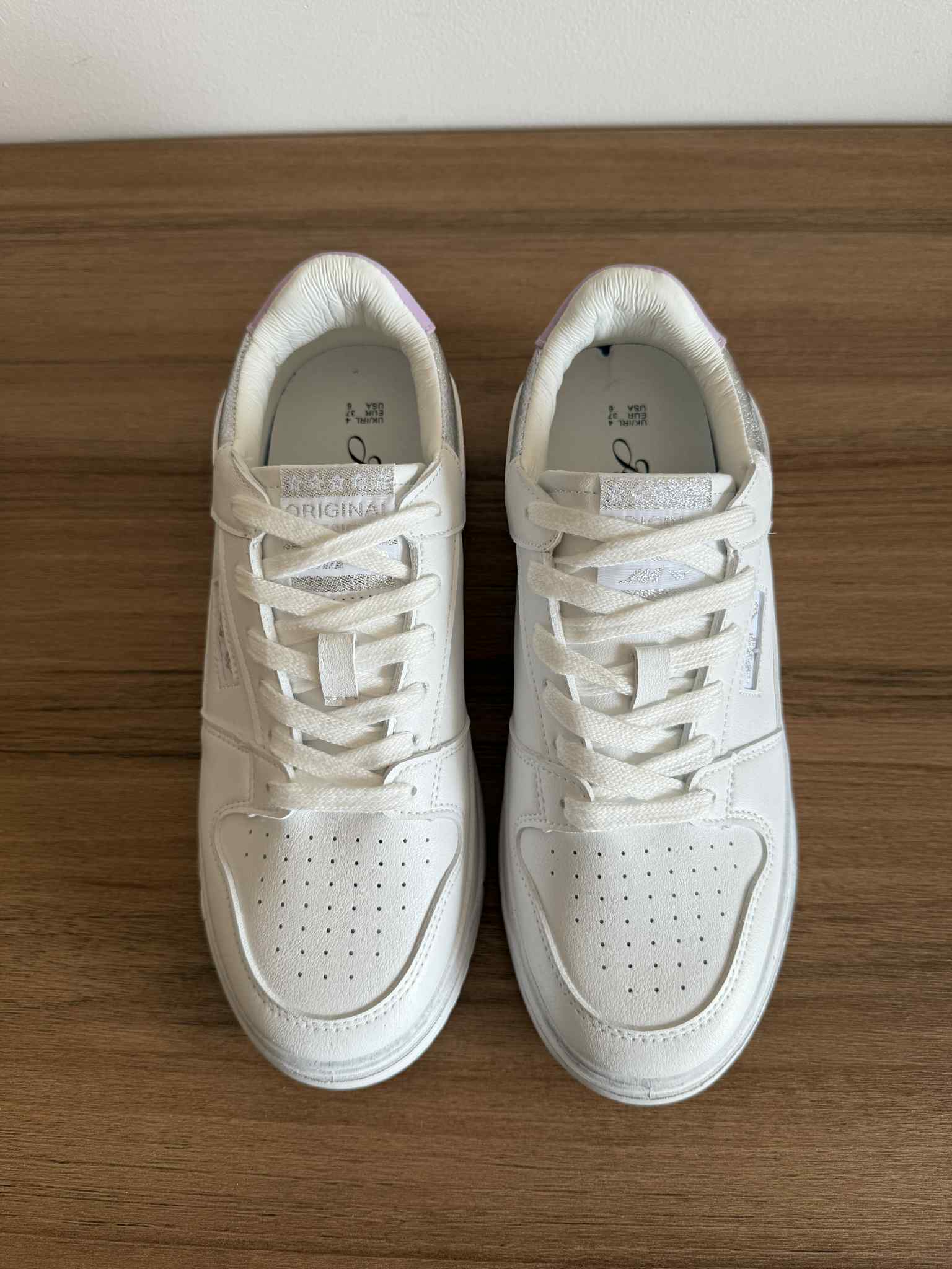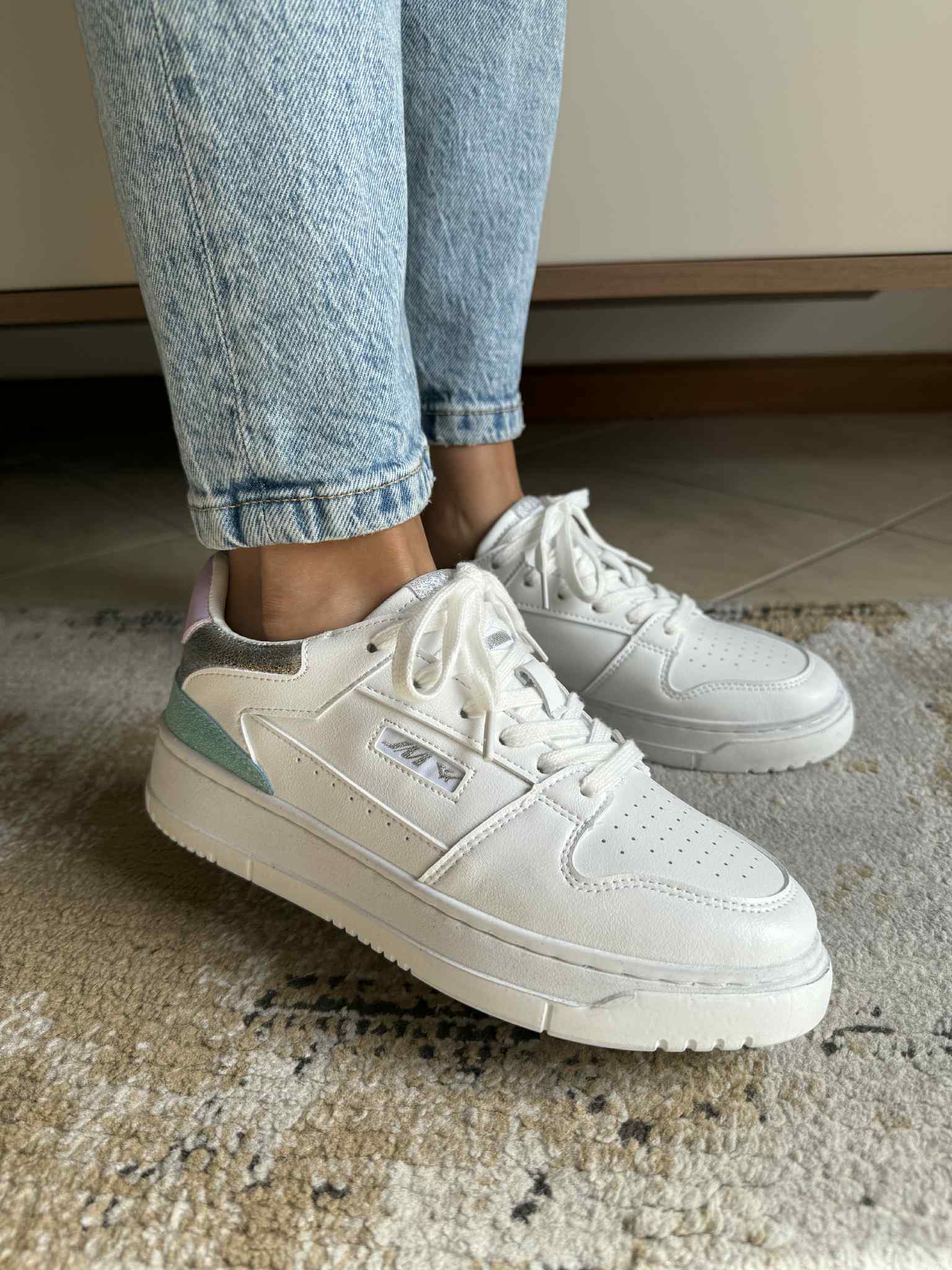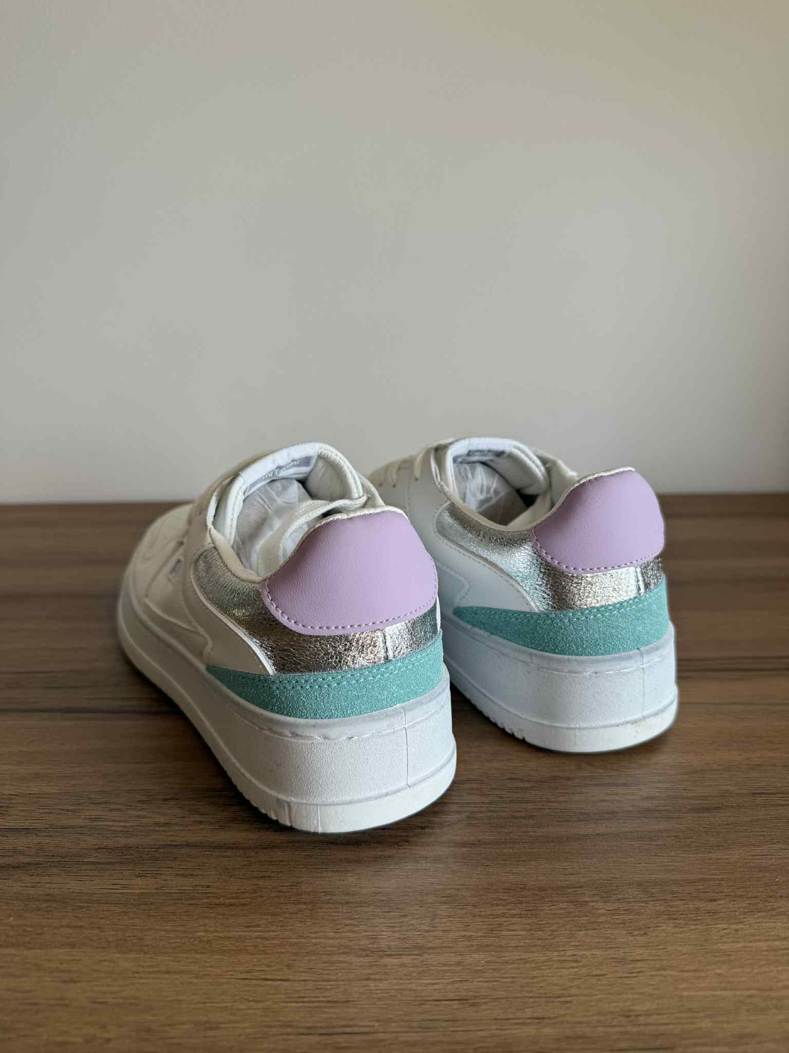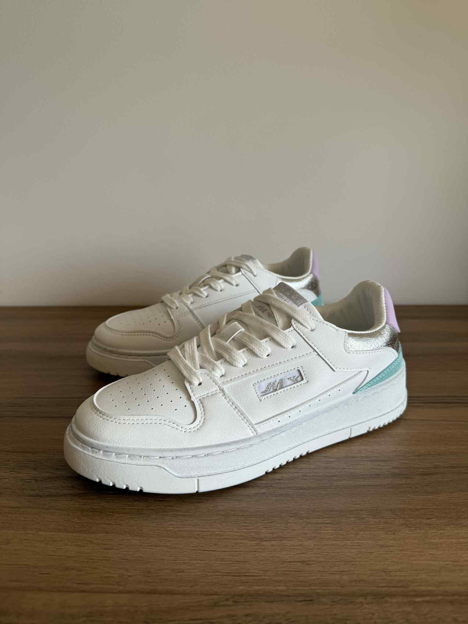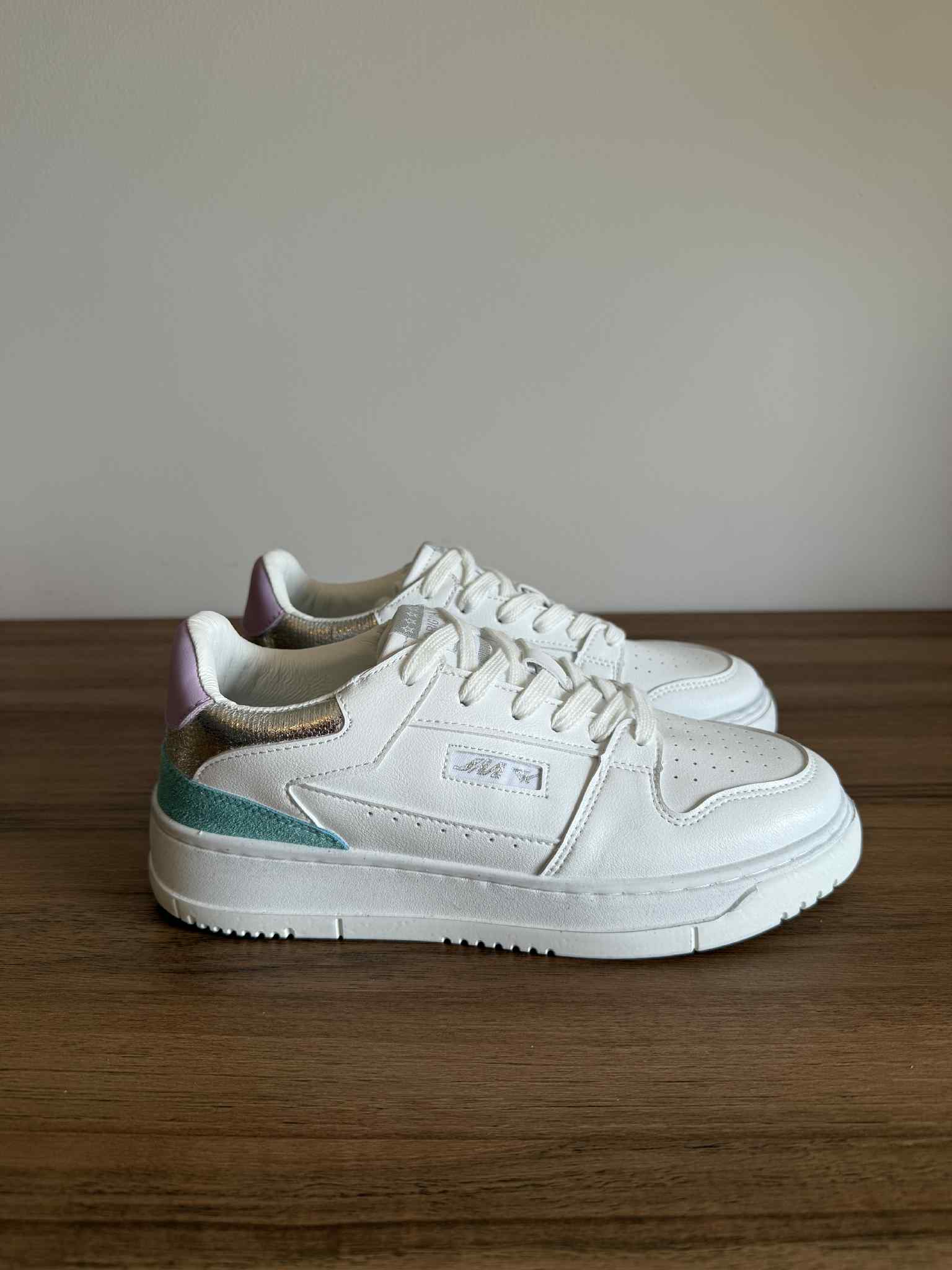 Sapatilha branca, em pele sintética. Com detalhes multicor na zona no calcanhar. Sola efeito “usado”.
