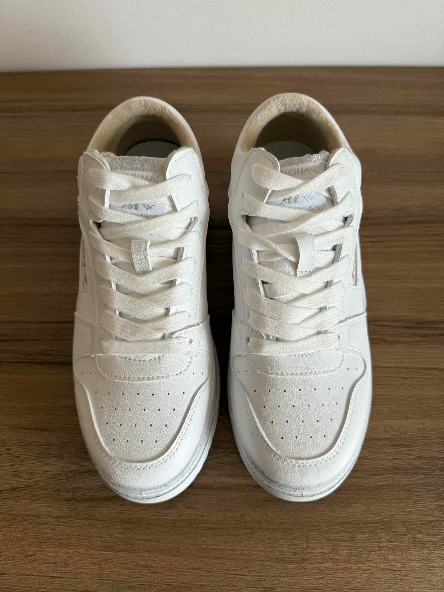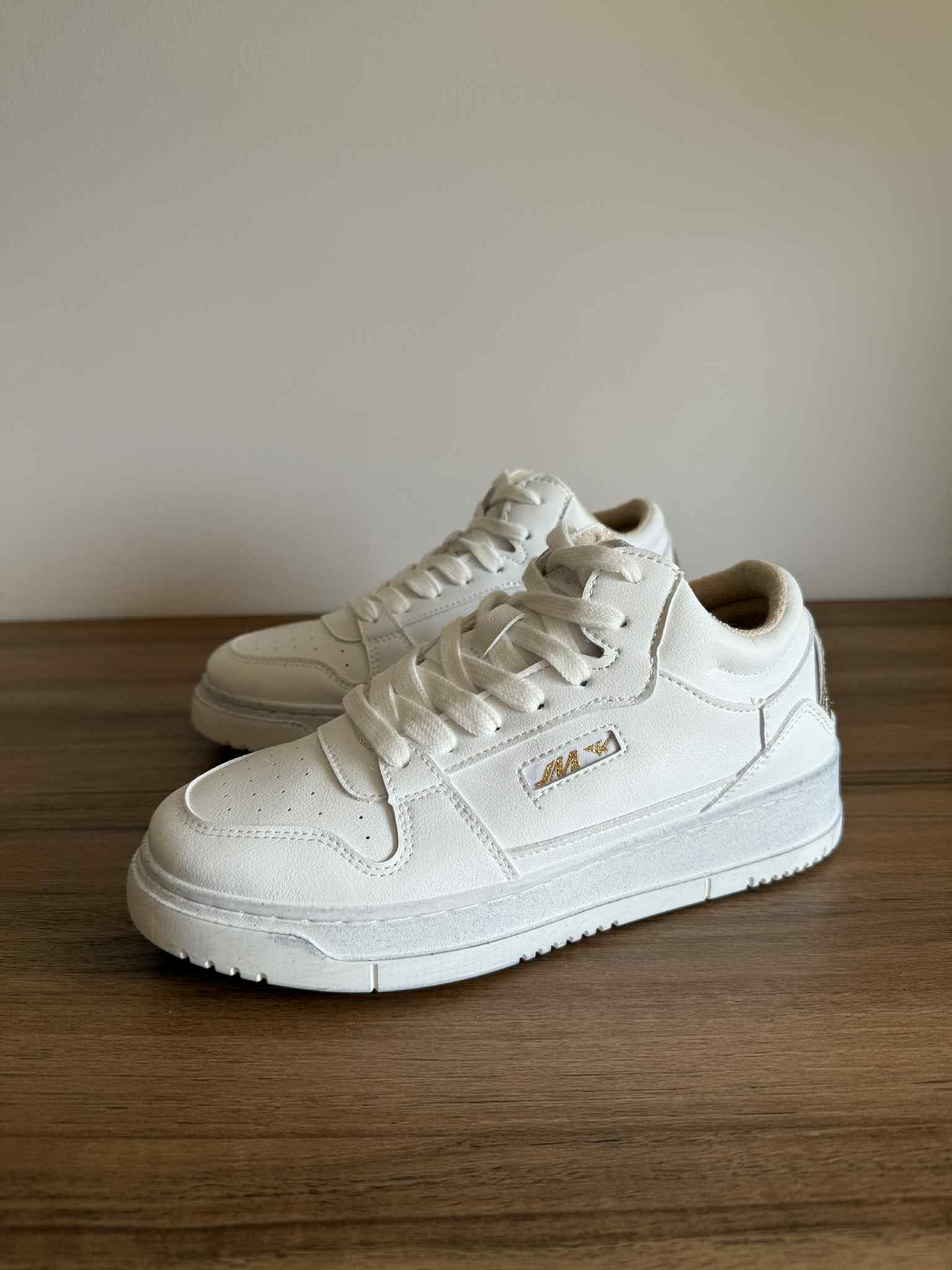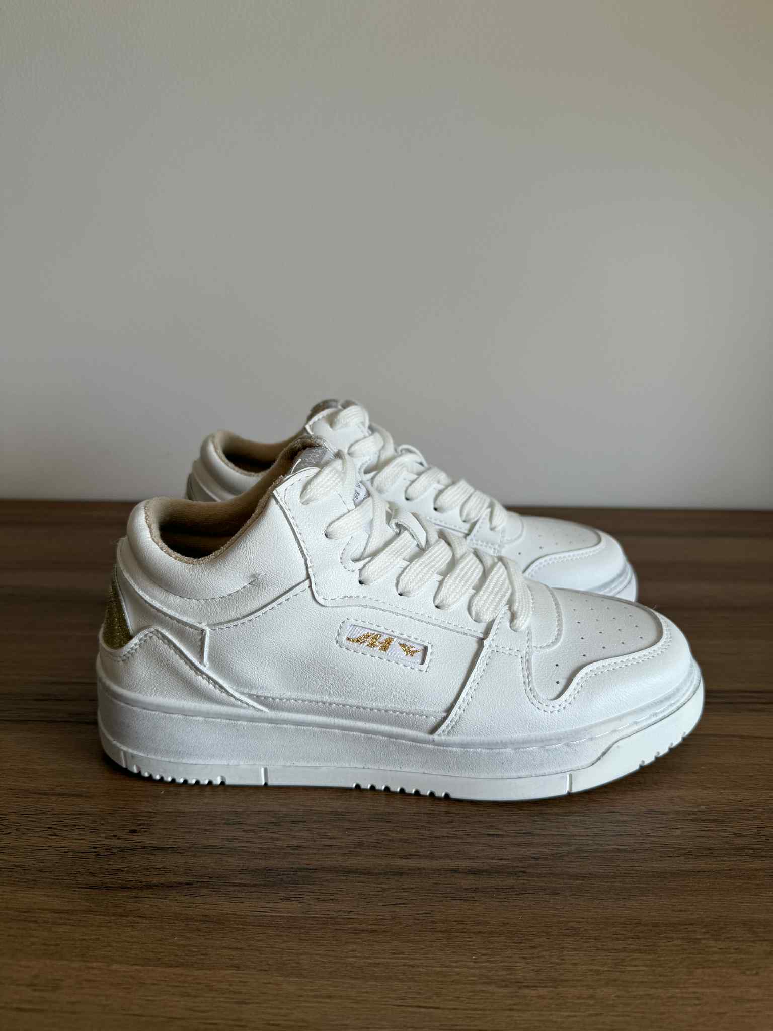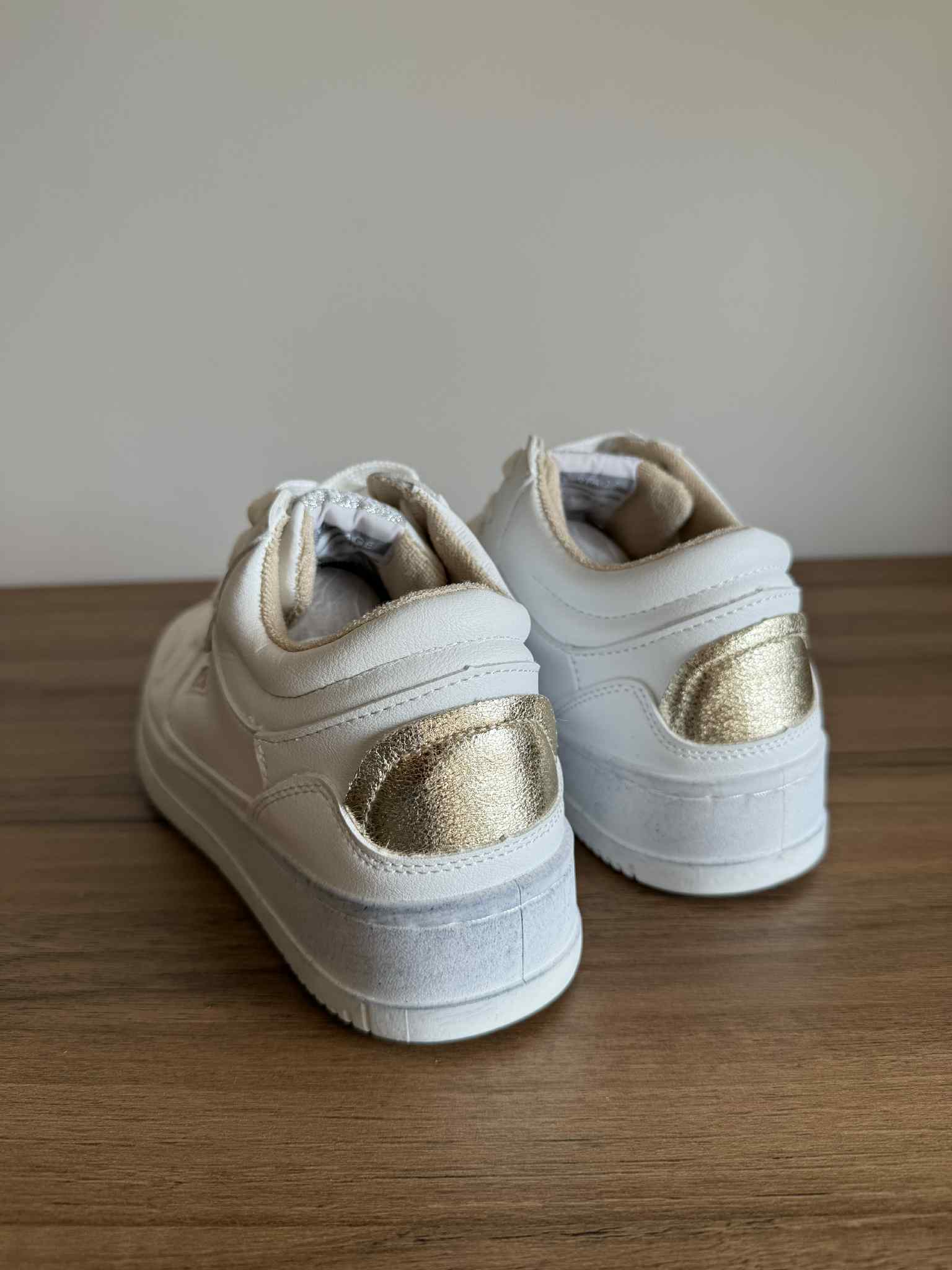 Sapatilha branca, em pele sintética. Com cano ligeiramente subido. Detalhe dourado na zona no calcanhar. Sola efeito “usado”.