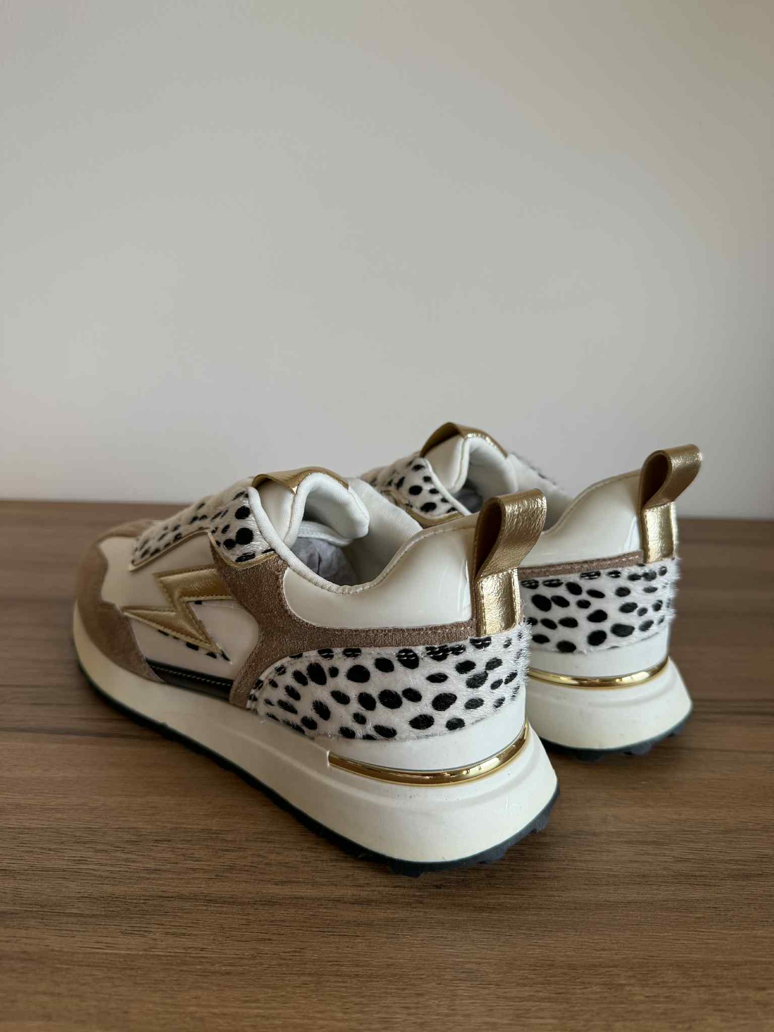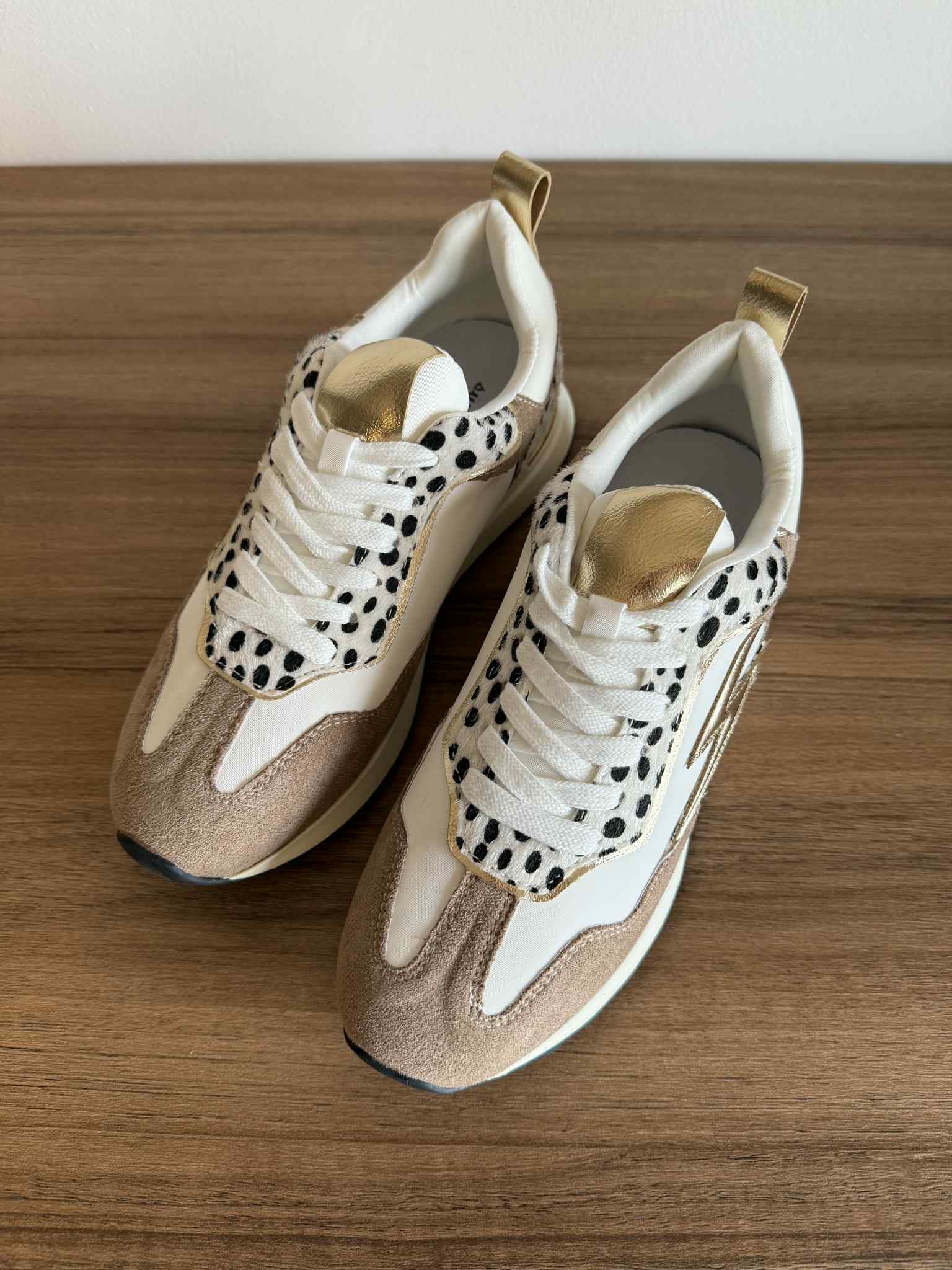Sapatilha feminina. Com atacador. Sola de borracha. Design moderno. Em pele sintética e camurça. Tons de branco, taupe, dourado e padrão animal. Palmilha almofadada.