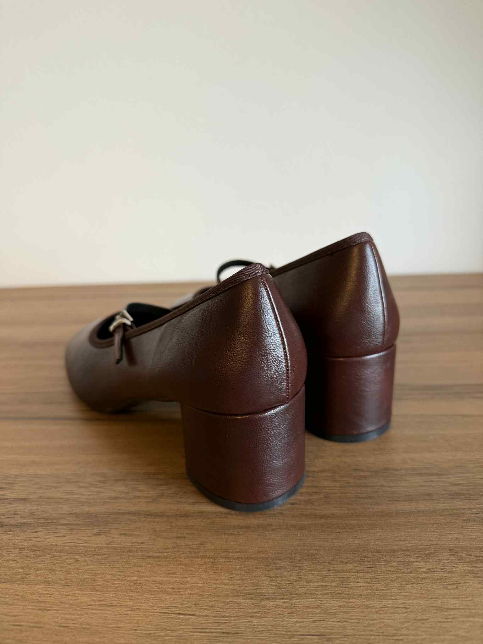 Sapato de mulher, estilo mary jane. Em pele sintética. Detalhe de fita com fivela ajustável. Salto bloco com 5cm de altura. Interior em têxtil muito macio e confortável. Frente redonda.