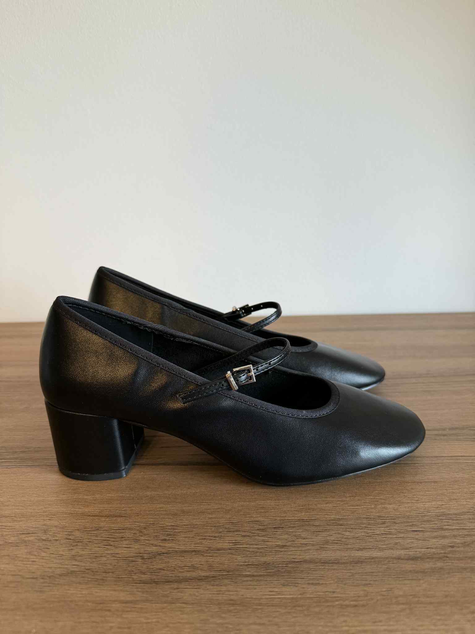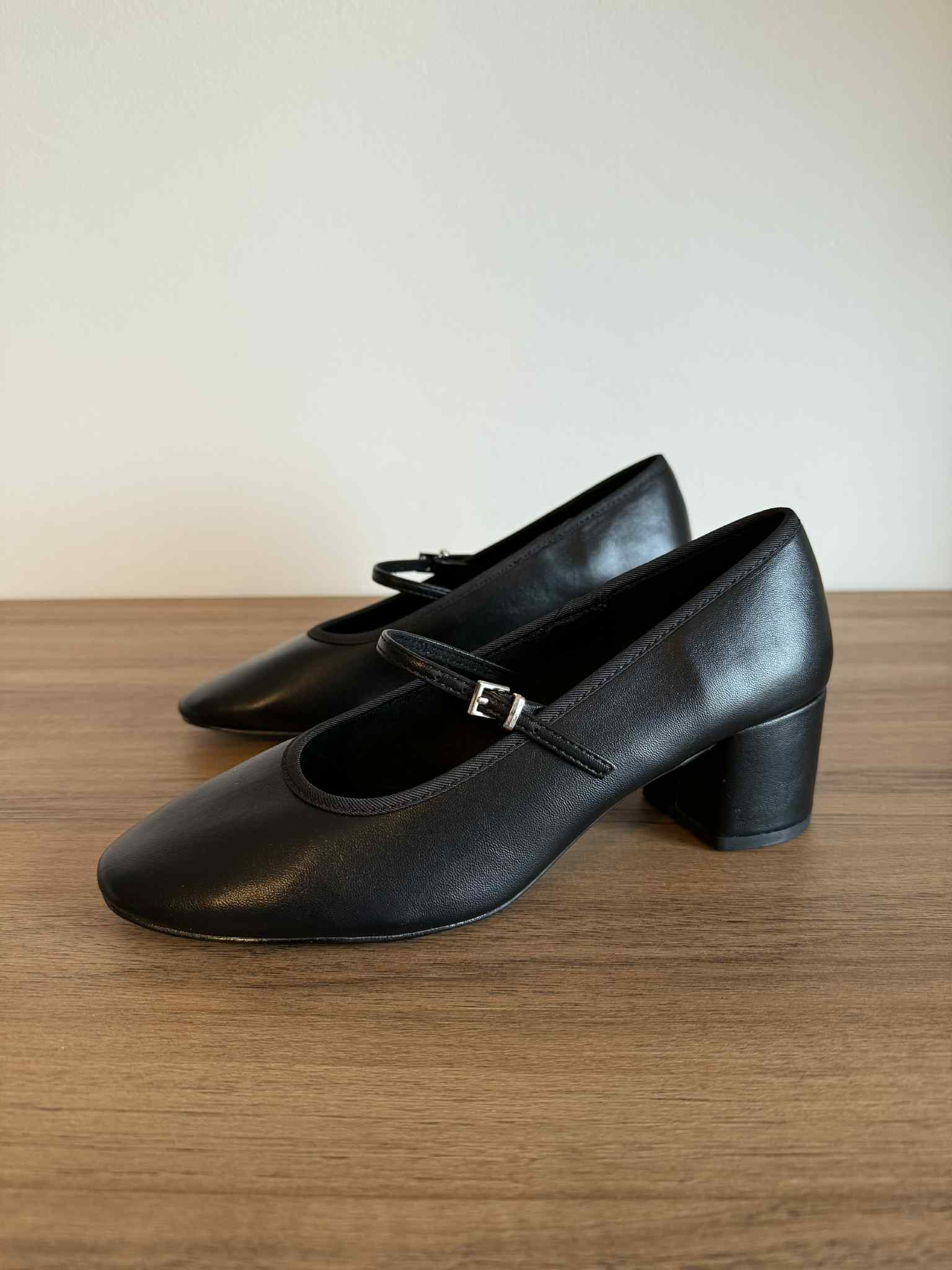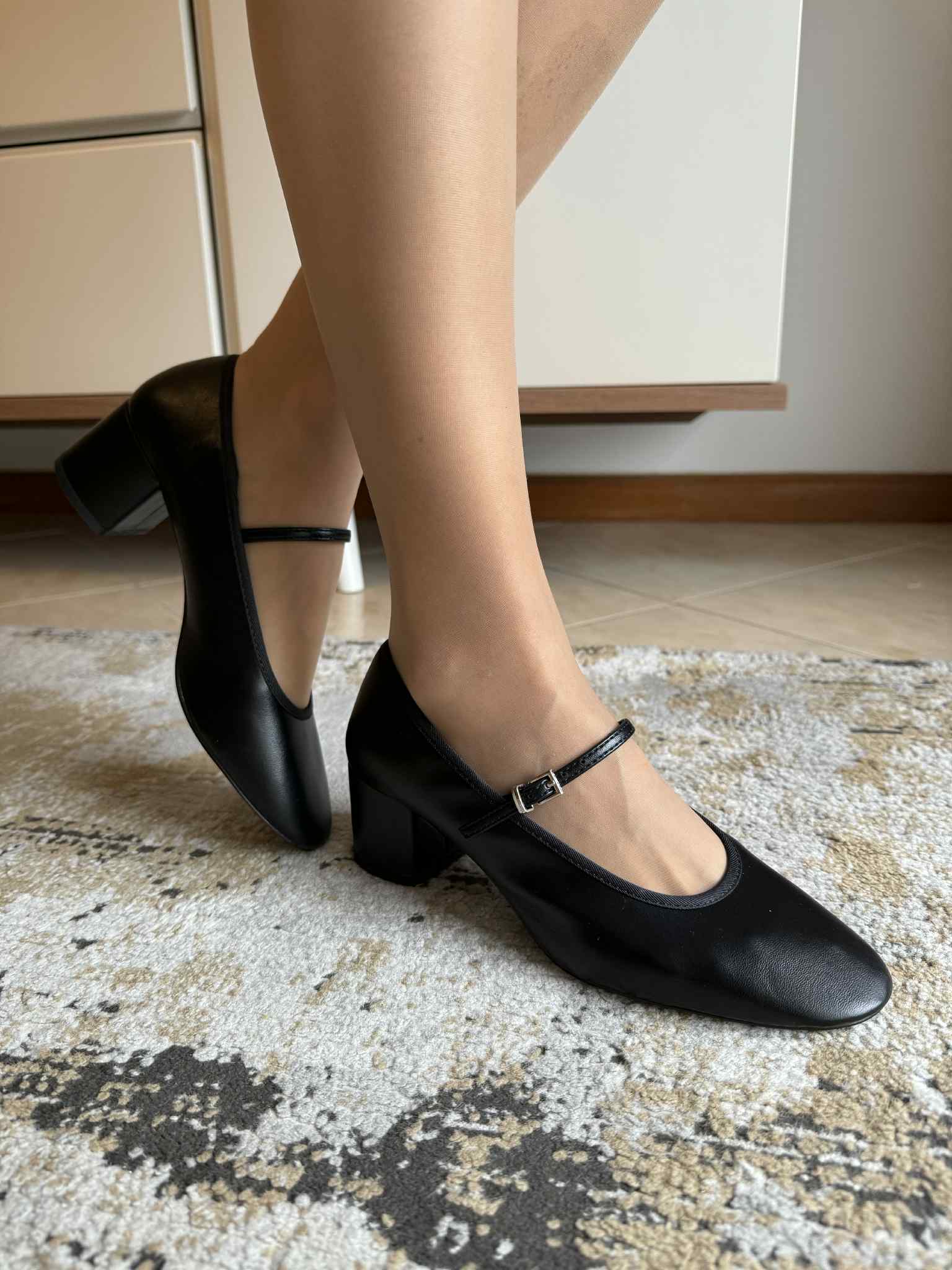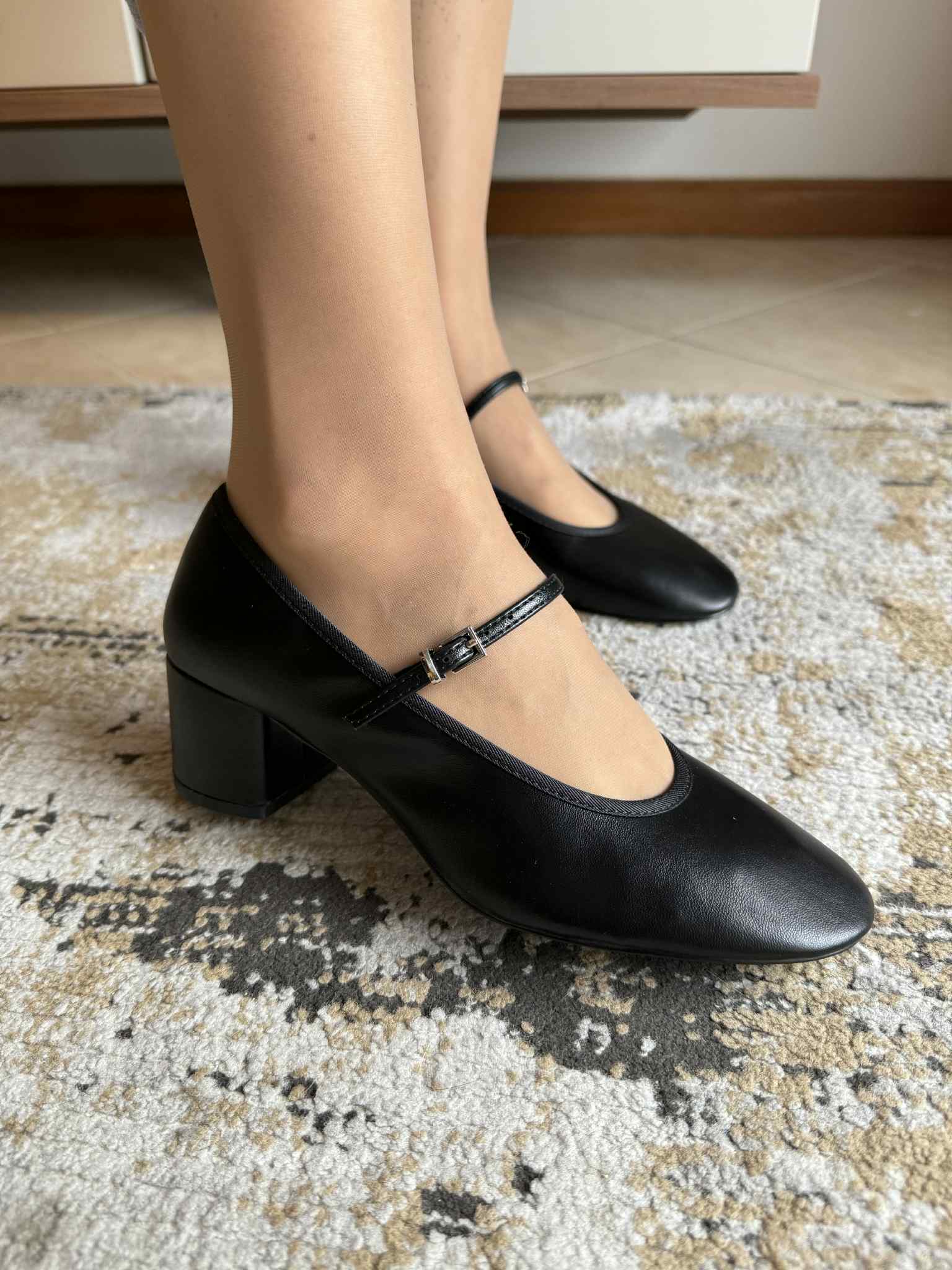 Sapato de mulher, estilo mary jane. Em pele sintética. Detalhe de fita com fivela ajustável. Salto bloco com 5cm de altura. Interior em têxtil muito macio e confortável. Frente redonda.