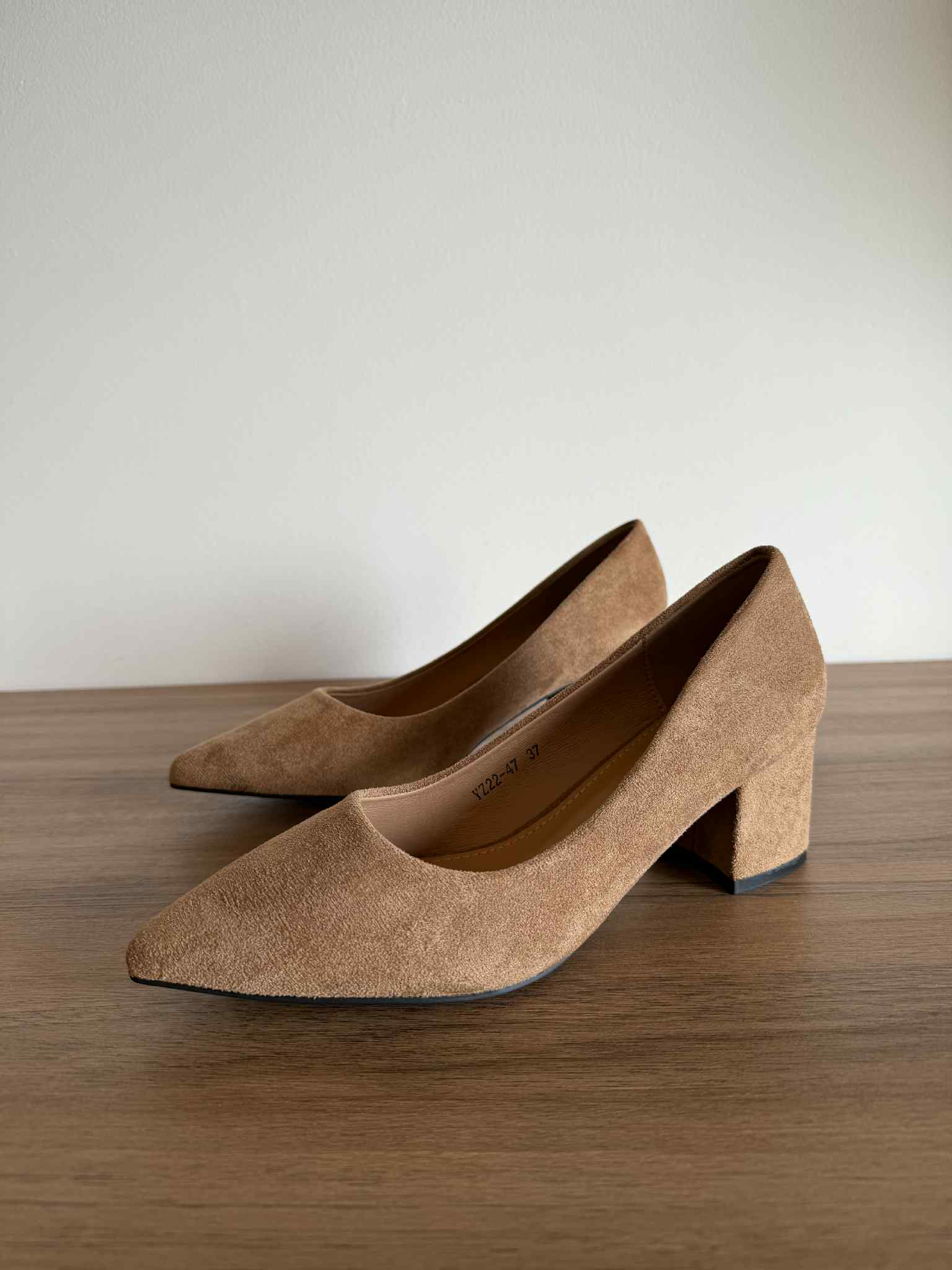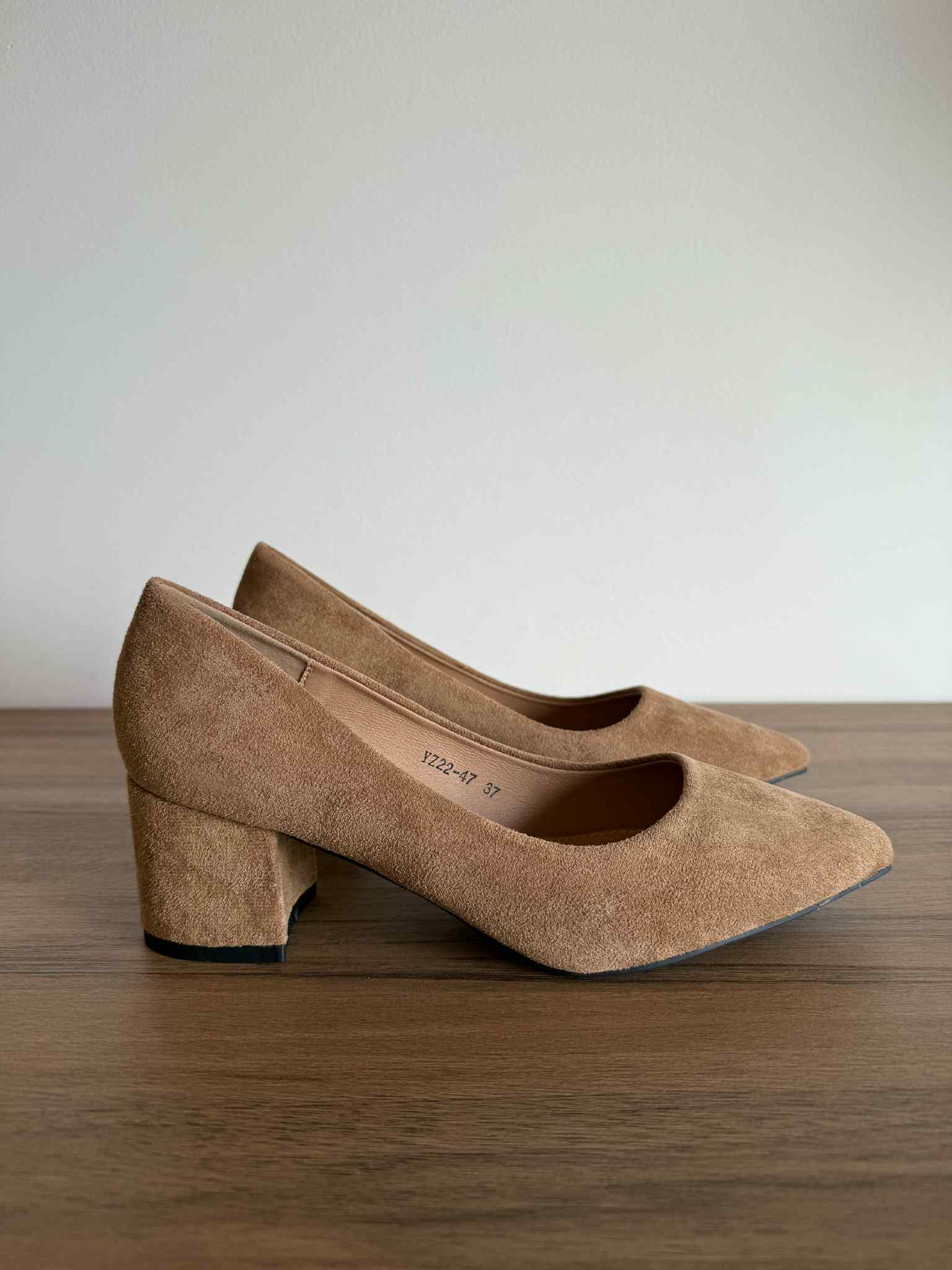 Sapato bicudo, com salto largo de 5.5cm de altura.