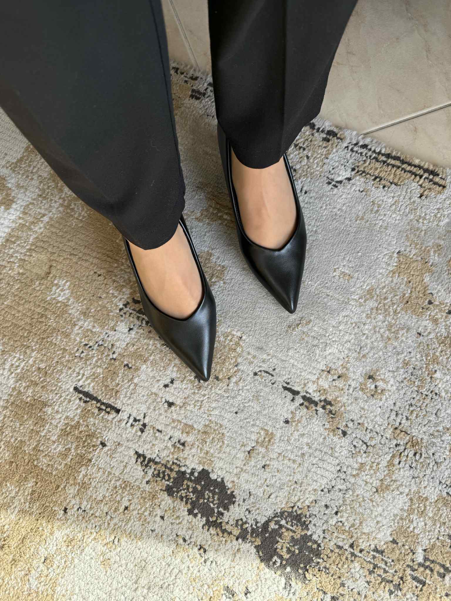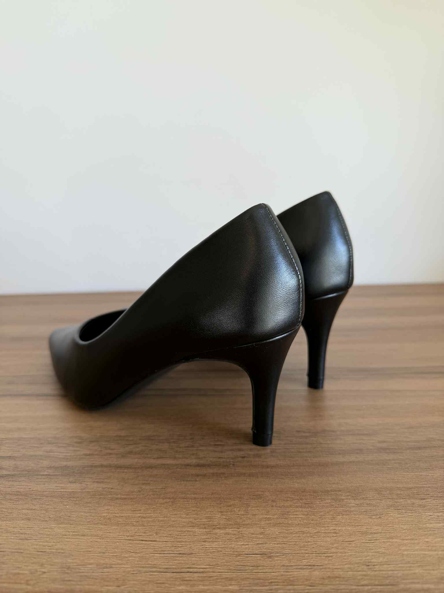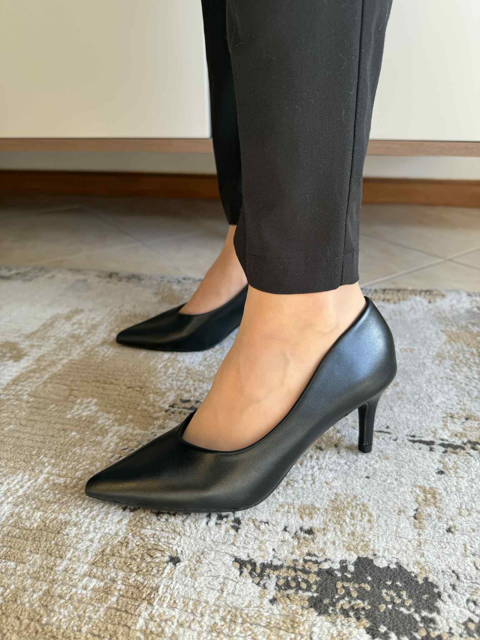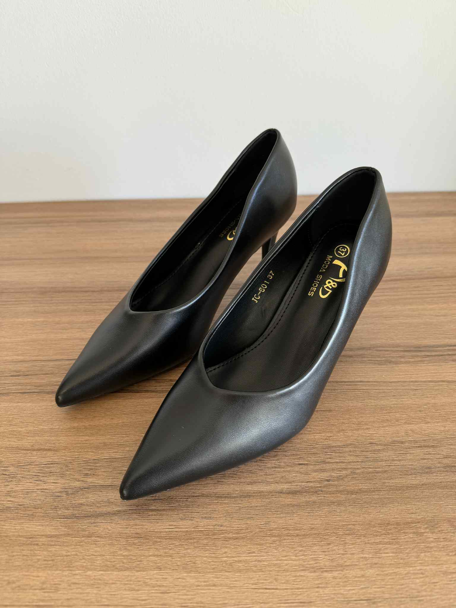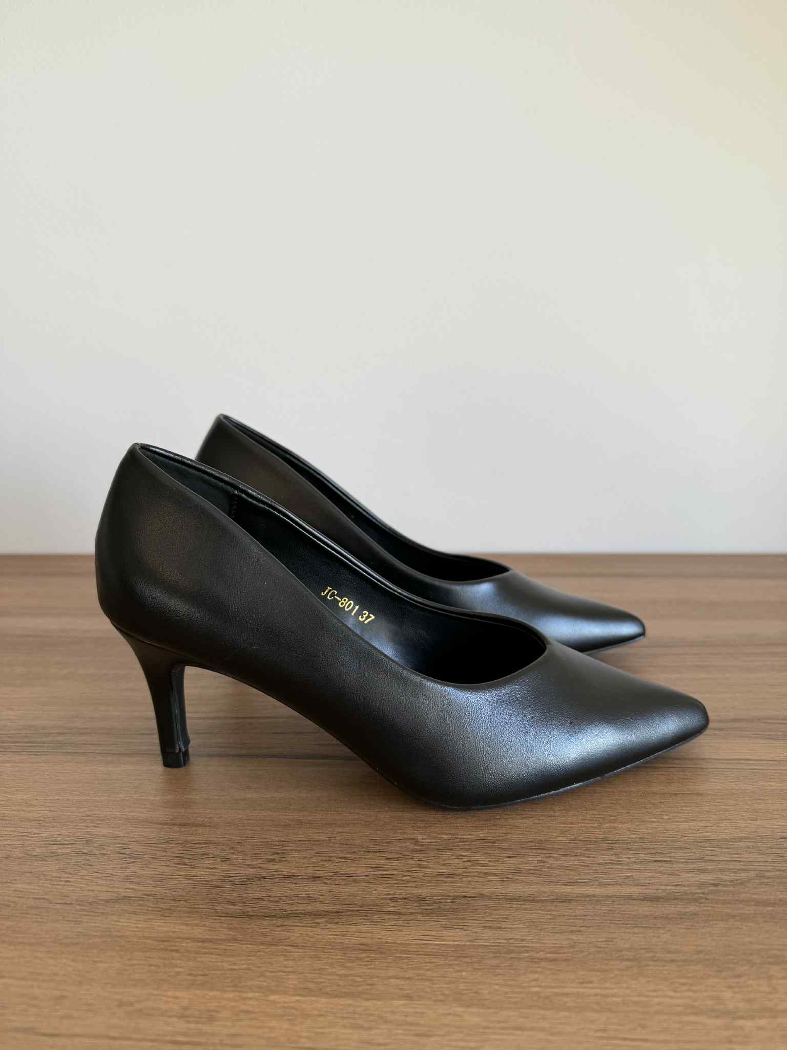 Sapato de mulher clássico, com frente bicuda e tacão fino com 6.5cm de altura. Em pele sintética.