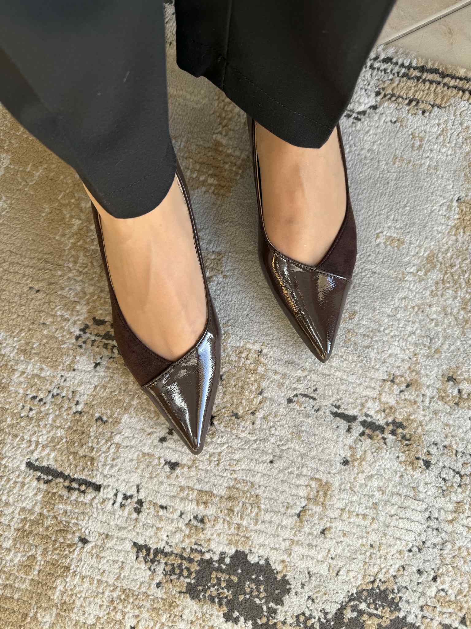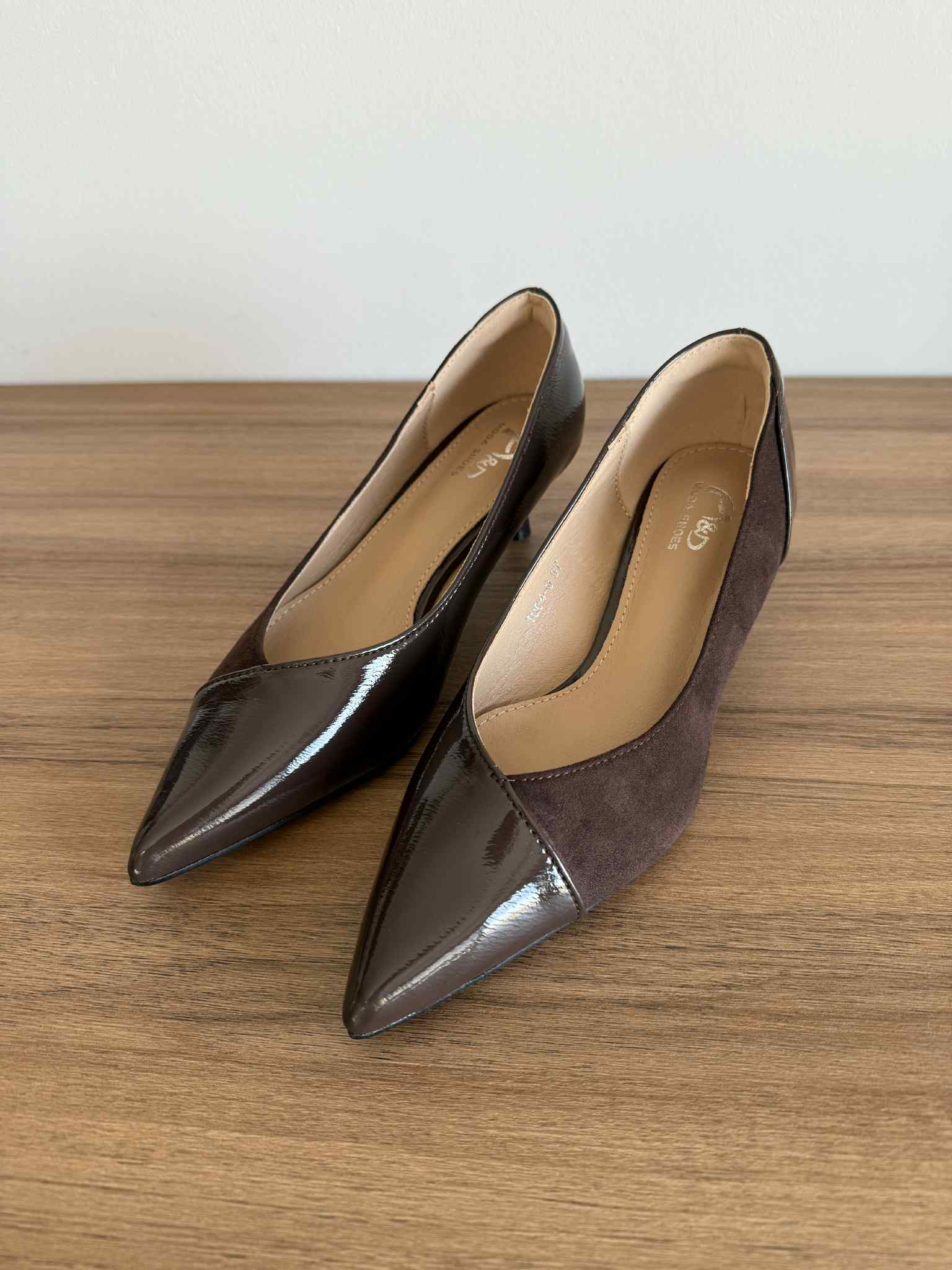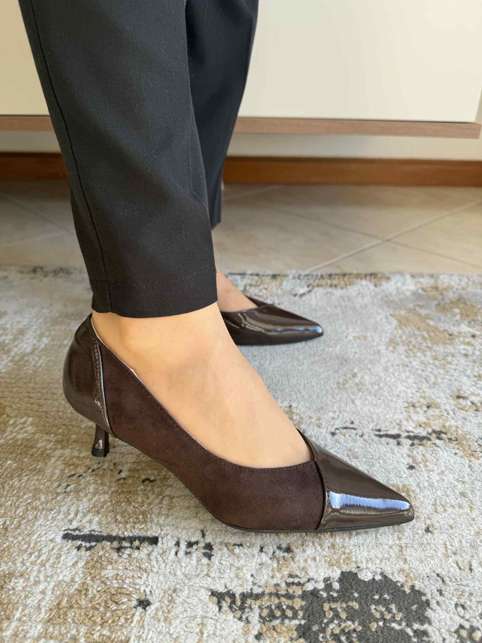 Sapato de mulher clássico, com frente bicuda e tacão fino com 4.5cm de altura. Em camurça sintética e com detalhes a pele envernizada.