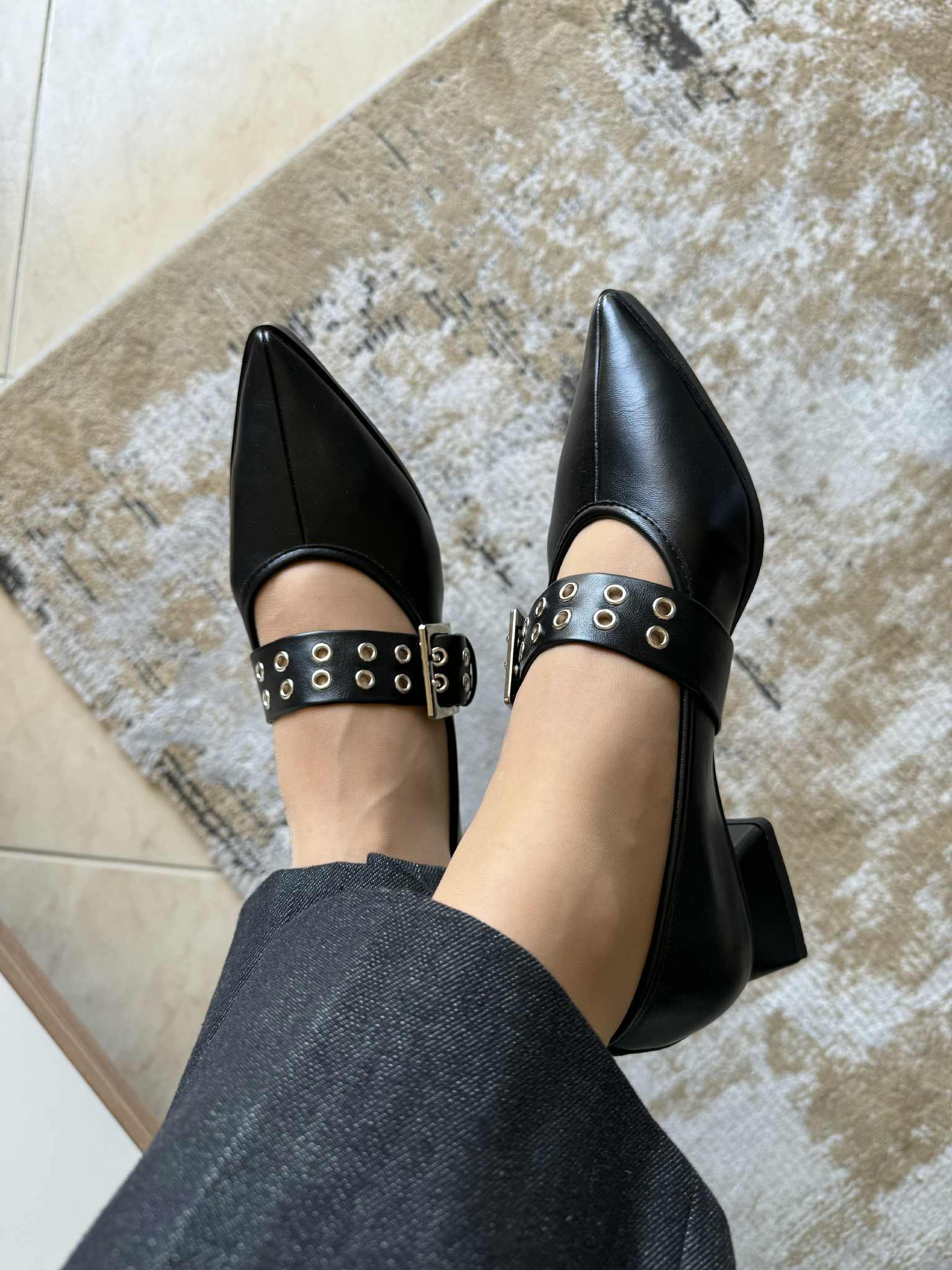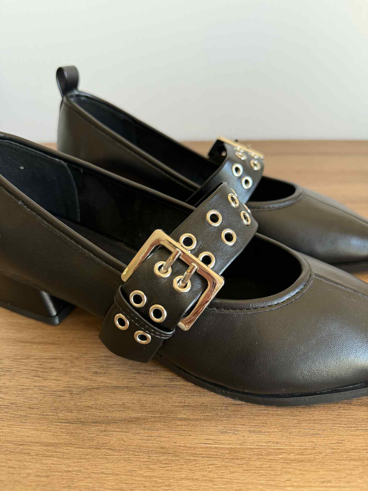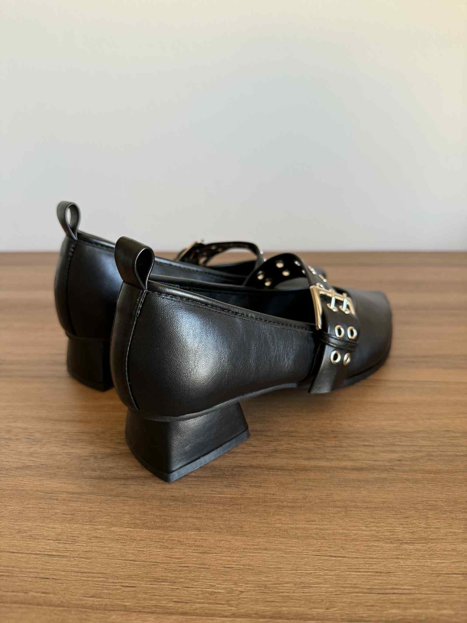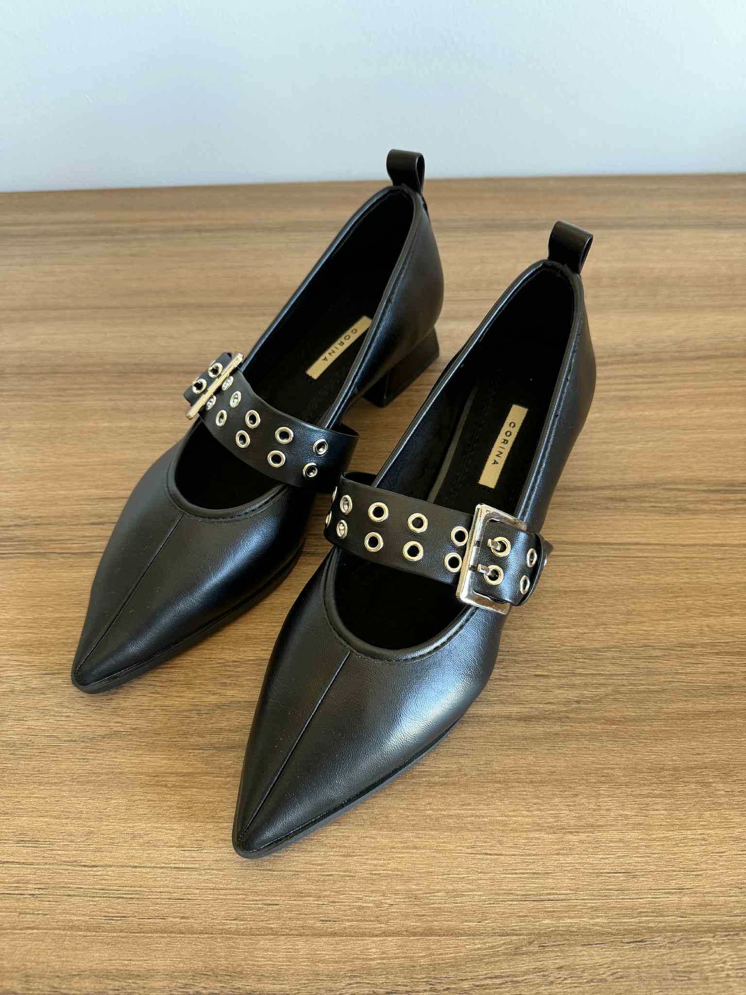 Sapato da marca Corina. Exterior em pele sintética maleável. Interior em têxtil macio. Com detalhe de tira e fivela no peito do pé. Salto largo com 3cm de altura.