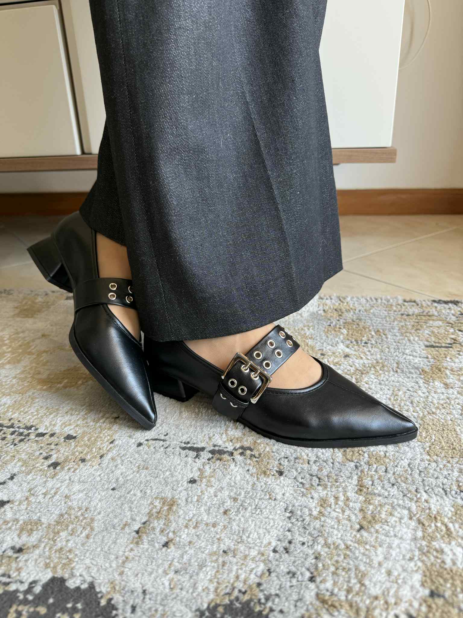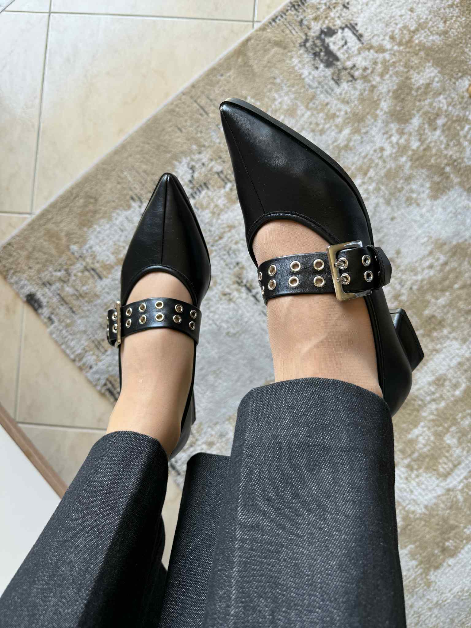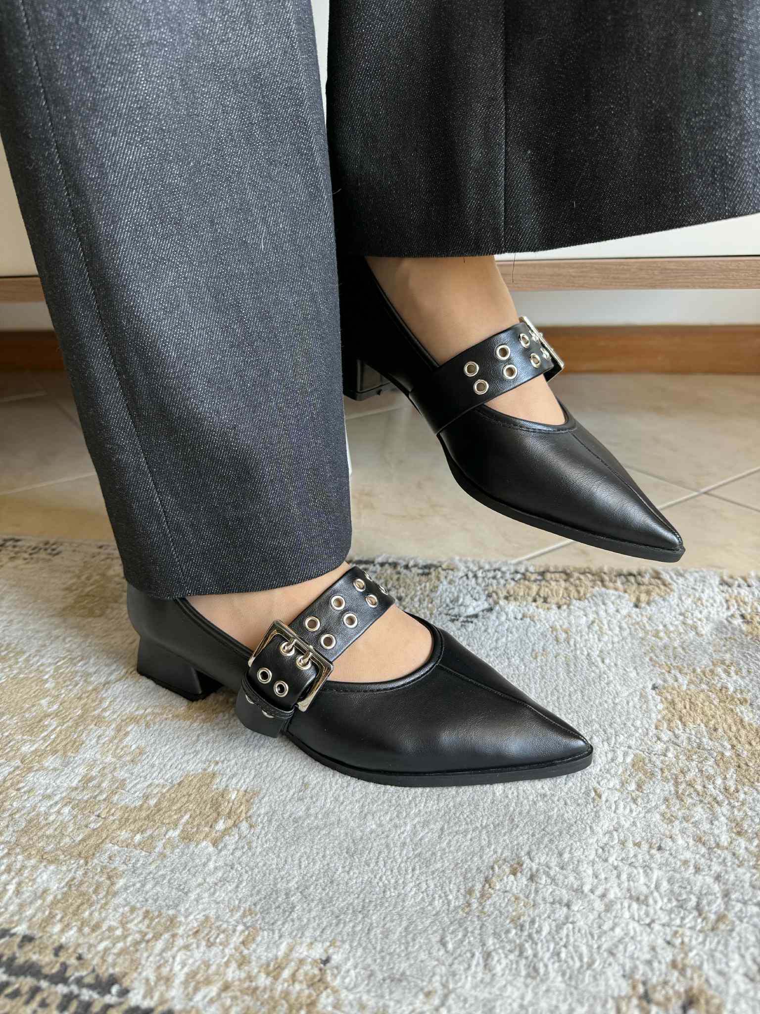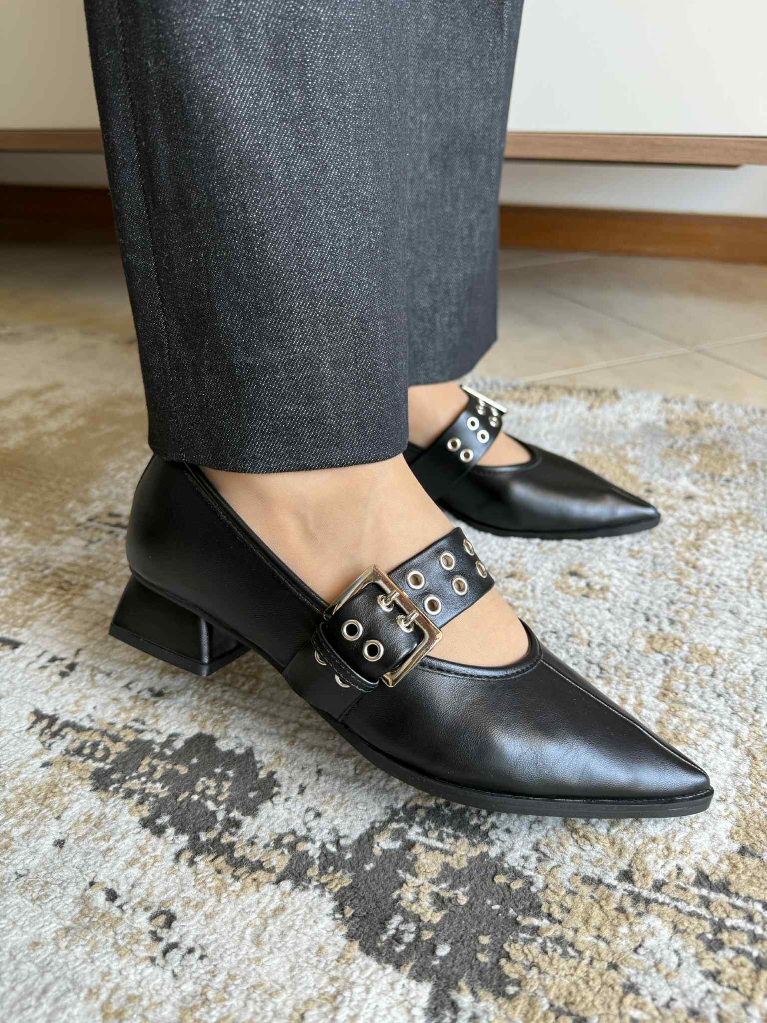 Sapato da marca Corina. Exterior em pele sintética maleável. Interior em têxtil macio. Com detalhe de tira e fivela no peito do pé. Salto largo com 3cm de altura.