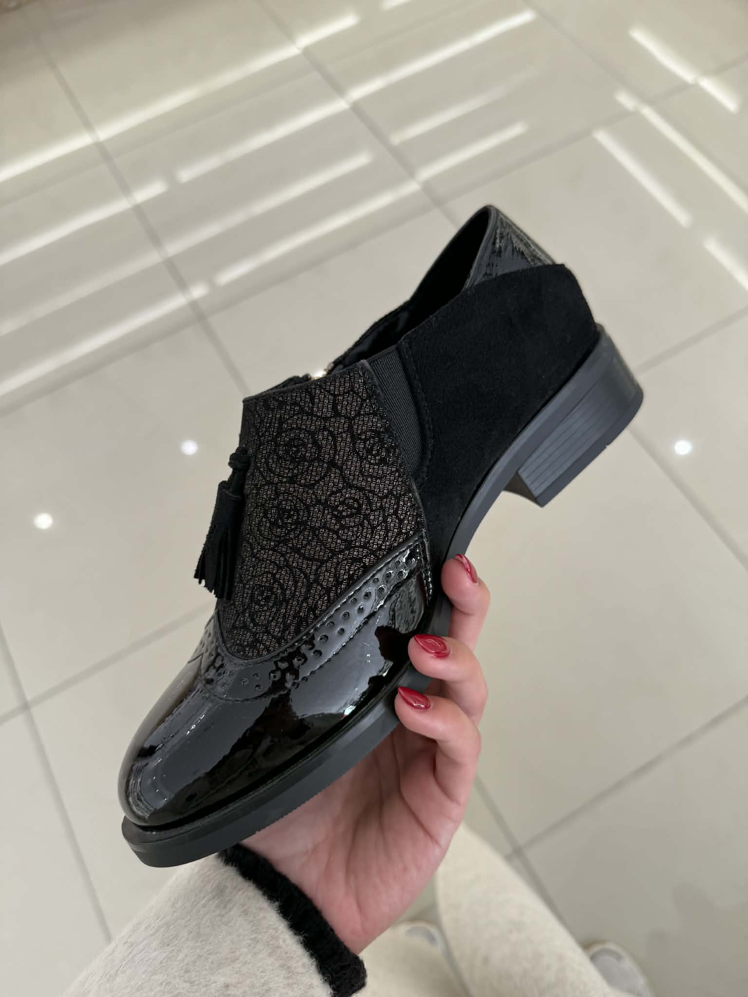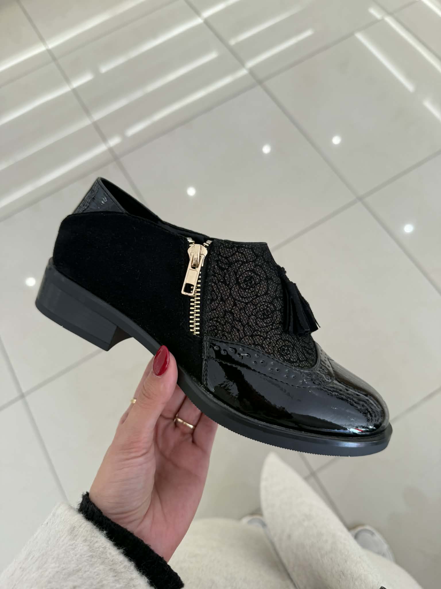 Sapato preto, em camurça sintética e detalhes em pele sintética envernizada. Efeito florido. Fecho e elástico nas laterais. Palmilha em pele.