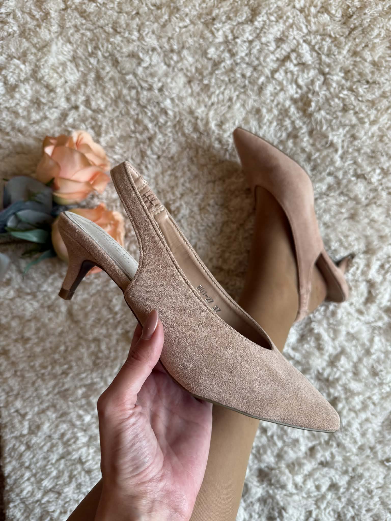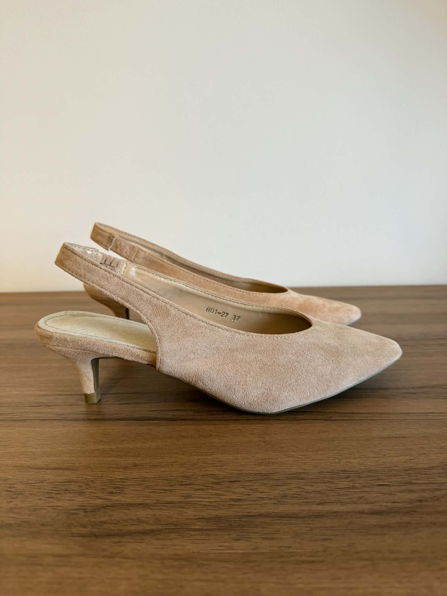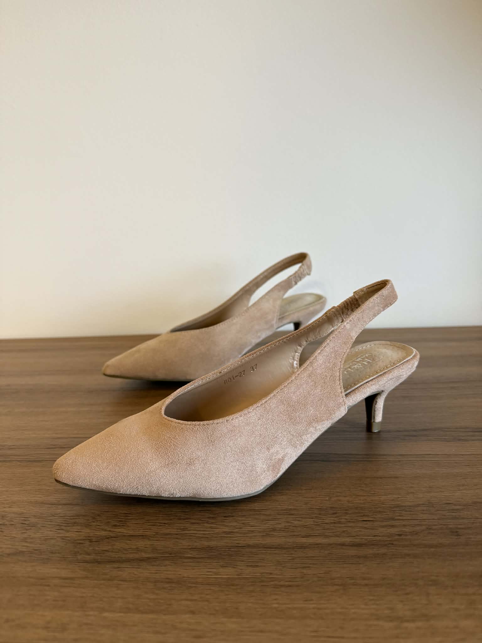 Sapato bicudo, estilo slingback, aberto atrás. Tacão curto e fino, estilo kitten, com cerca de 5cm de altura. Em camurça sintética no exterior e palmilha em pele. Tira com elástico para melhor ajuste.