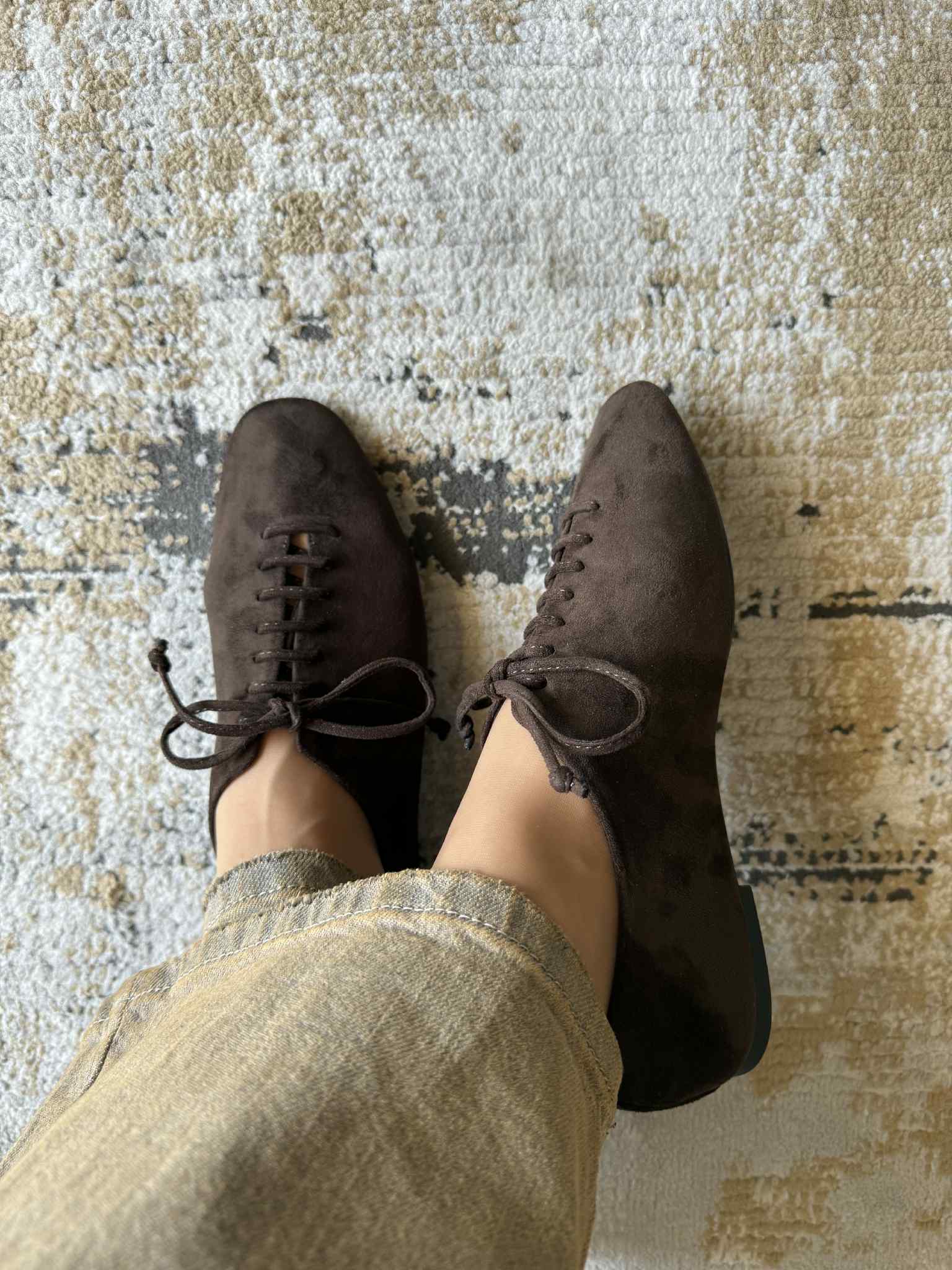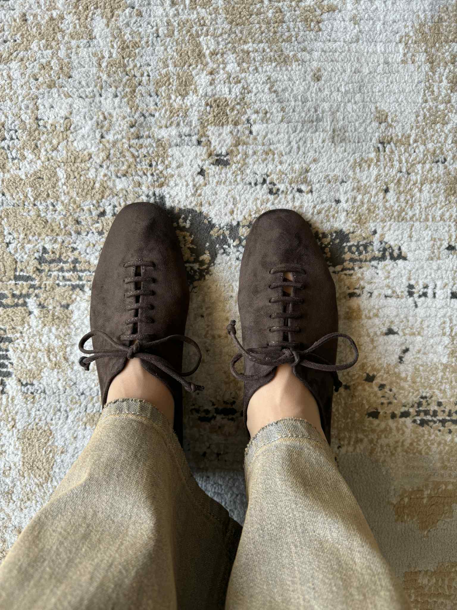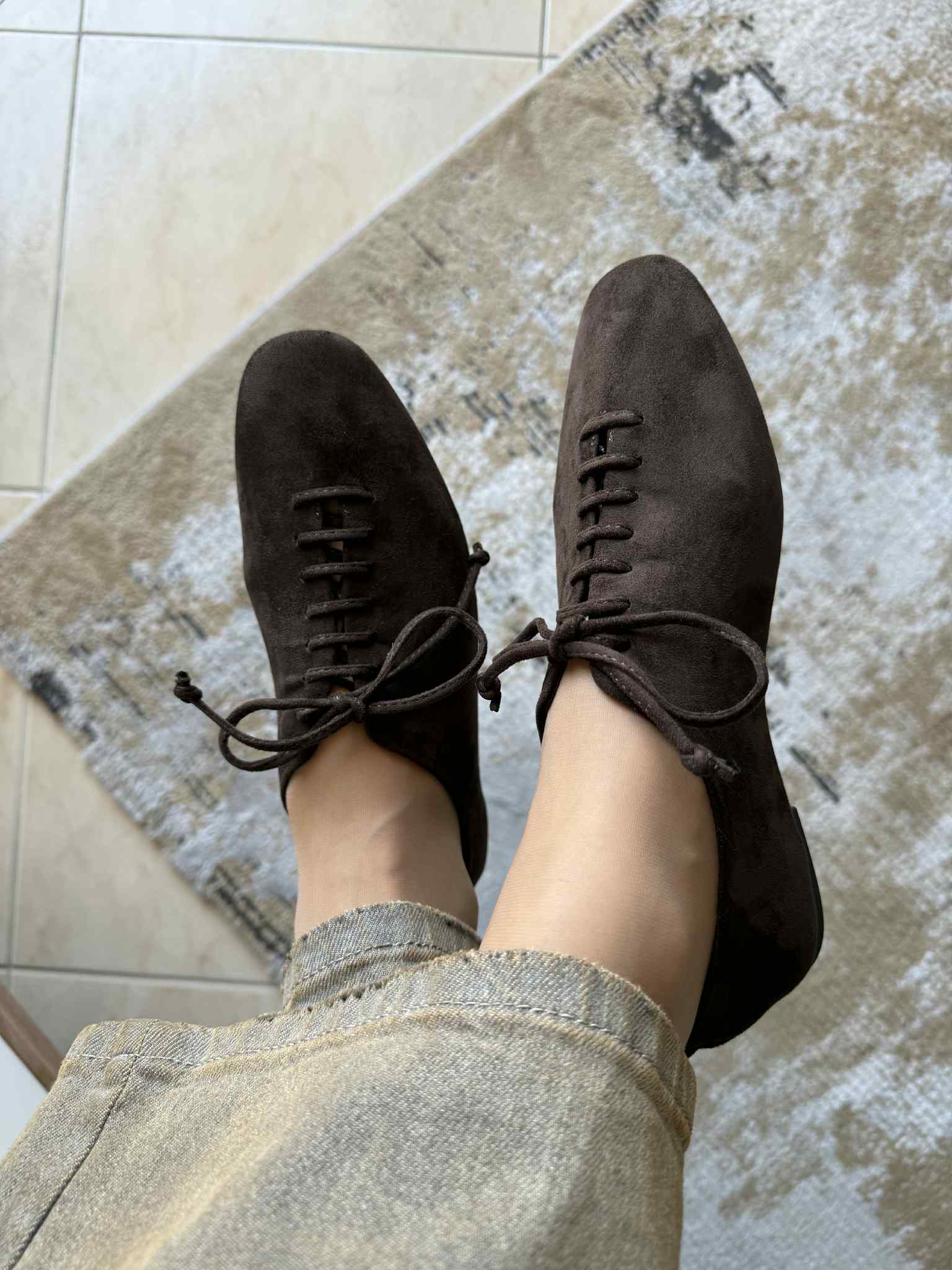 Sapato da marca Corina, com sola rasa e cordões. Em tecido aveludado tipo carmuça, muito macio e maleável. Em castanho.