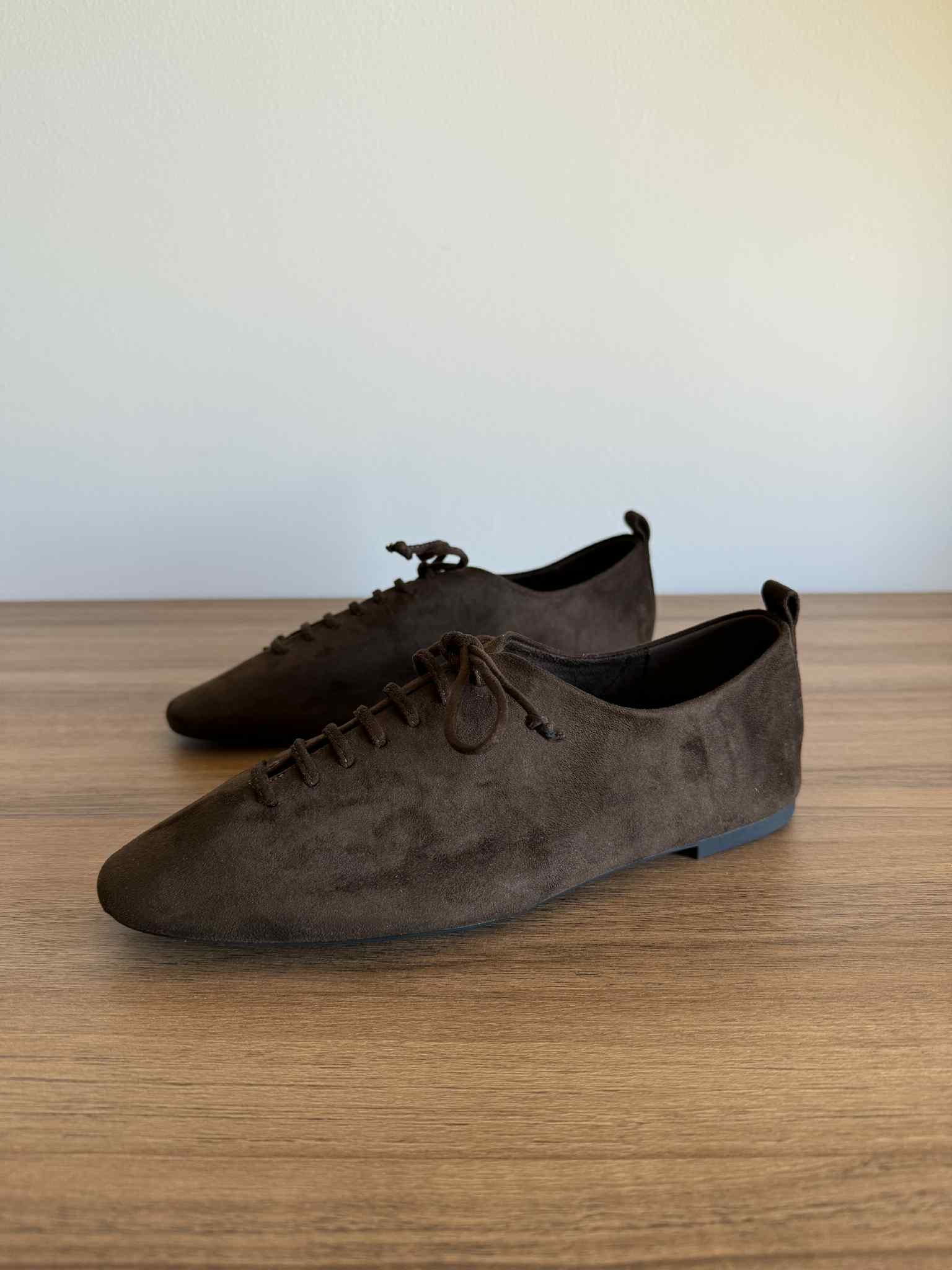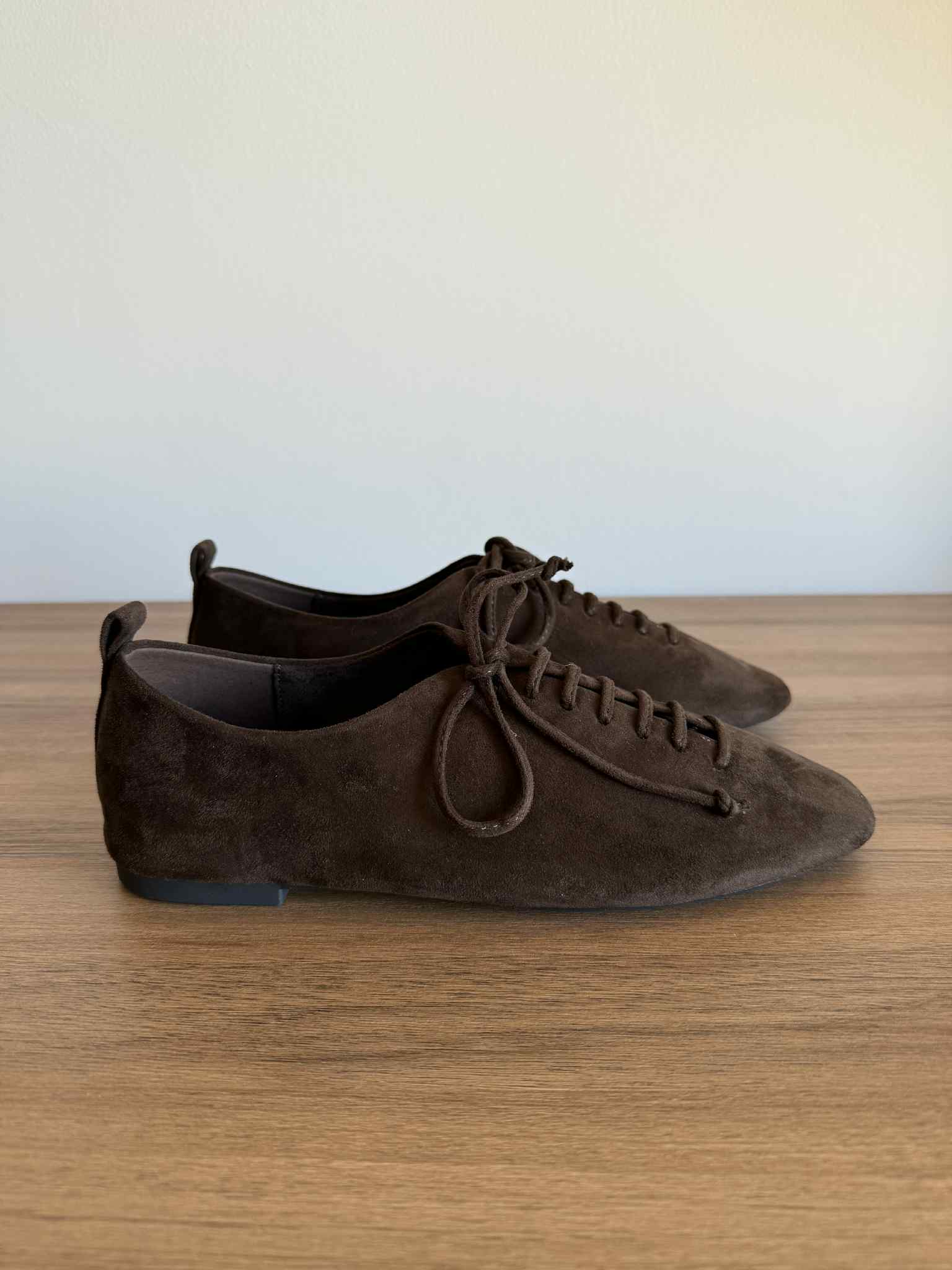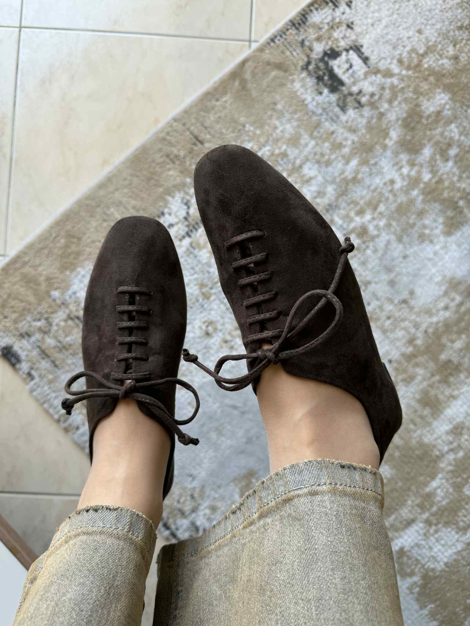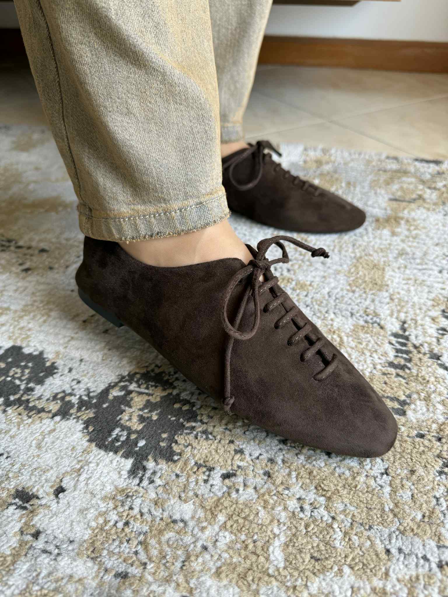 Sapato da marca Corina, com sola rasa e cordões. Em tecido aveludado tipo carmuça, muito macio e maleável. Em castanho.