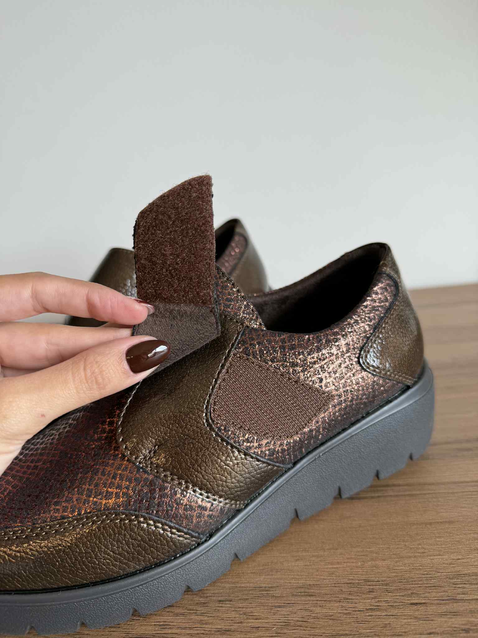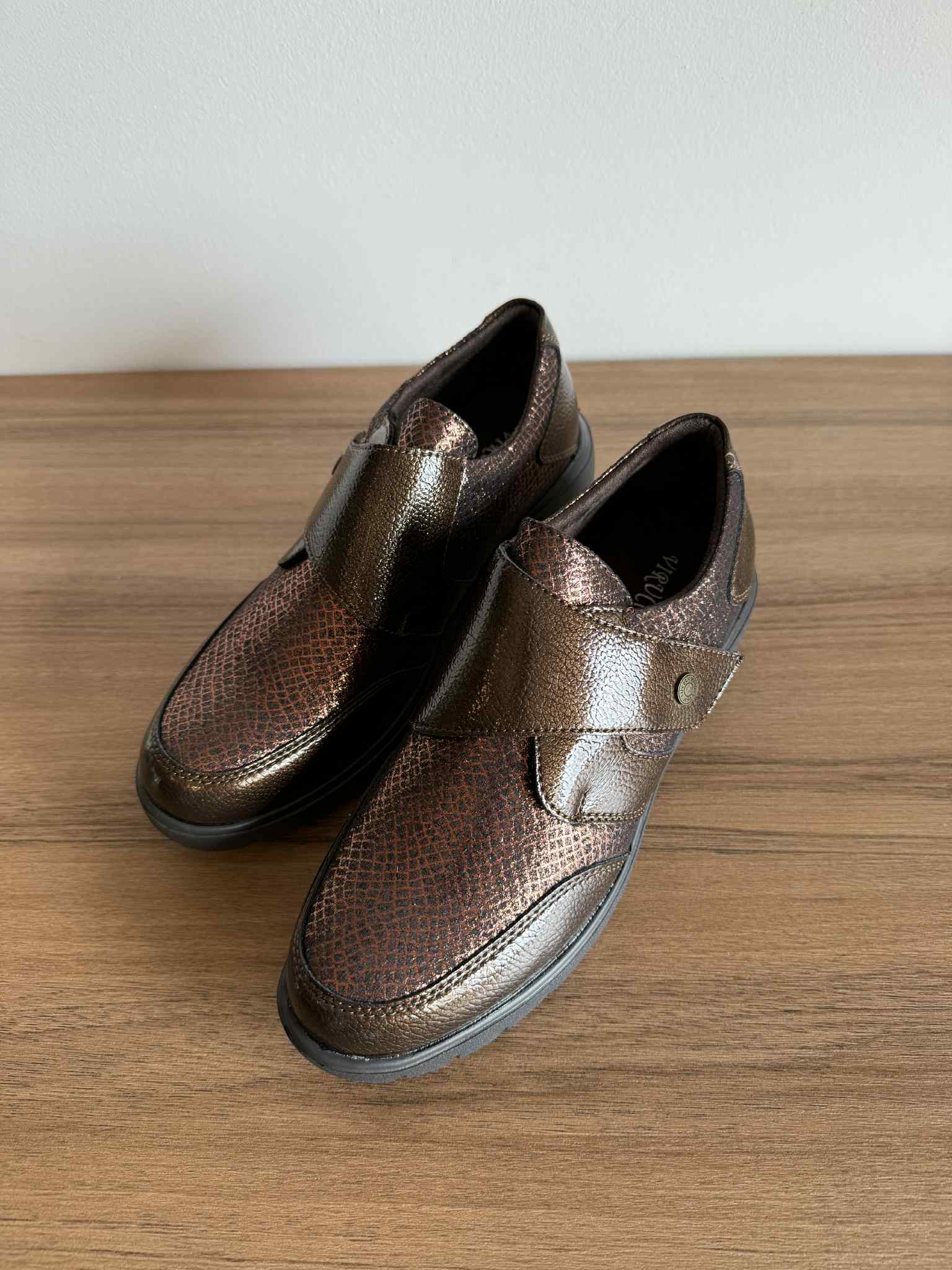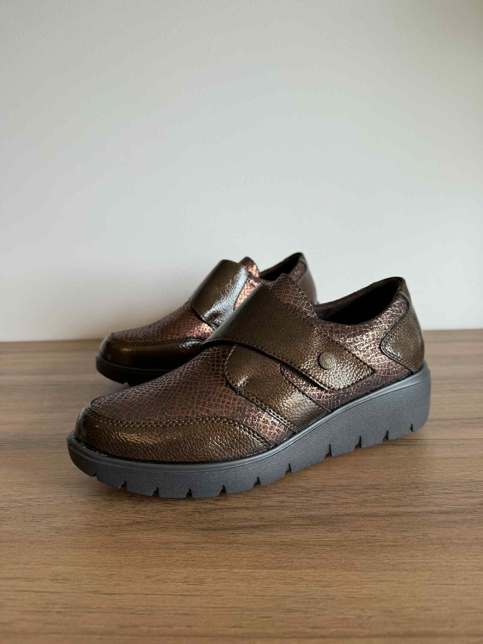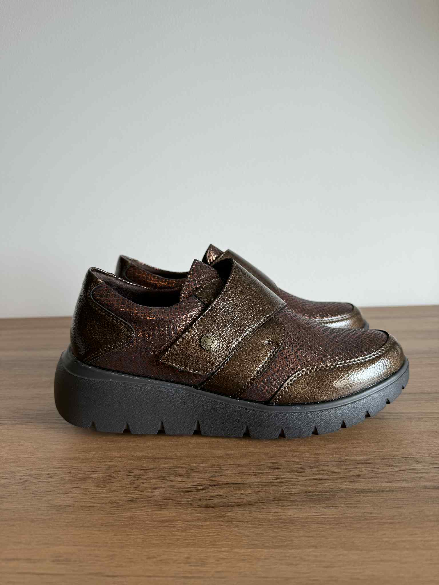 Sapato castanho da marca Virucci, em pele sintética. Com cunha de 4.5cm de altura. Aperta com velcro.
