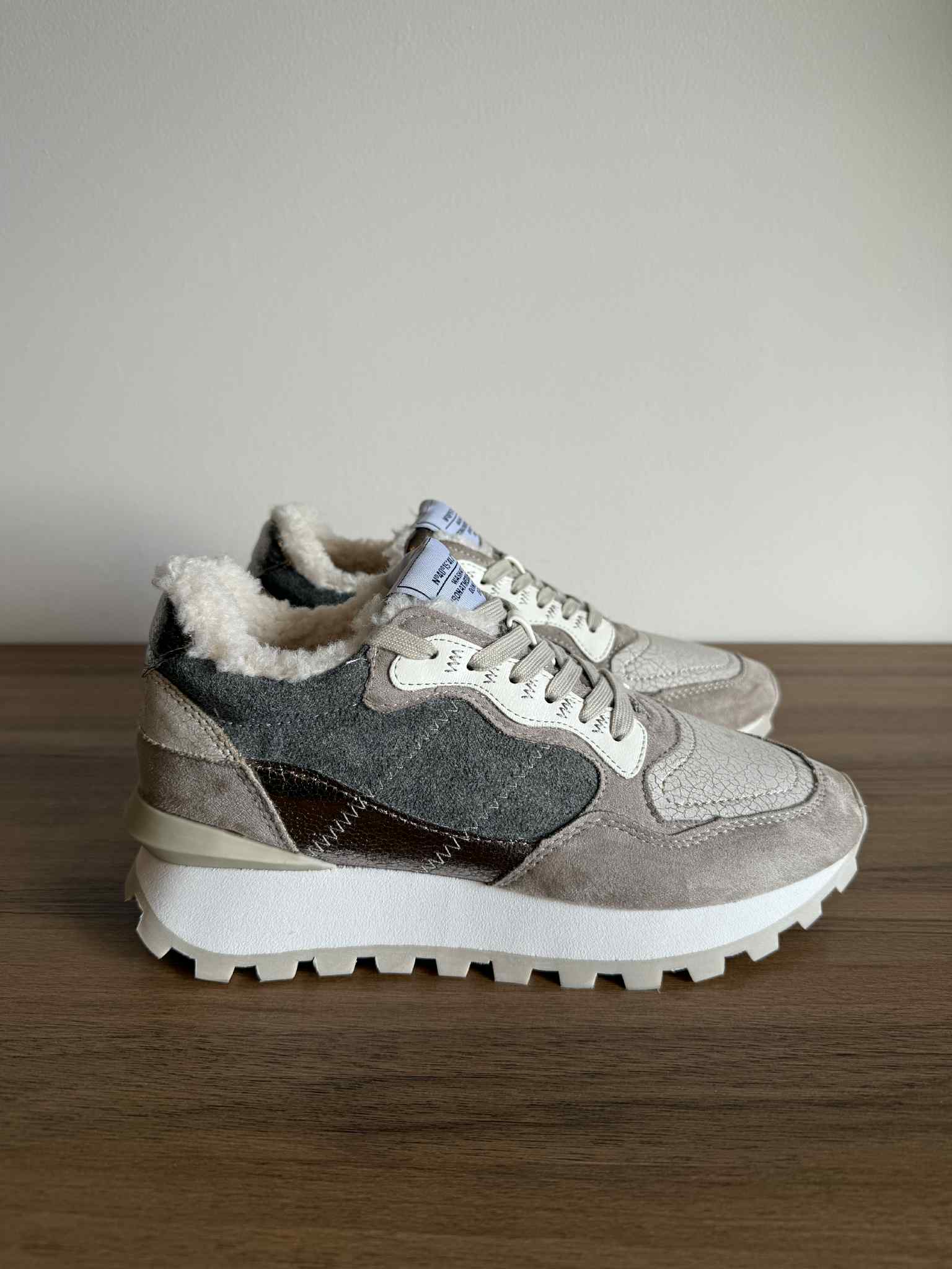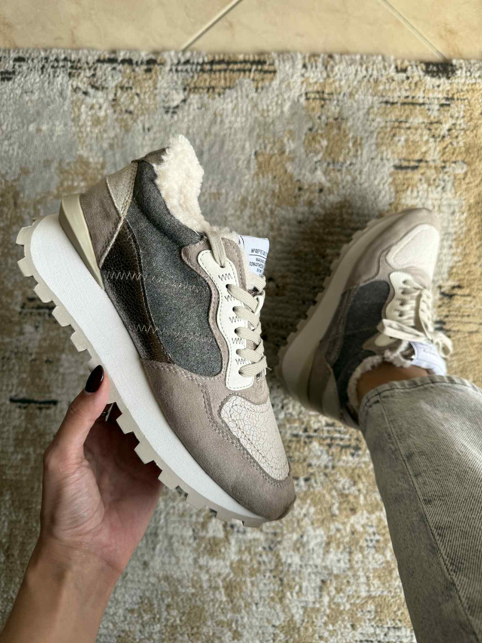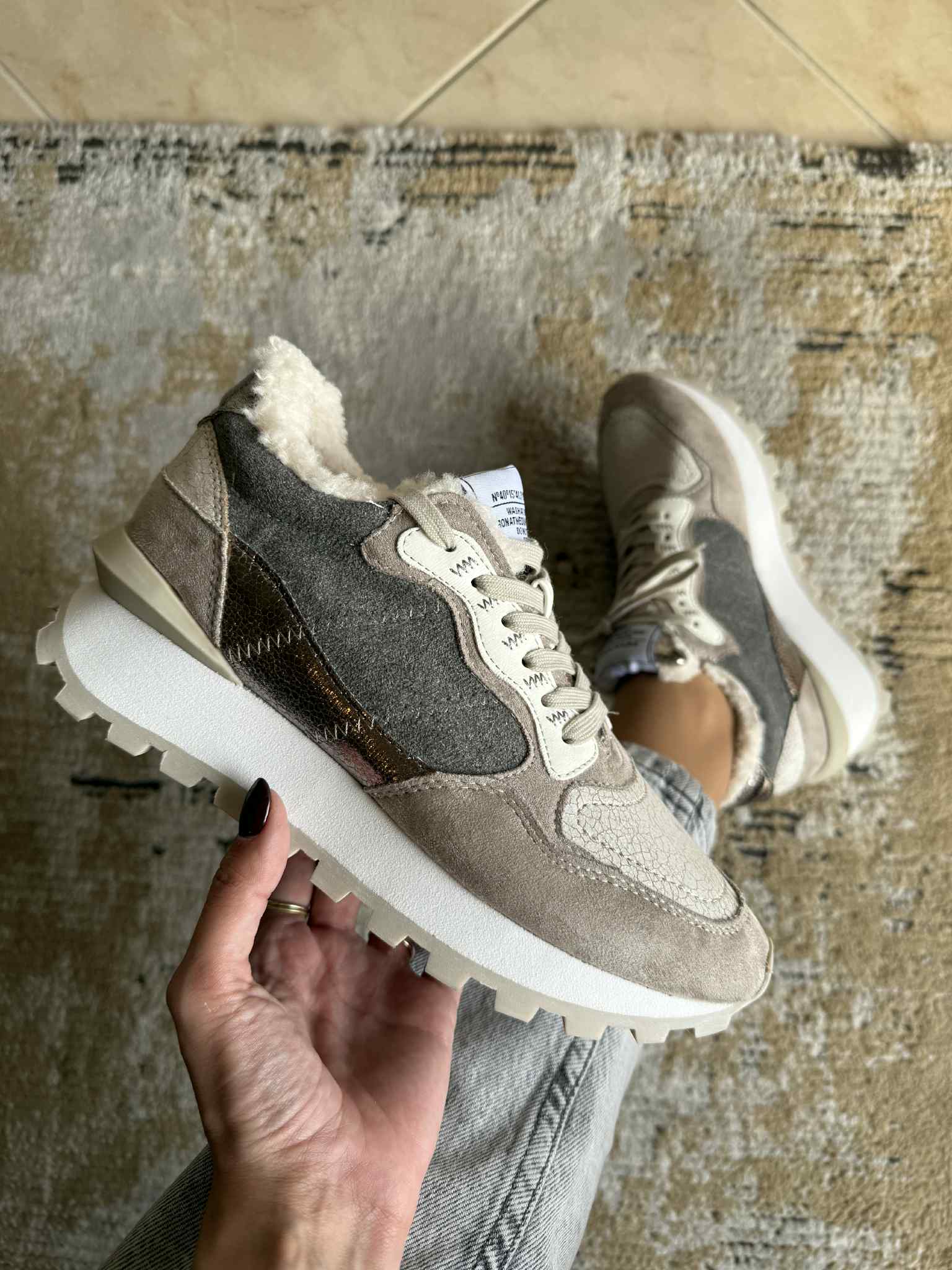 Sapatilha feminina, com sola alta de borracha, da marca Corina. Em camurça e pele sintética. Interior têxtil muito macio e confortável. Detalhe tipo pelo de ovelha.