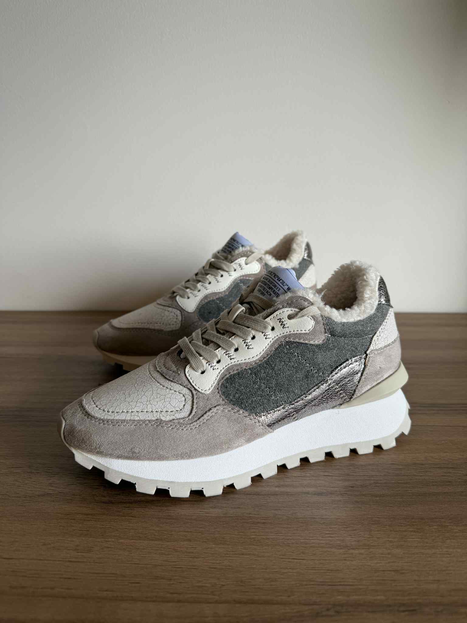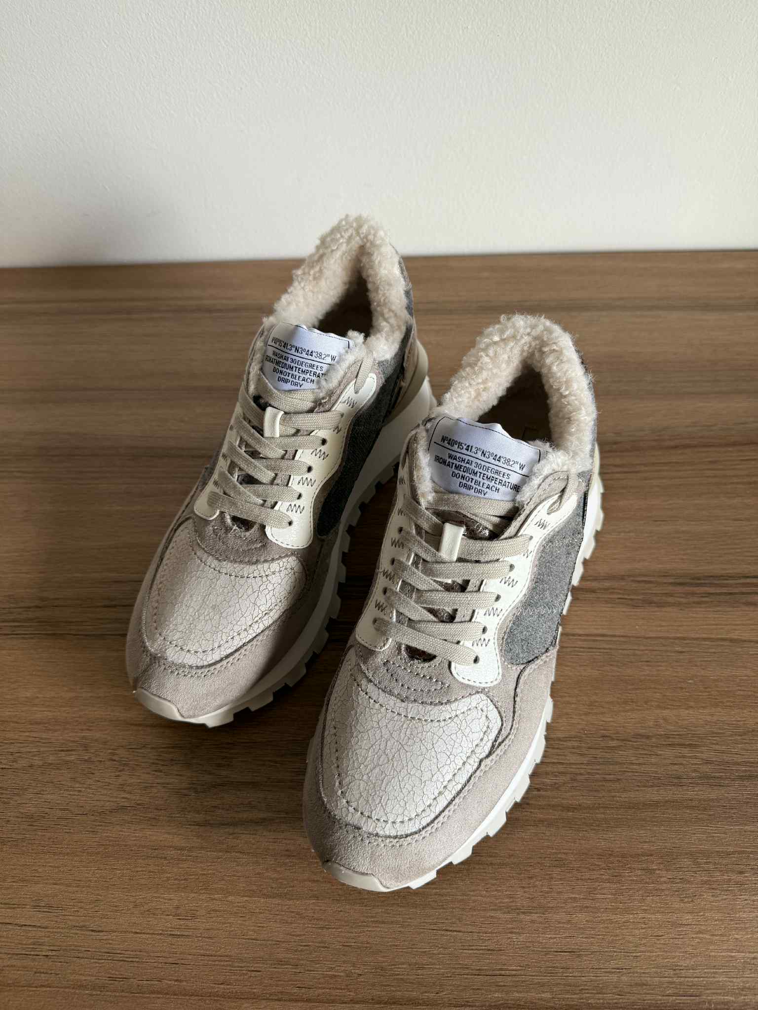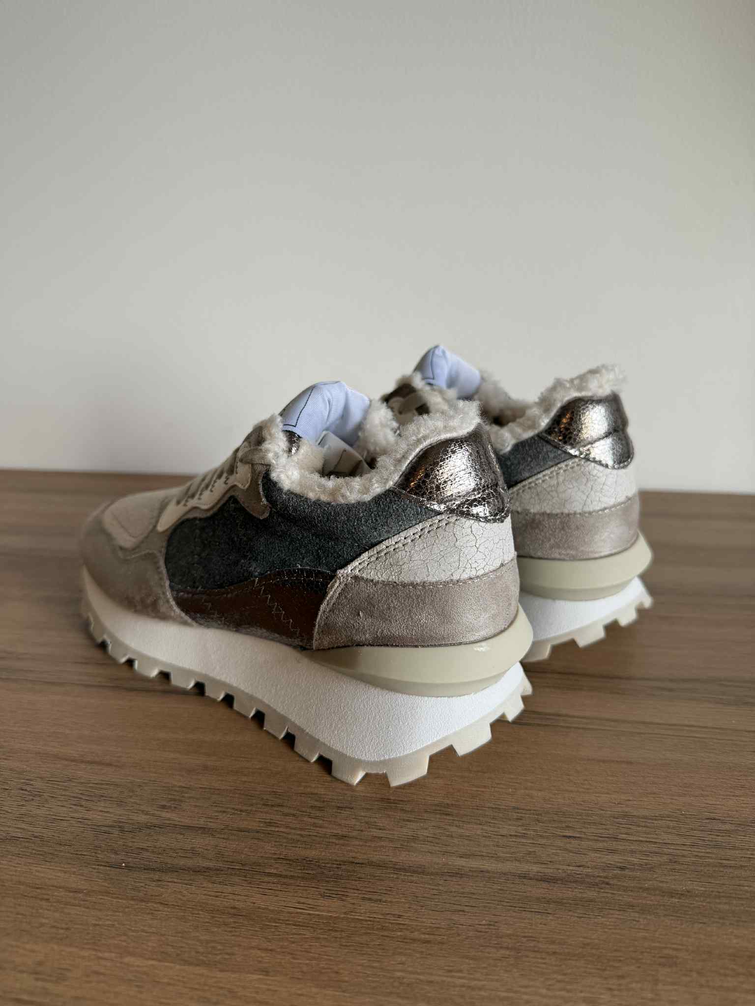 Sapatilha feminina, com sola alta de borracha, da marca Corina. Em camurça e pele sintética. Interior têxtil muito macio e confortável. Detalhe tipo pelo de ovelha.