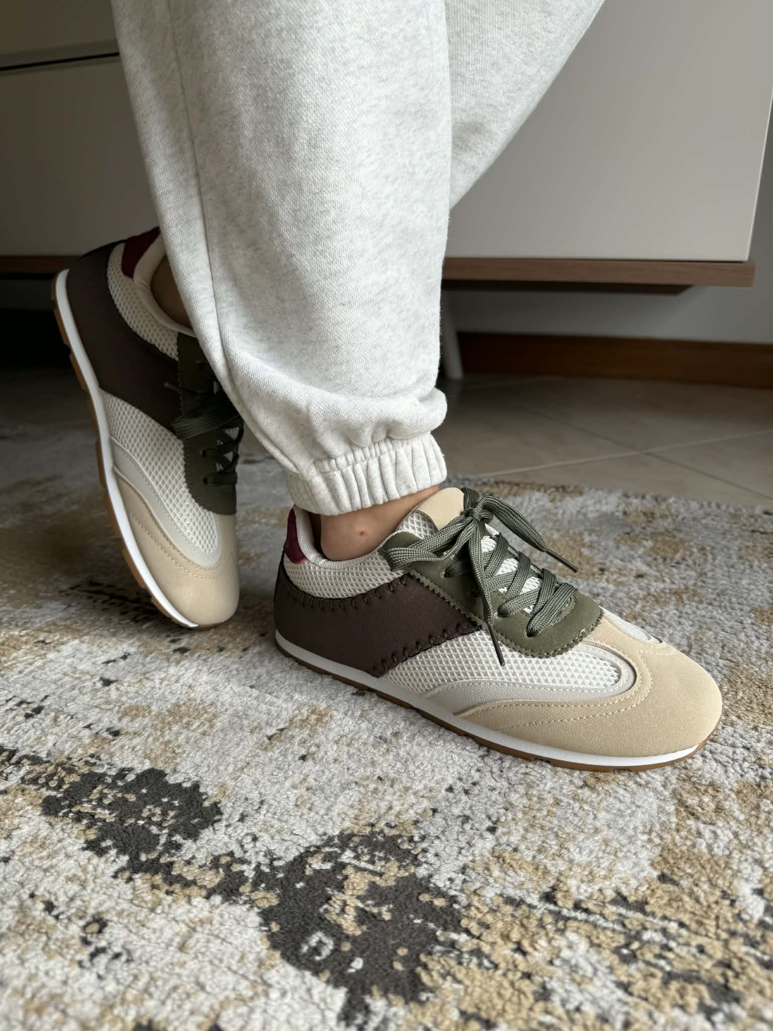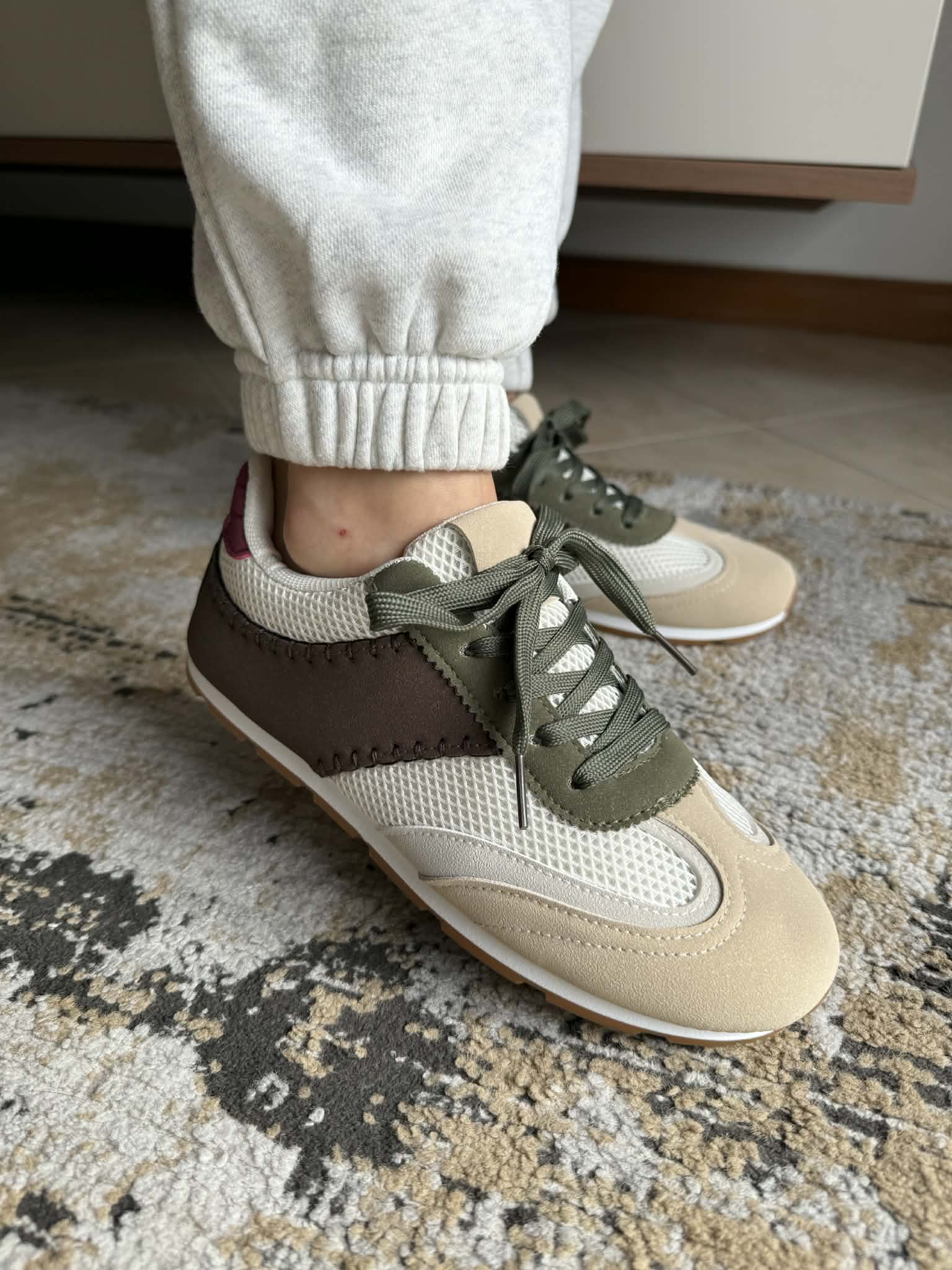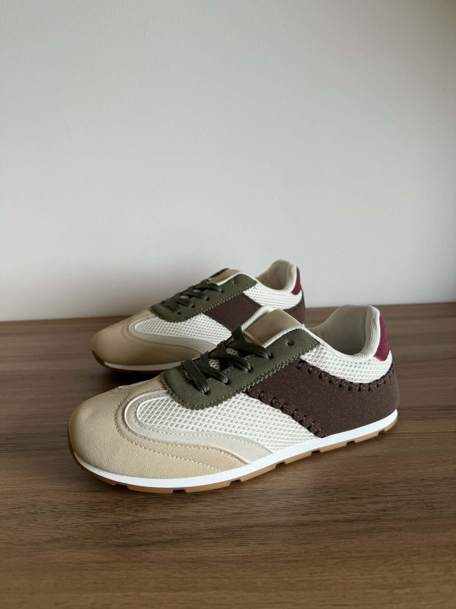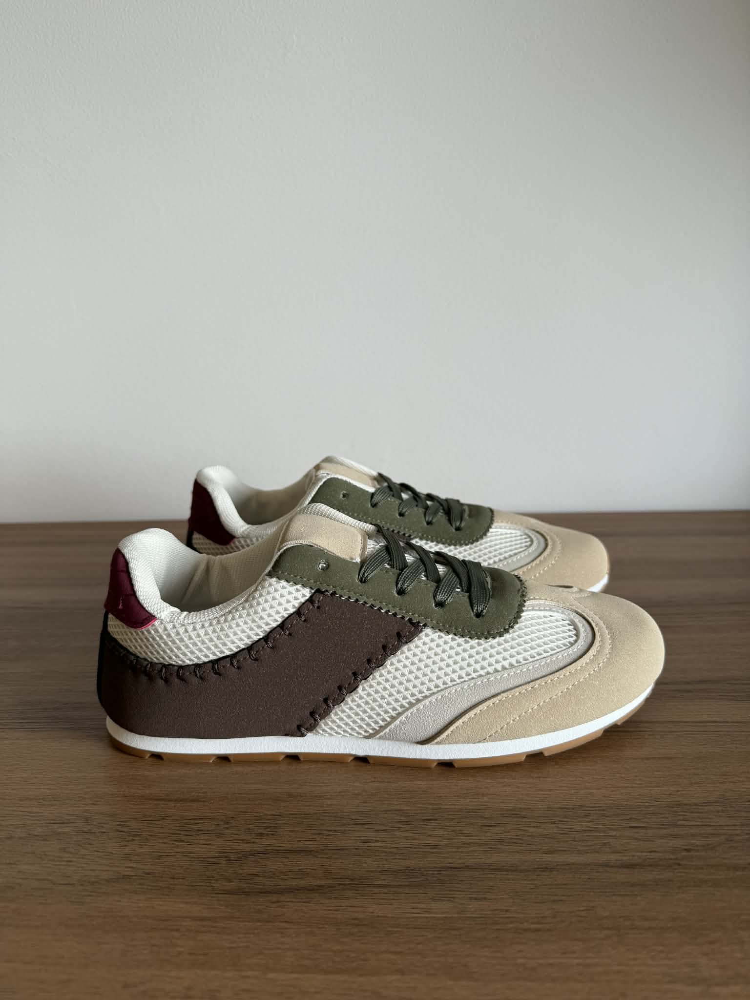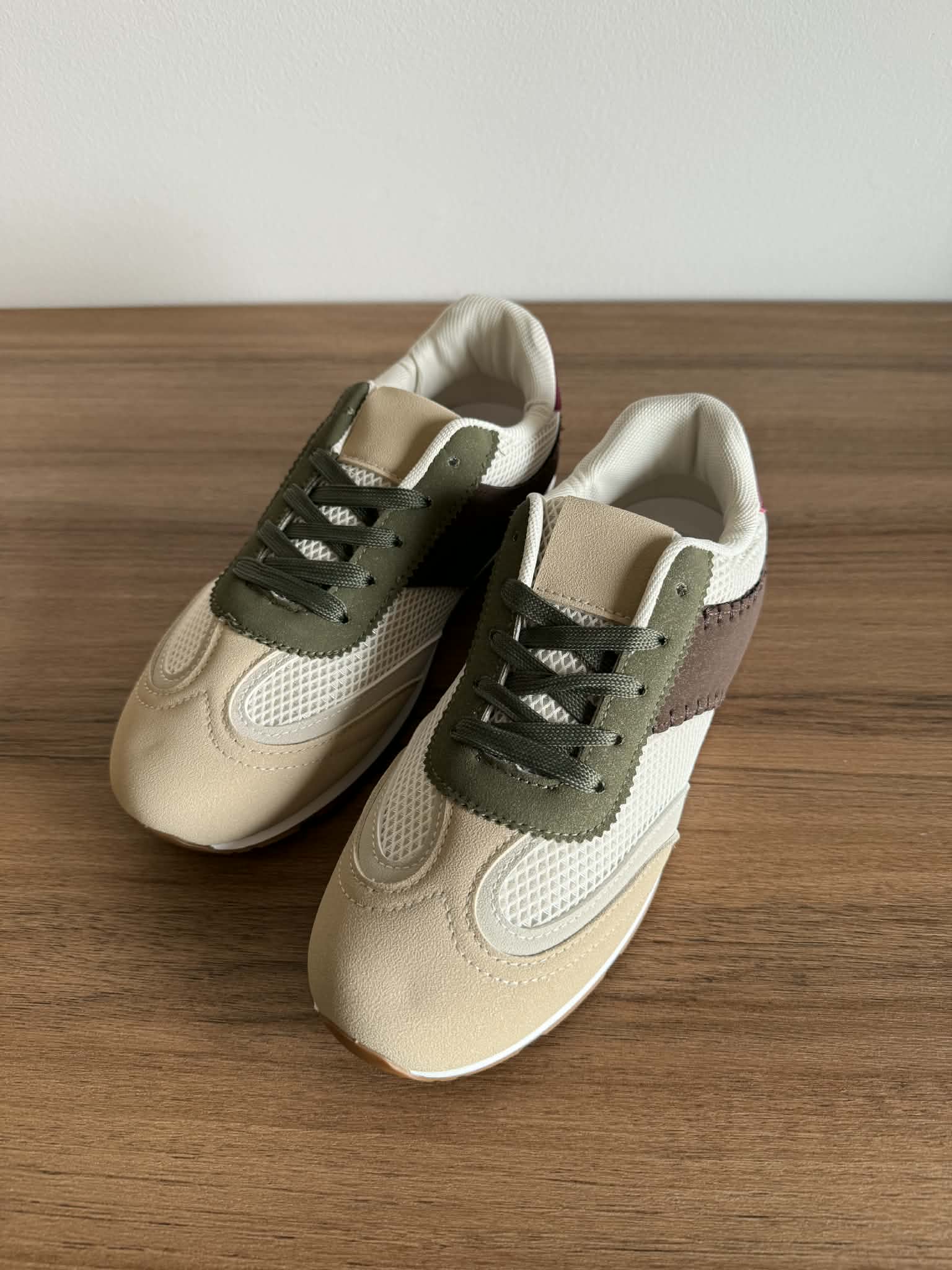 Sapatilha feminina, com sola rasa. Em Multicor (bege, castanho, branco, verde). Com atacadores. Em rede e pele sintética.