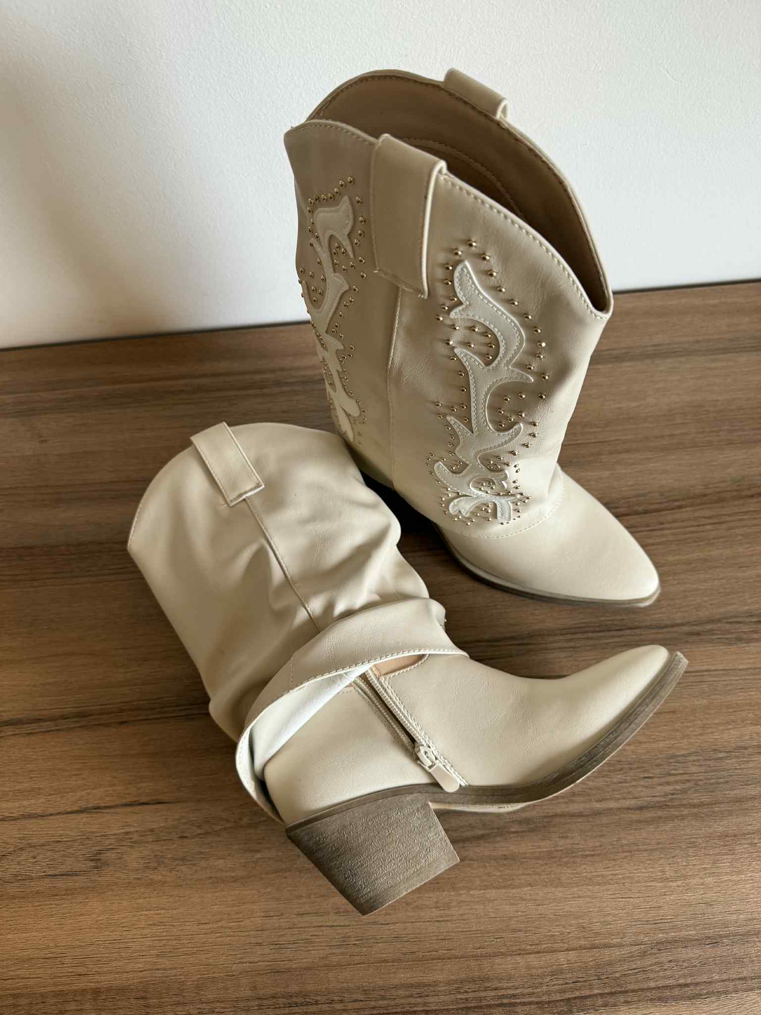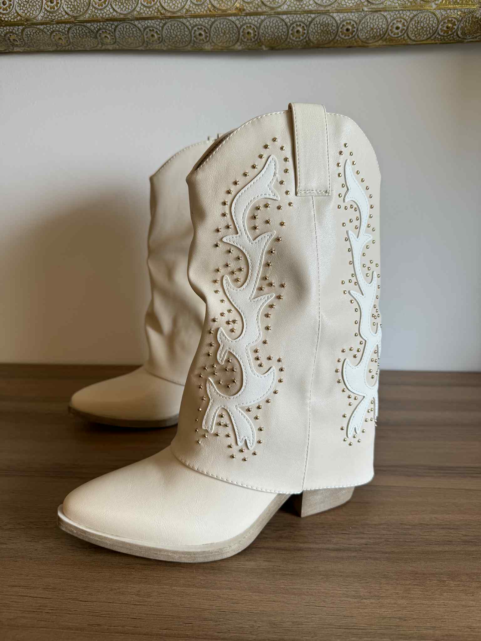 Bota estilo texana, com detalhes a branco e tachas douradas. Em pele sintética, tem fecho. Com salto largo de 6cm de altura.
