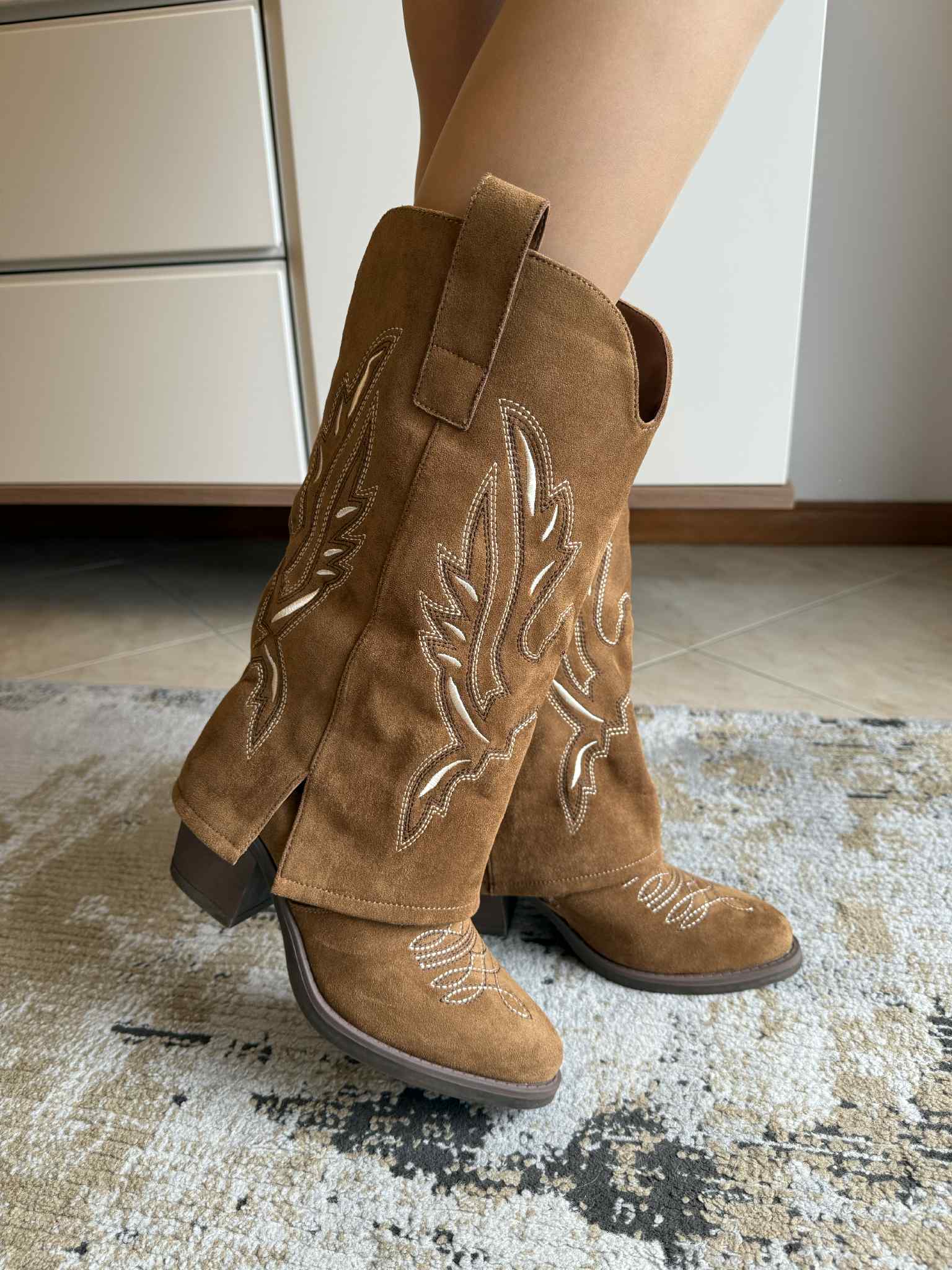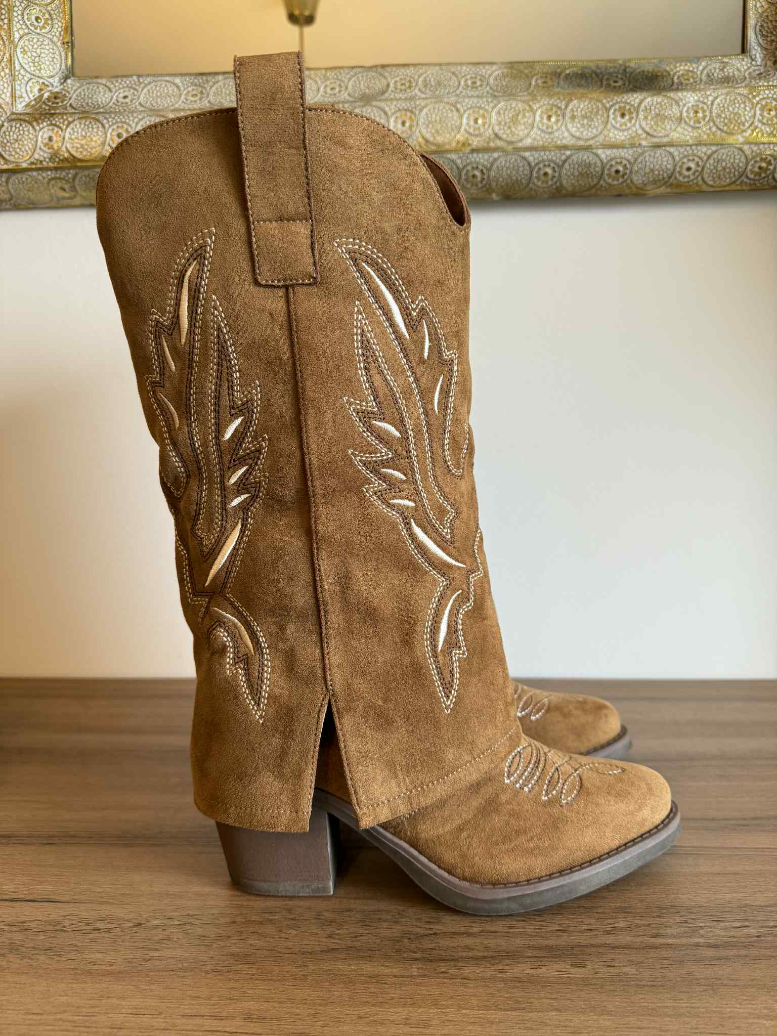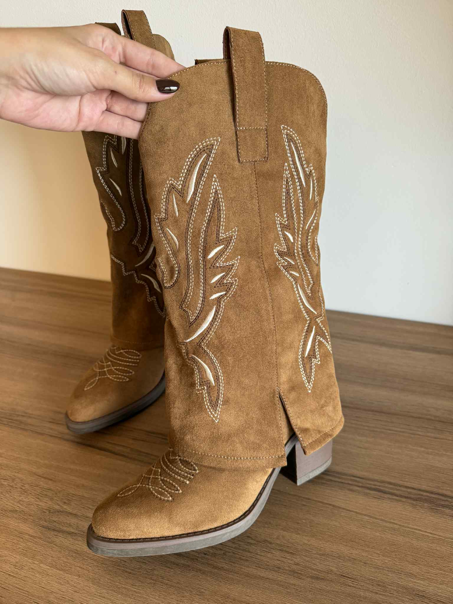 Bota estilo texana, com cano efeito dobrado, tipo calça. Com fecho. Em camurça sintética. Tacão largo com 7cm de altura.