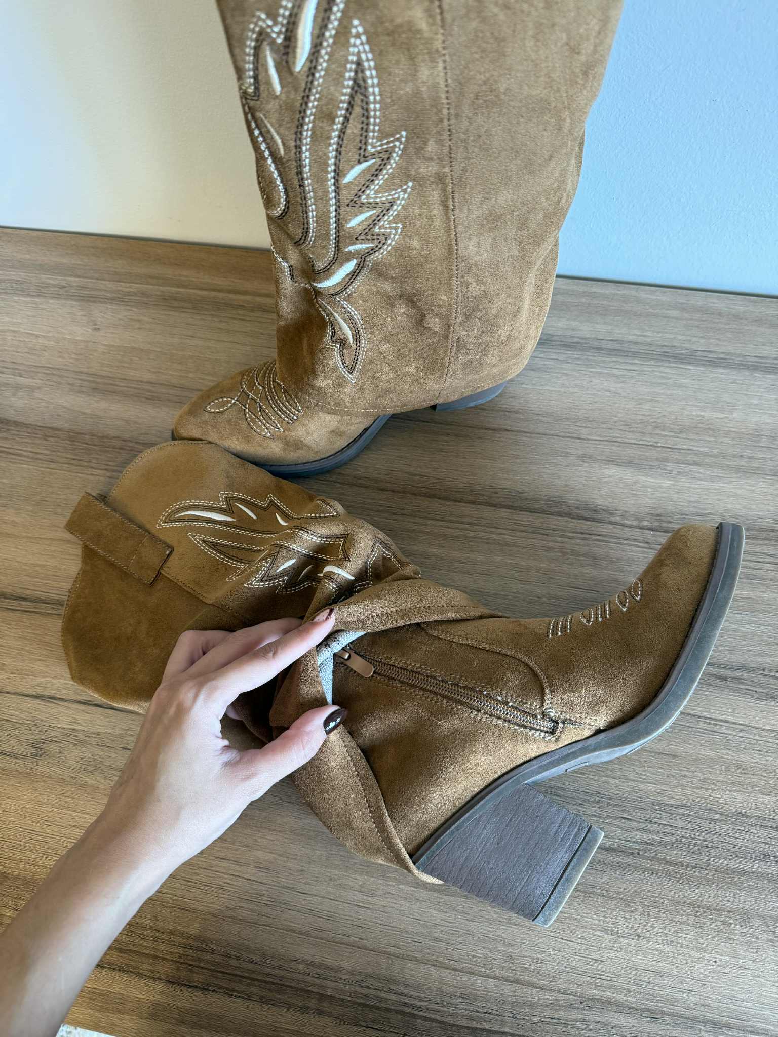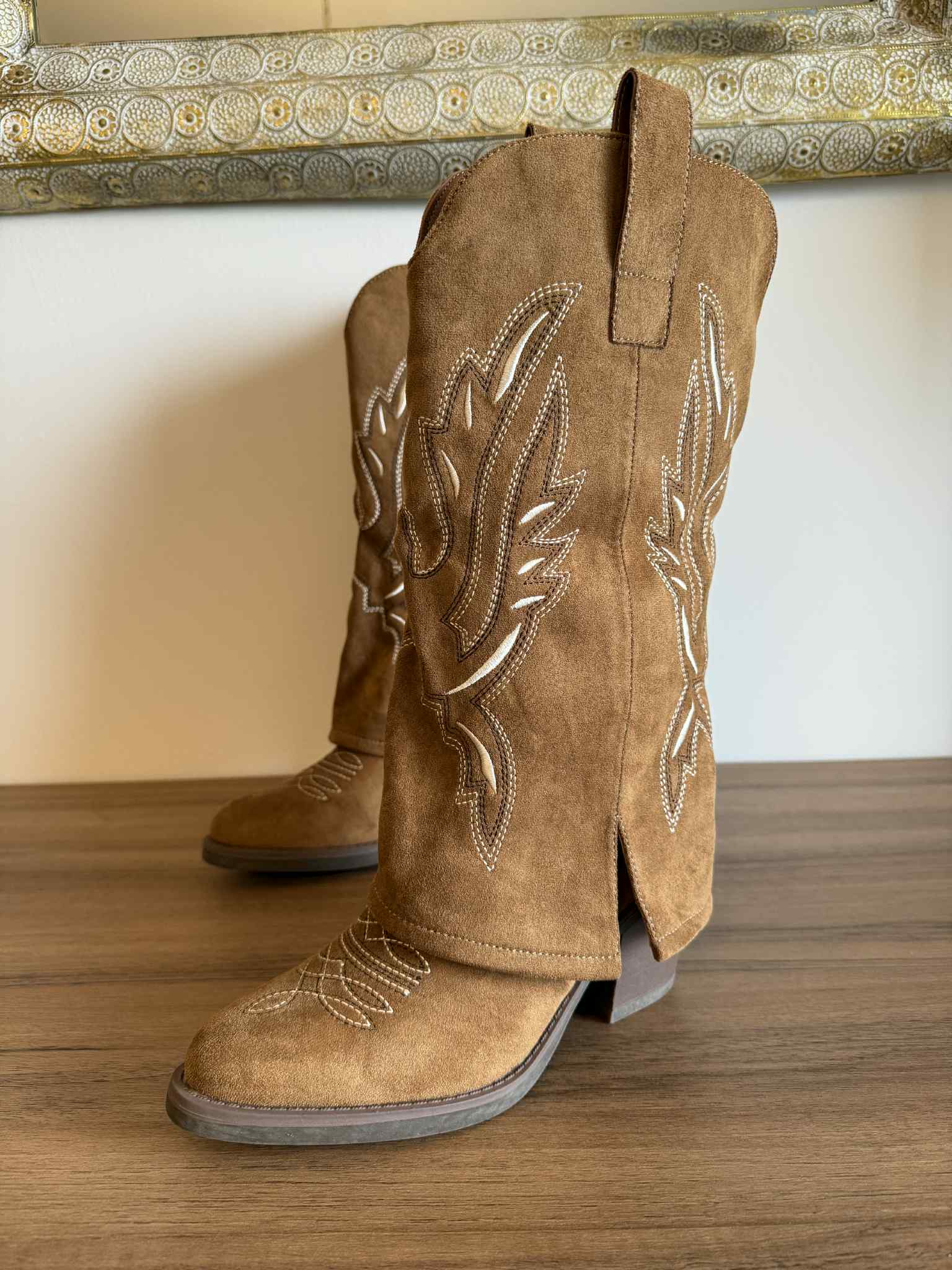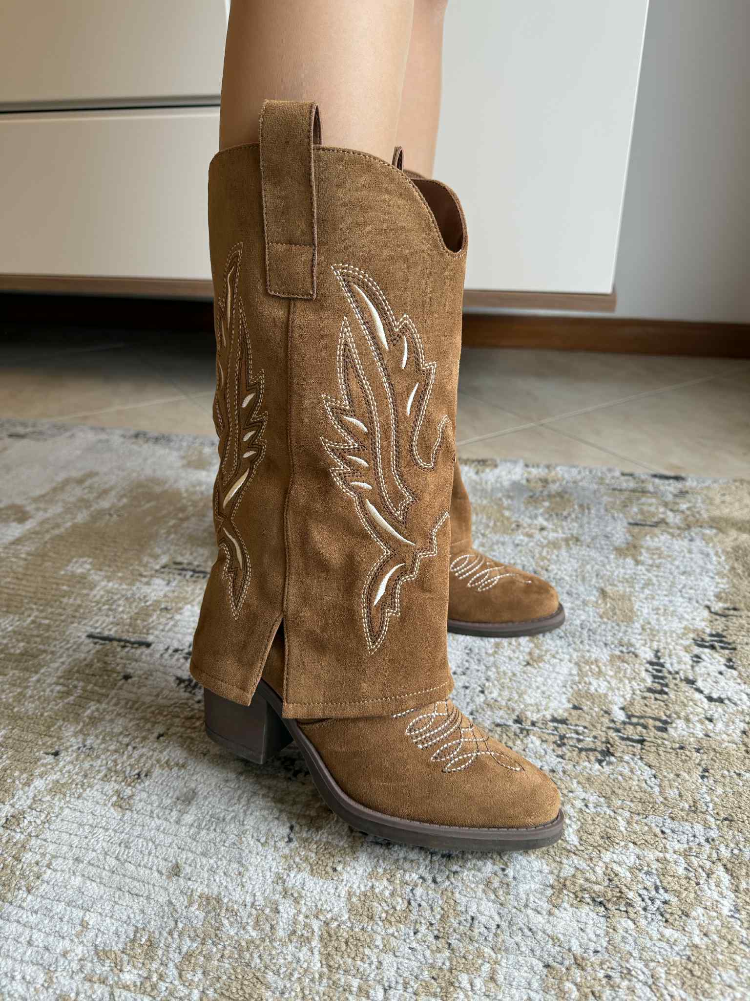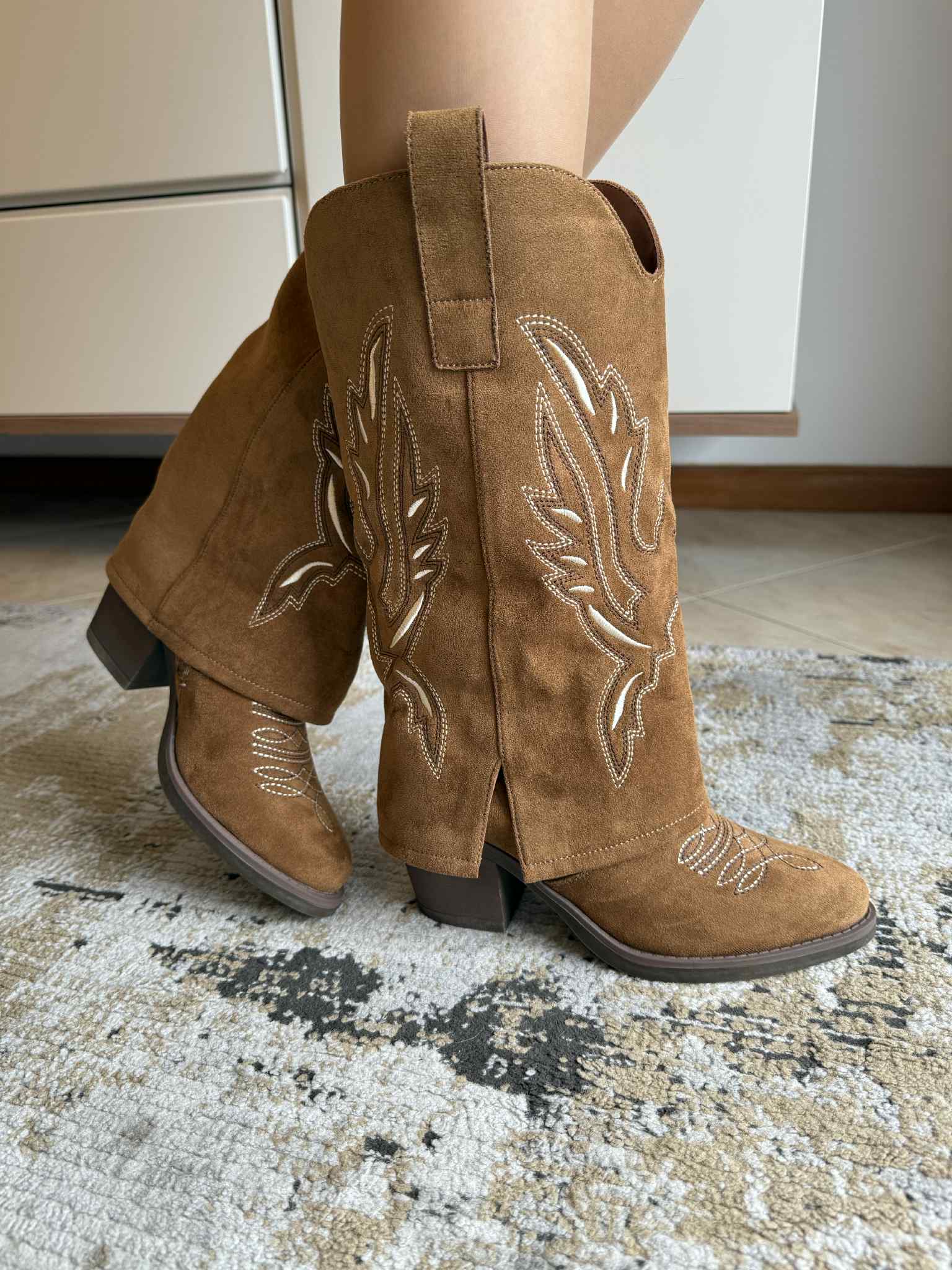 Bota estilo texana, com cano efeito dobrado, tipo calça. Com fecho. Em camurça sintética. Tacão largo com 7cm de altura.