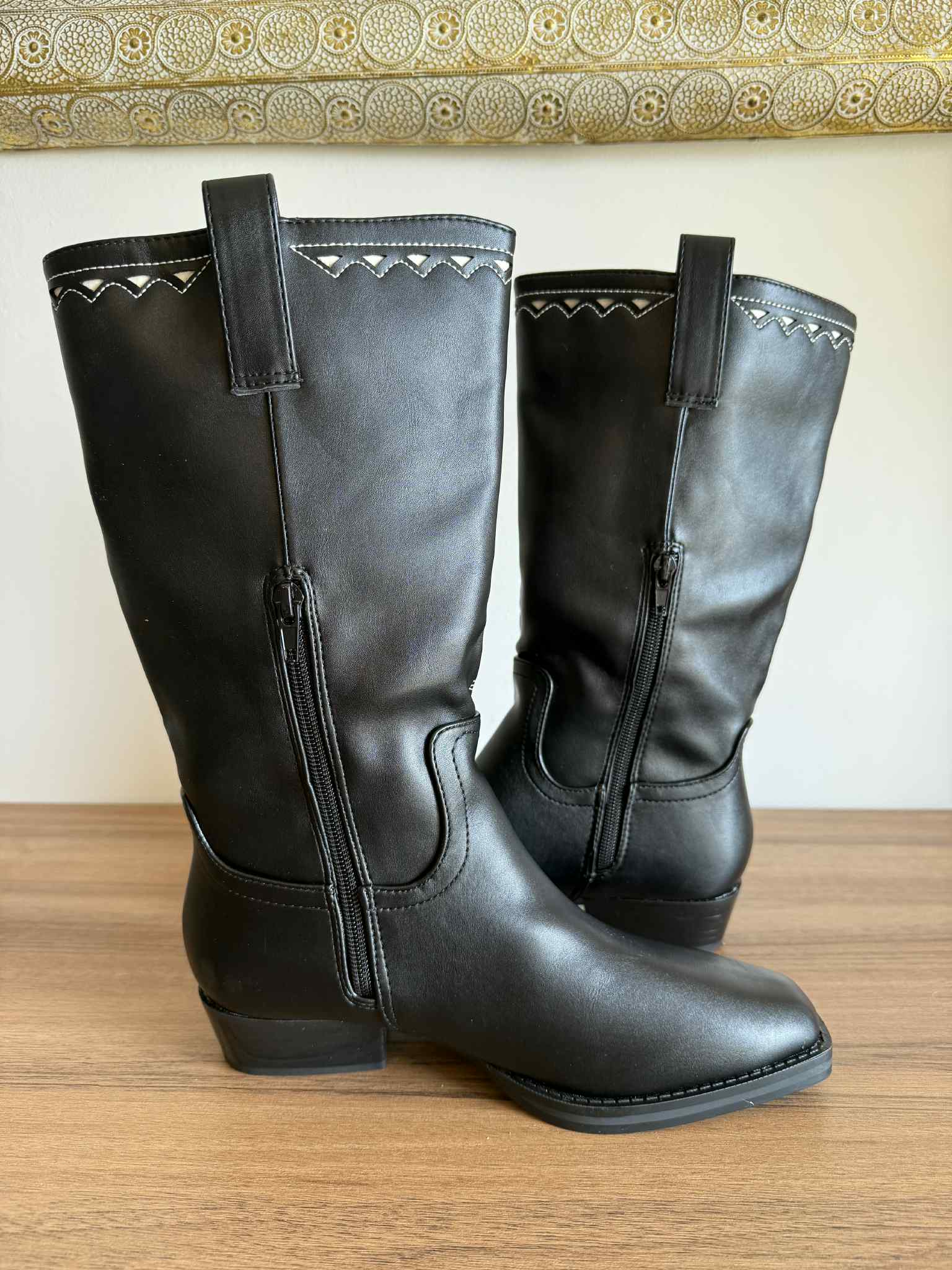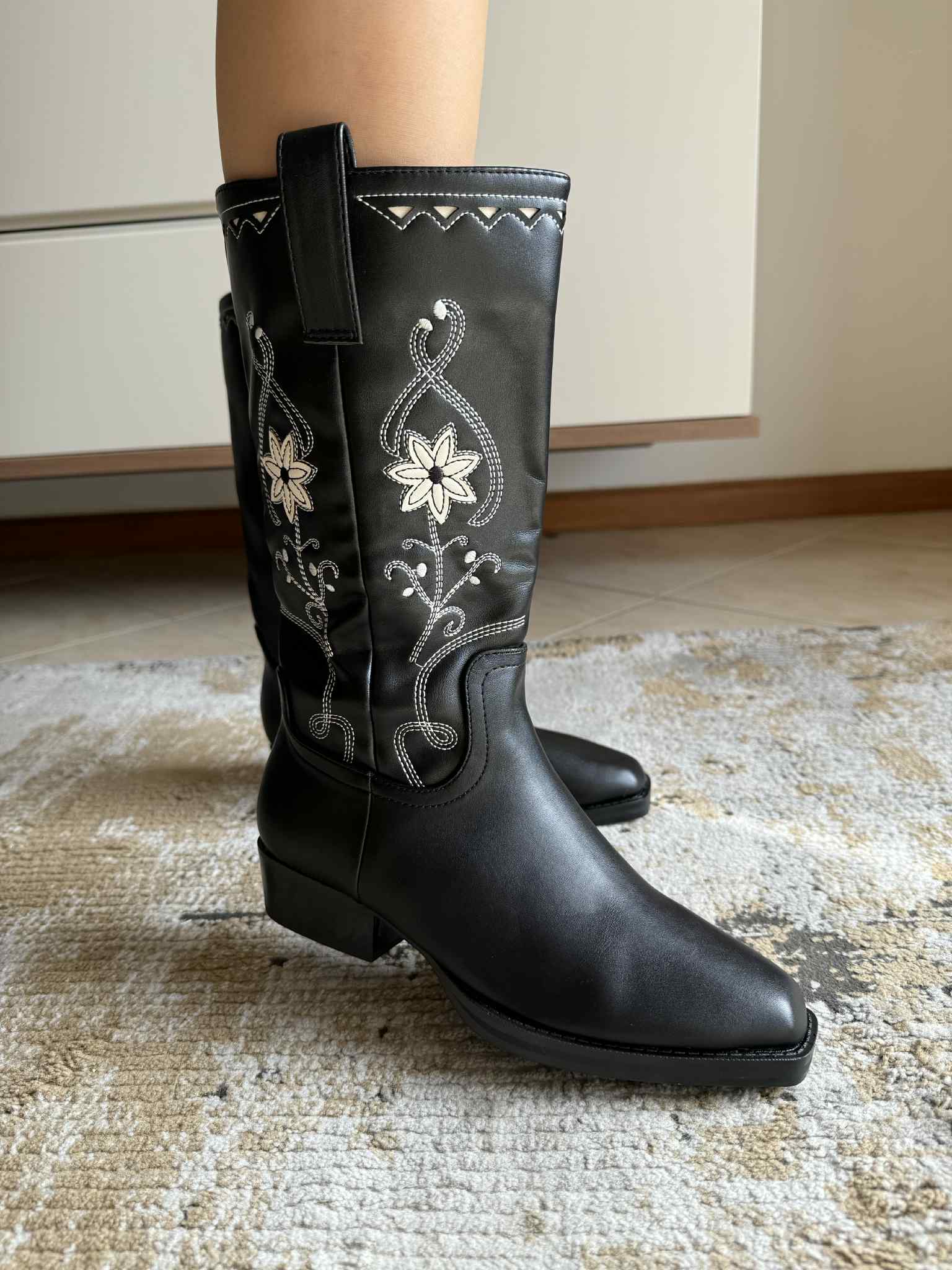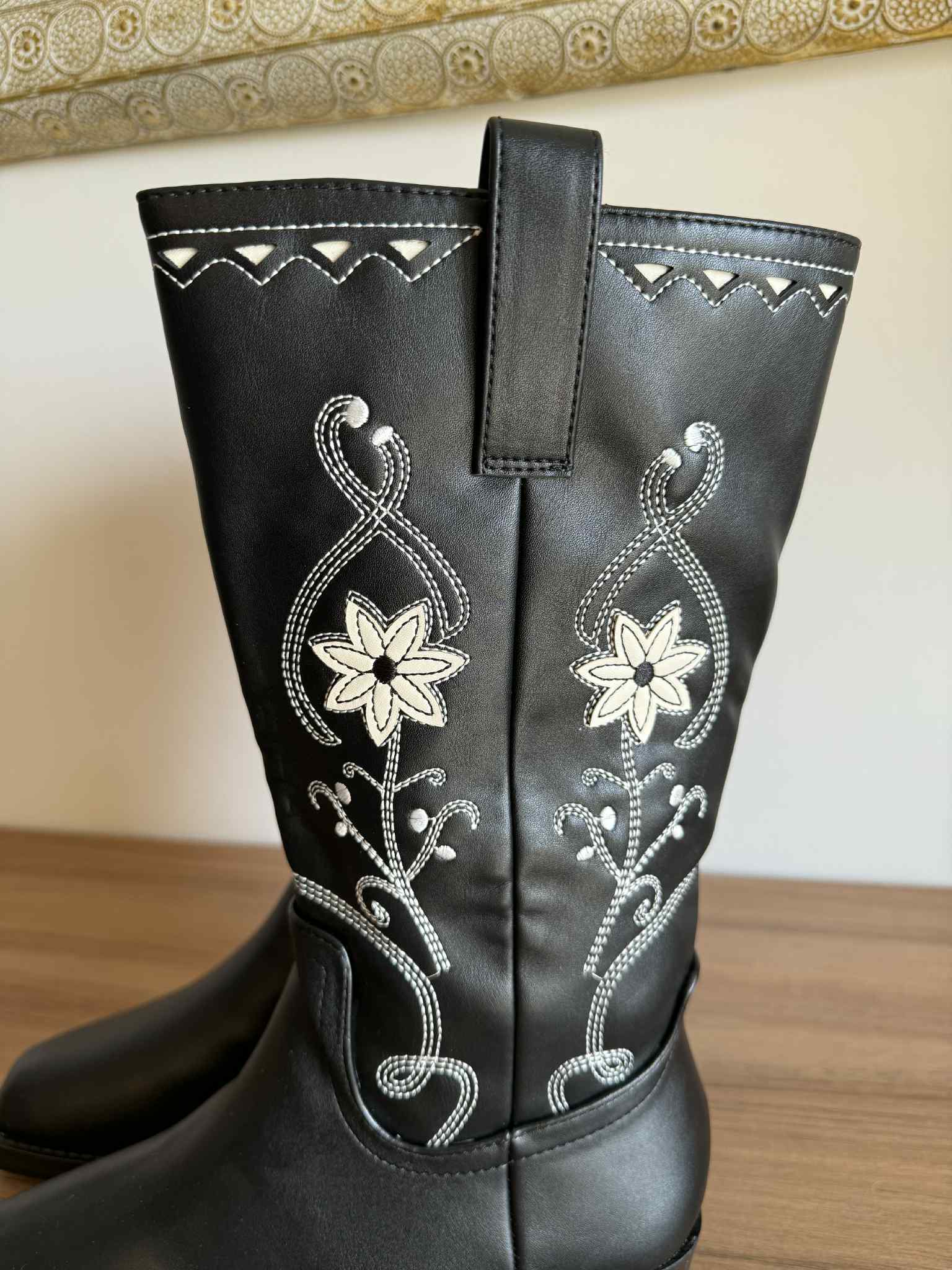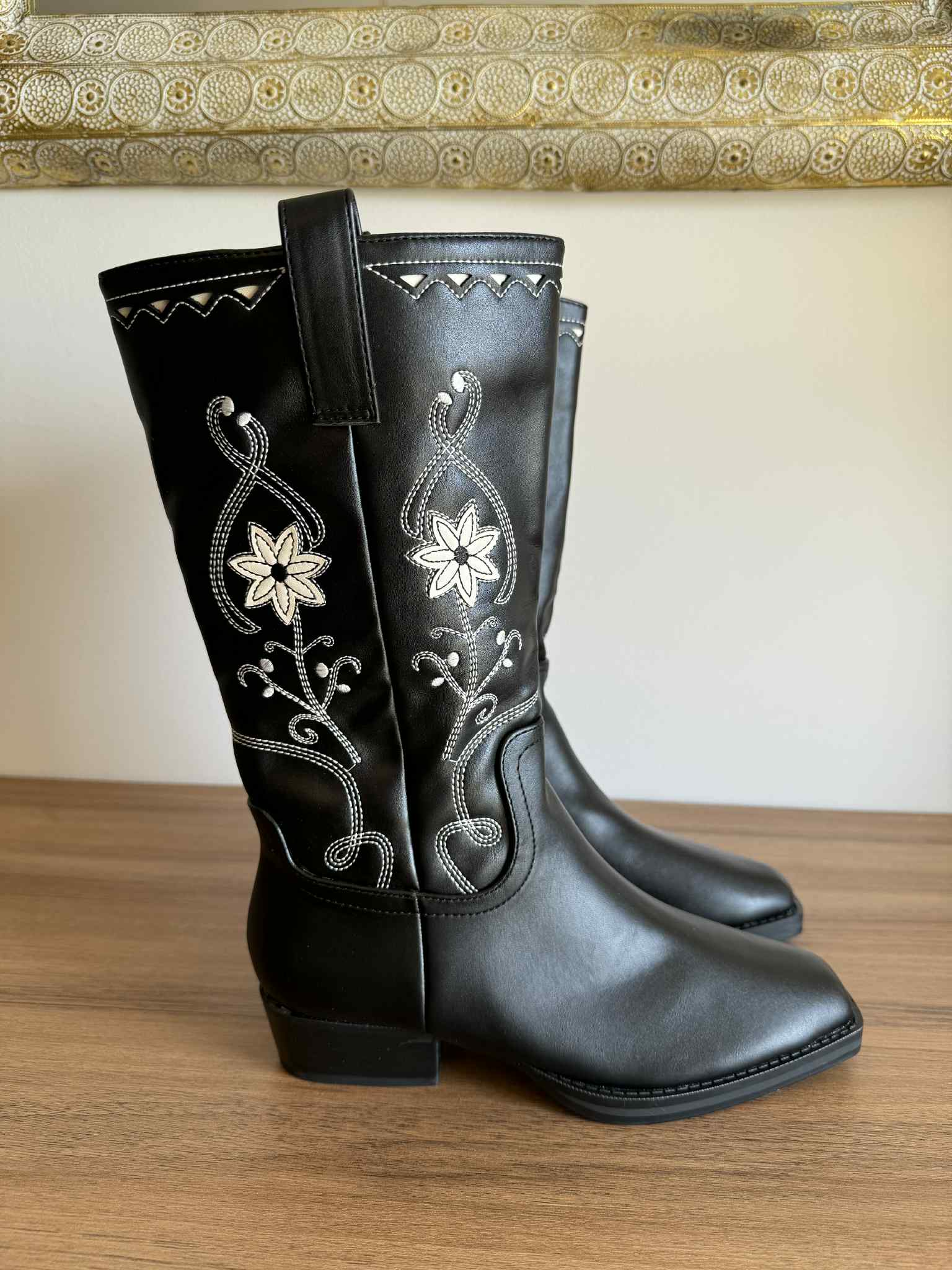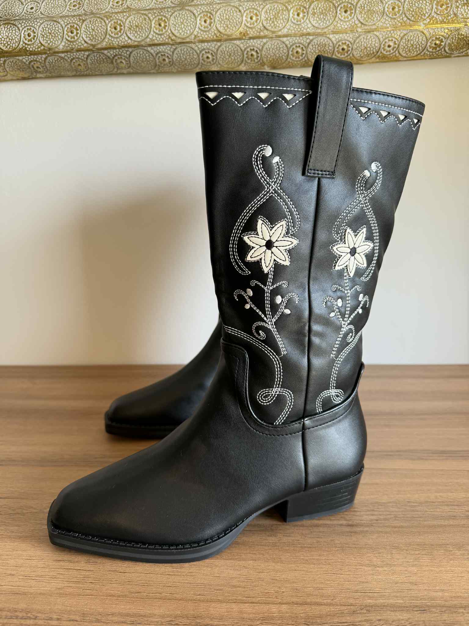 Bota estilo texana, em pele sintética. De cano alto com detalhes bordados. Frente quadrada. Tacão largo com 3.5cm de altura. Tem fecho.