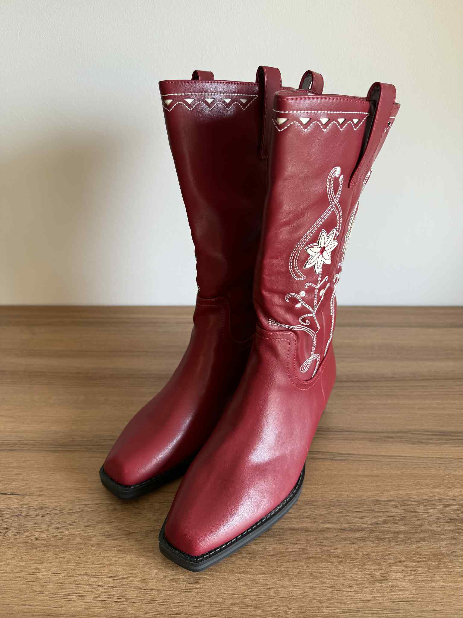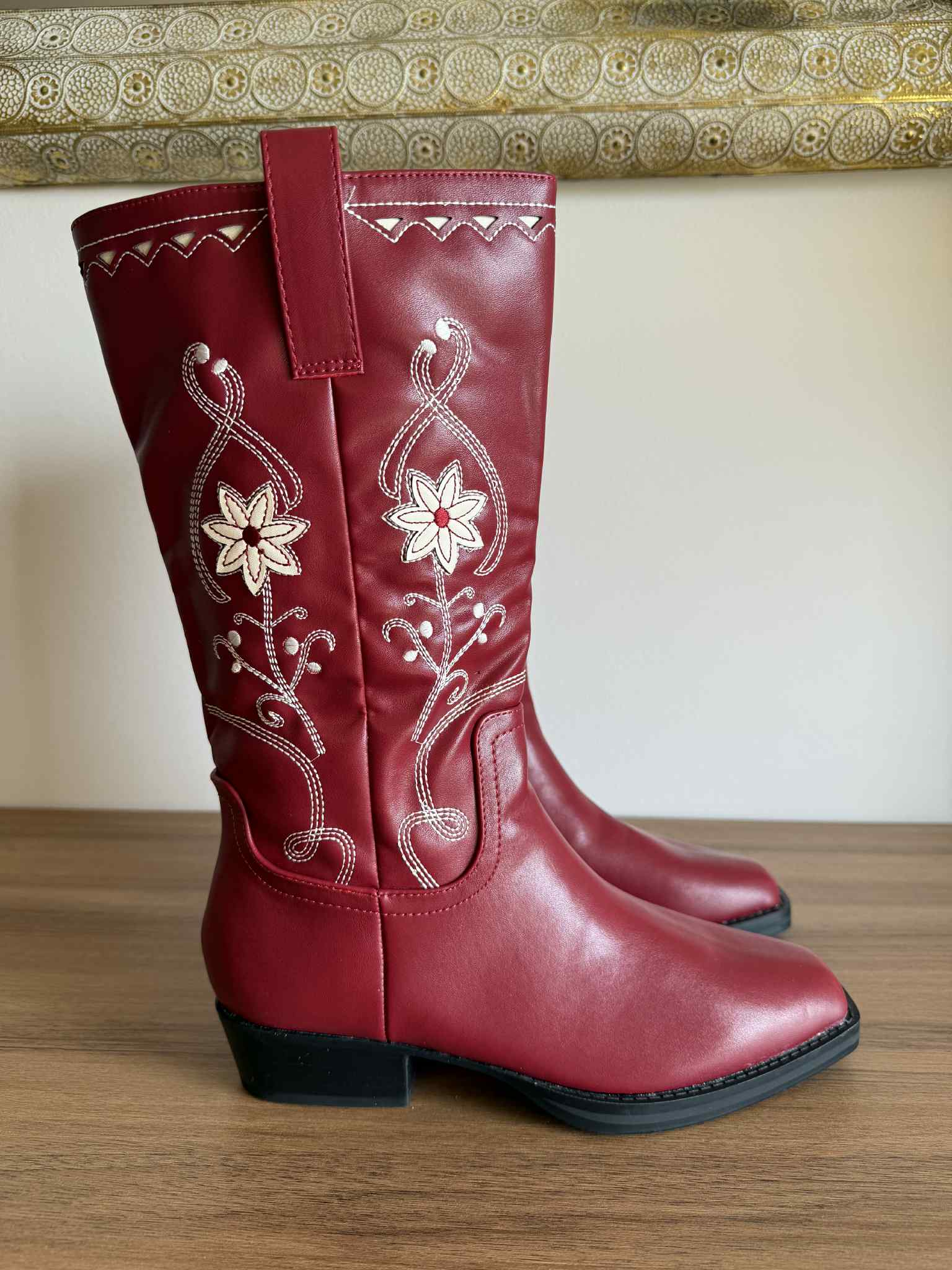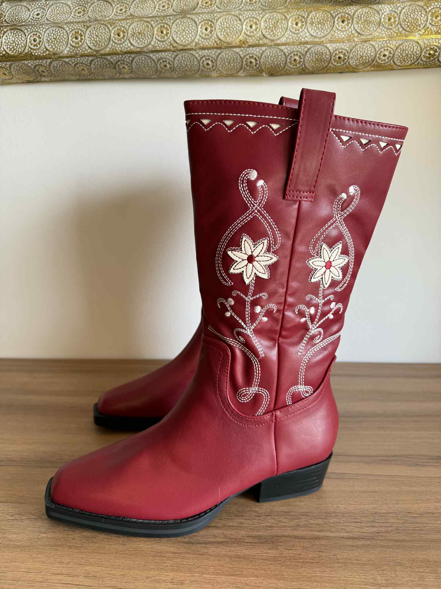 Bota estilo texana, em pele sintética. De cano alto com detalhes bordados. Frente quadrada. Tacão largo com 3.5cm de altura. Tem fecho.